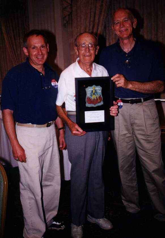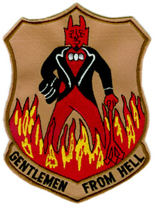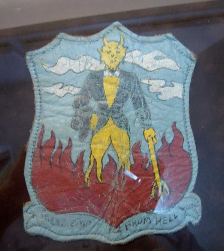 The above is a modern replica of the "Gentlemen from Hell" patch that was worn by some of the original crew of the 487th Bomb Group (H). The re-discovery of the patch occurred because of the work of Bob Jacobs, son of Jimmy Jacobs (navigator with the 836th squadron). Until the 1999 reunion, no original patches had come to light. But at that reunion, in 2 separate conversations, both Gerry Ogle, son of George Ogle (flight engineer with the 837th squadron) and I heard from Ed Wilkowski that he had his old patch. By the time of the 2000 reunion, Ed had presented Gerry with his patch, and Gerry had it elegantly framed for preservation. The photos below are of Bob Jacobs - left, Ed Wilkowski (837th squadron, and George Ogle's copilot) - center, and Gerry Ogle - right, all proudly displaying Ed's patch. The other photo is a close up of the patch.