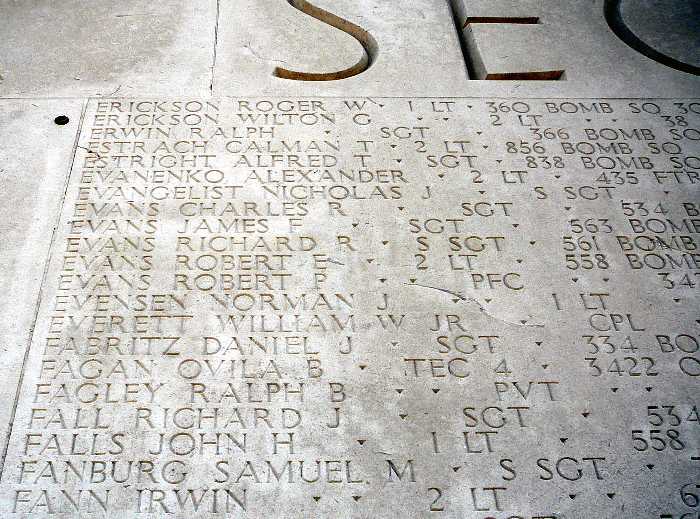 Sgt. Alfred T. Estright, 838th Squadron, MIA 29-May-1944 Commemorated on the Wall of the Missing, Cambridge American Cemetery (photo provided by Paul Webber)