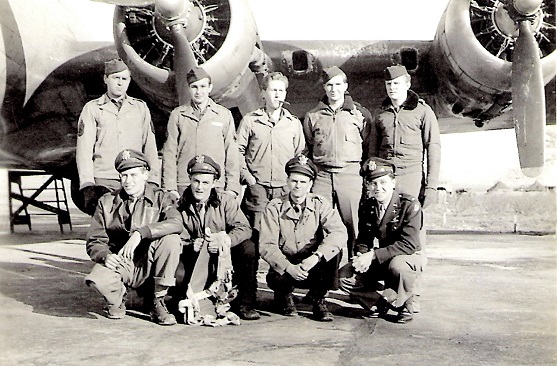 Back Row L to R: T/Sgt Dale A. Perry (engineer), S/Sgt James E. Kelly (ball turret), Sgt Ansel "Jack" Byers (radio operator), Sgt Richard V. Drummond (waist gunner), Sgt Robert F. Gaines (tail gunner)