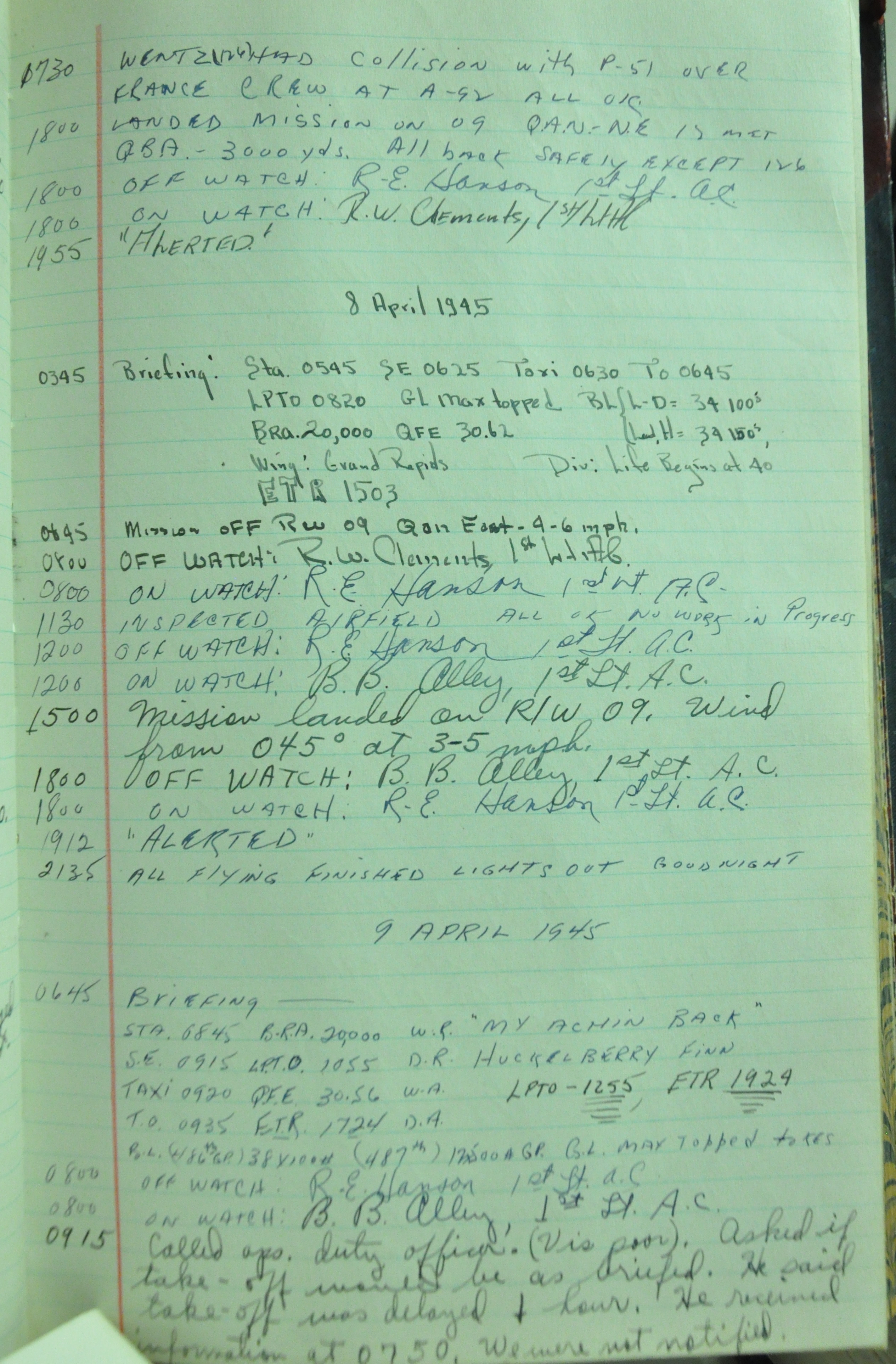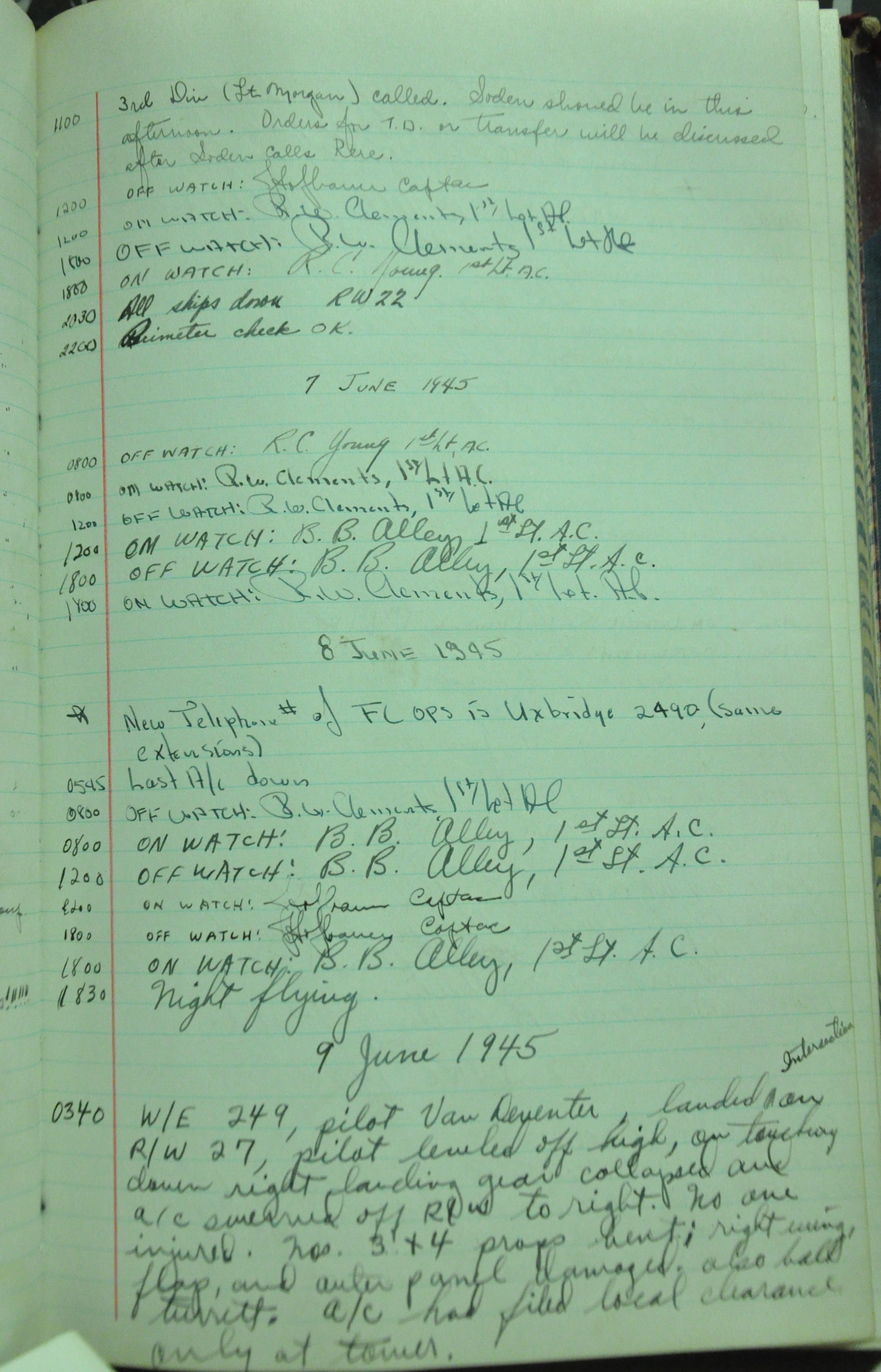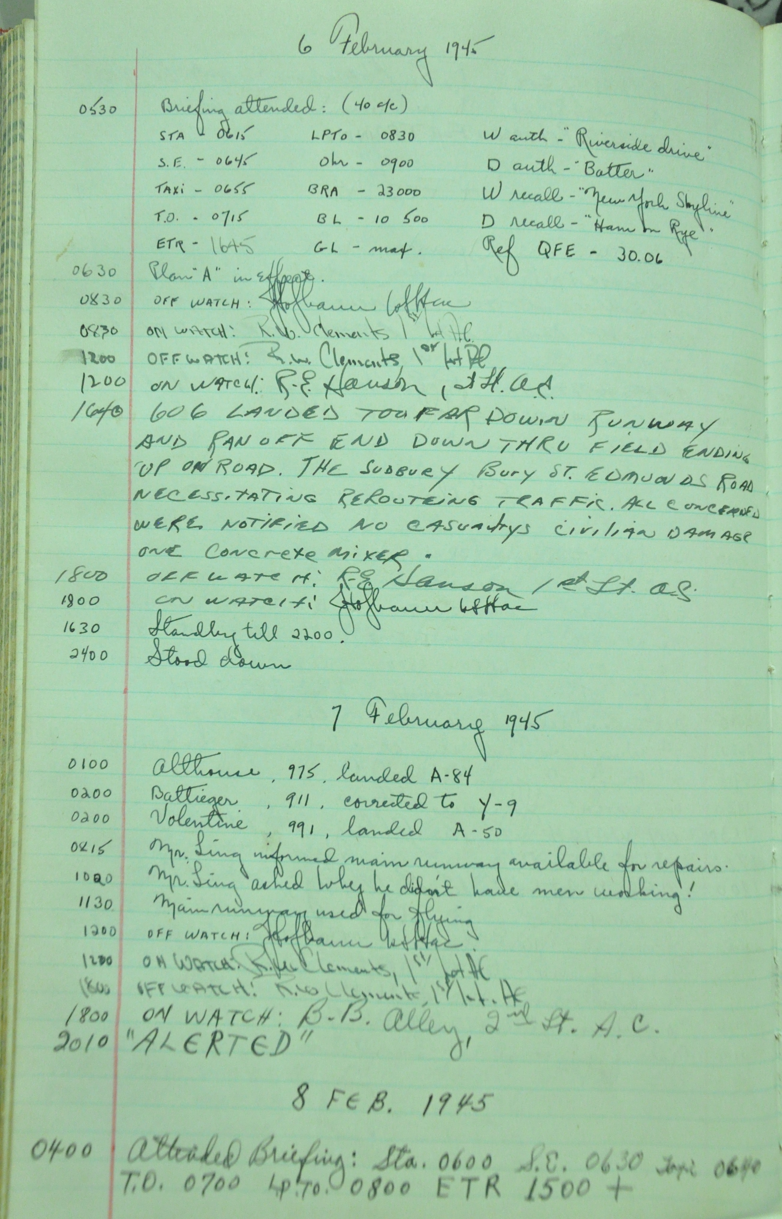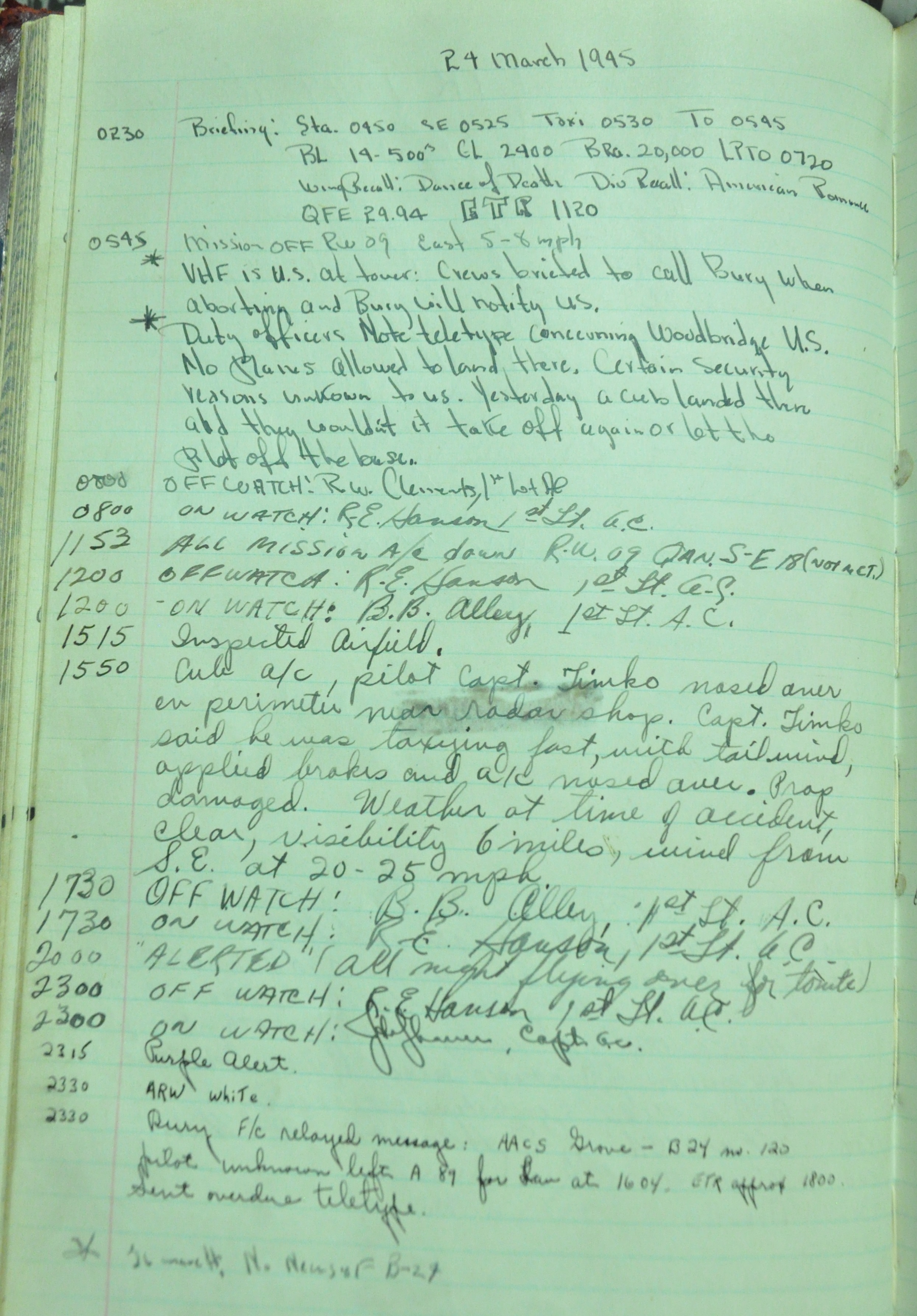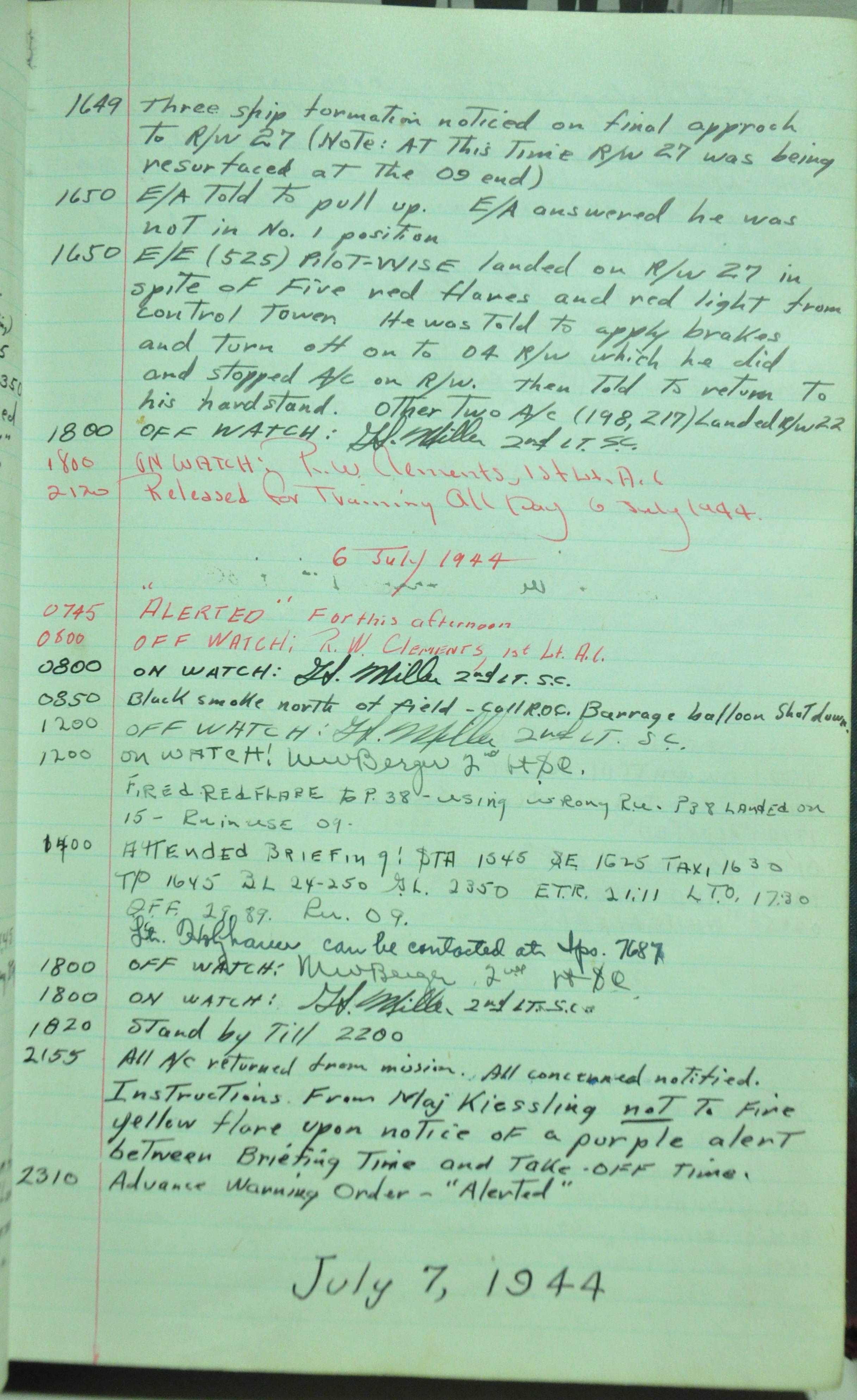 the pages of the 487th Tower Log book that is at the museum. It contains notes by the control tower officers relative to operations