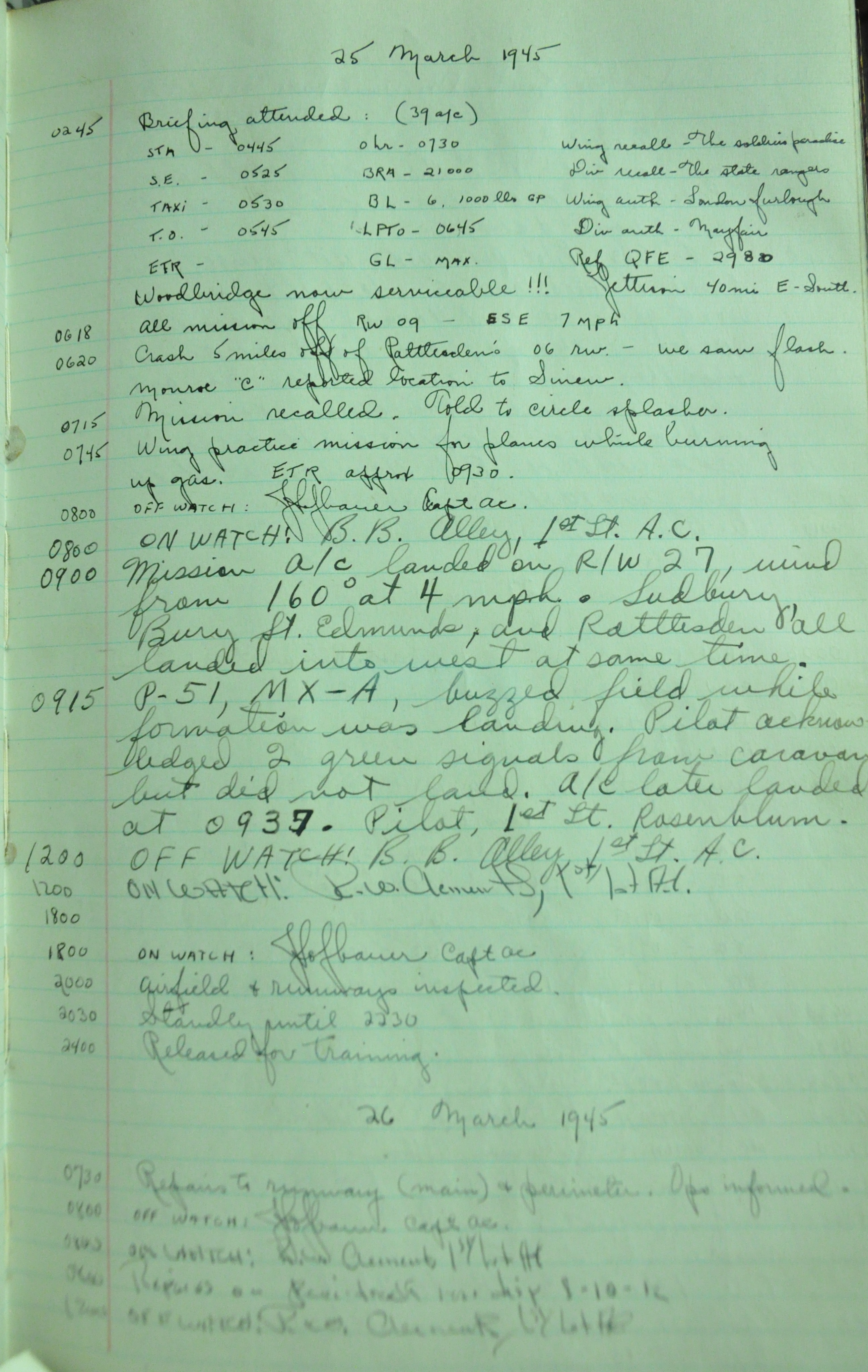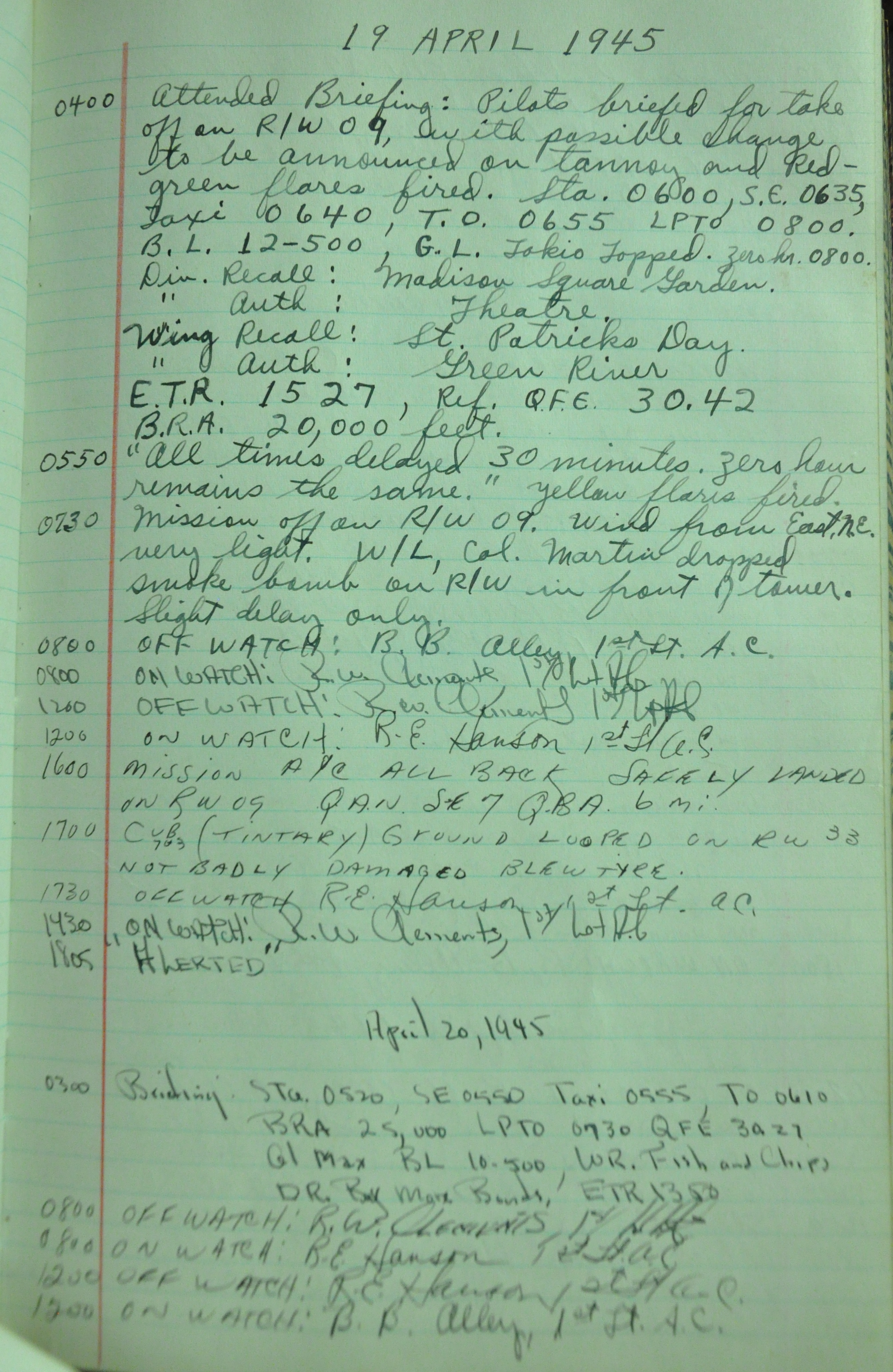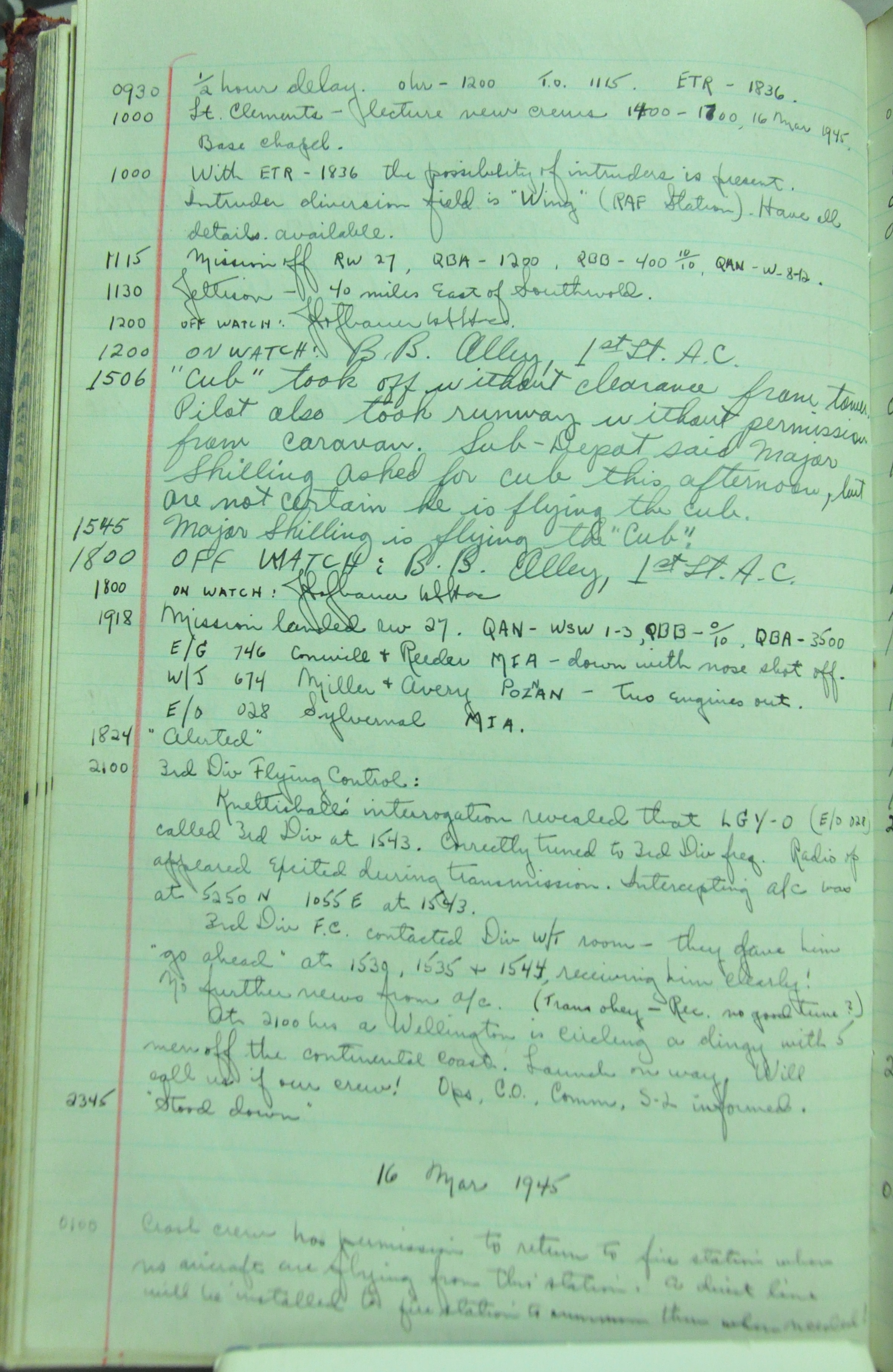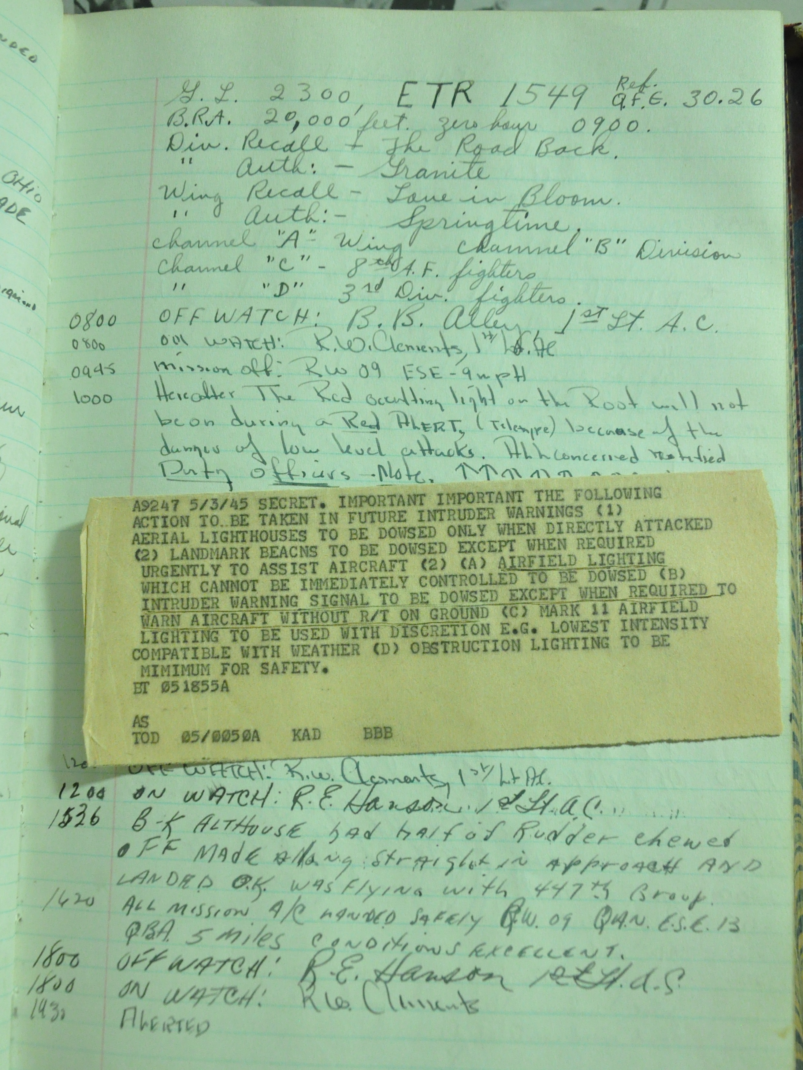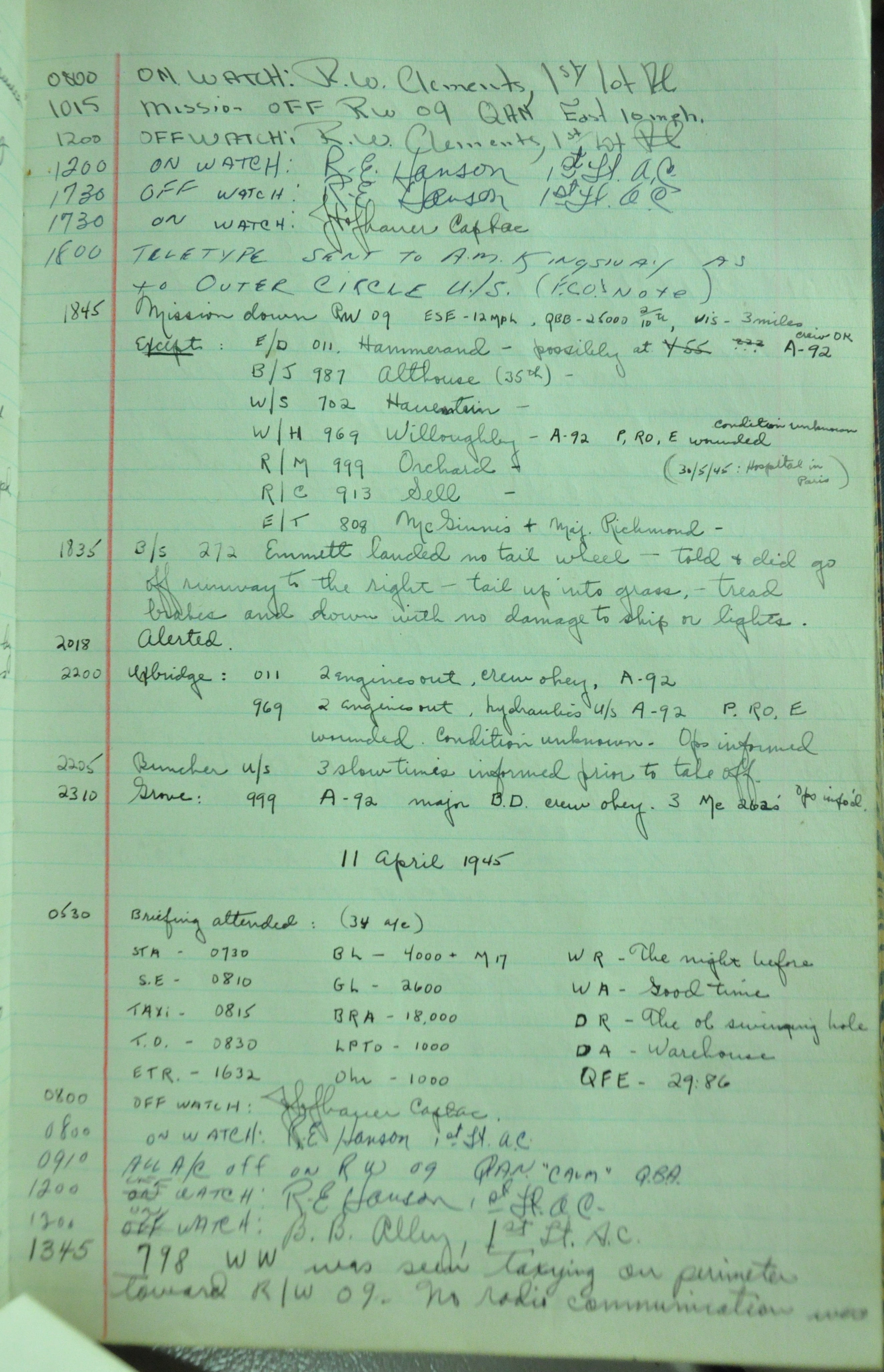 the pages of the 487th Tower Log book that is at the museum. It contains notes by the control tower officers relative to operations