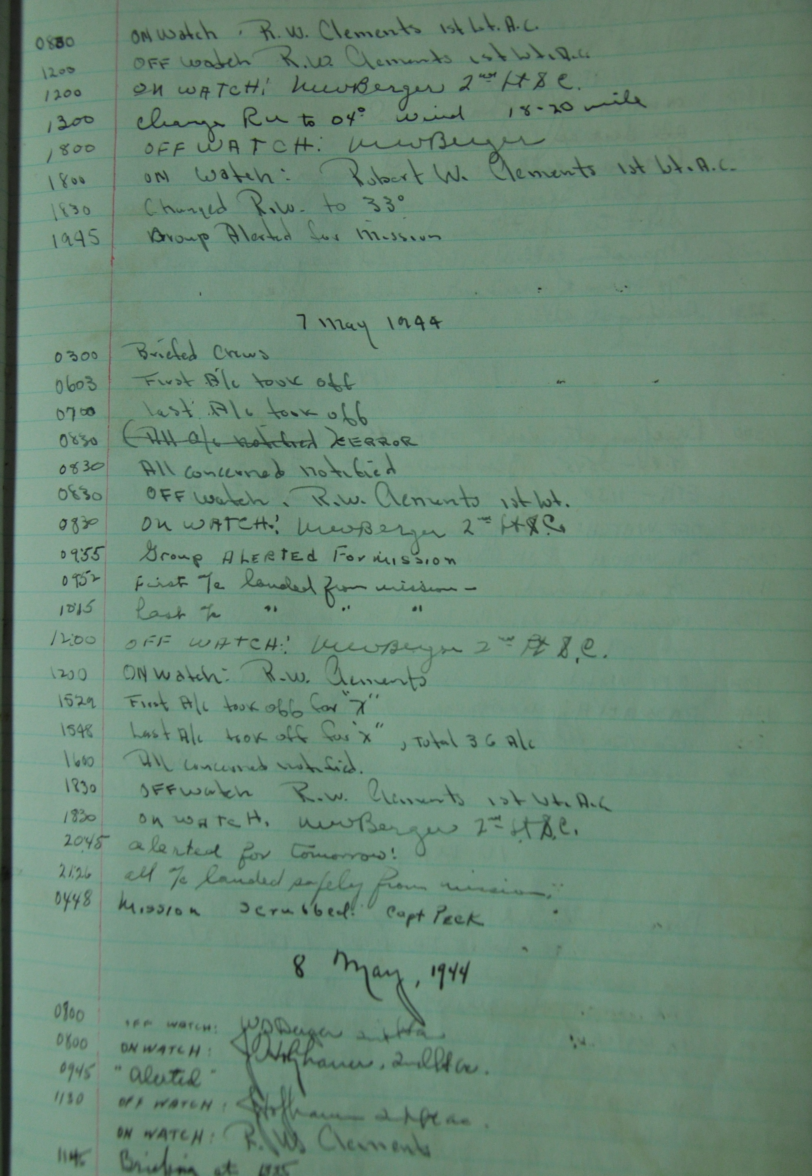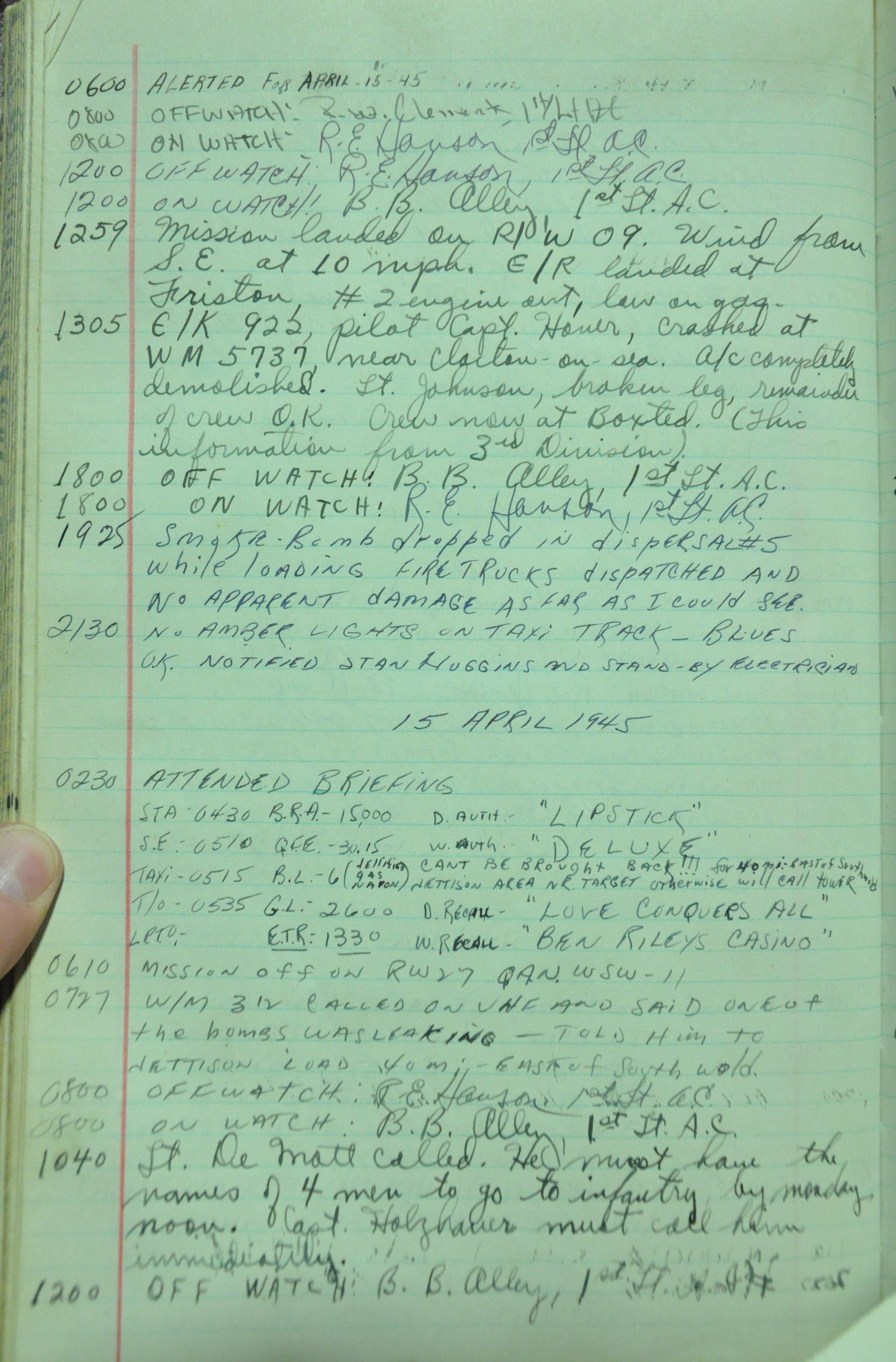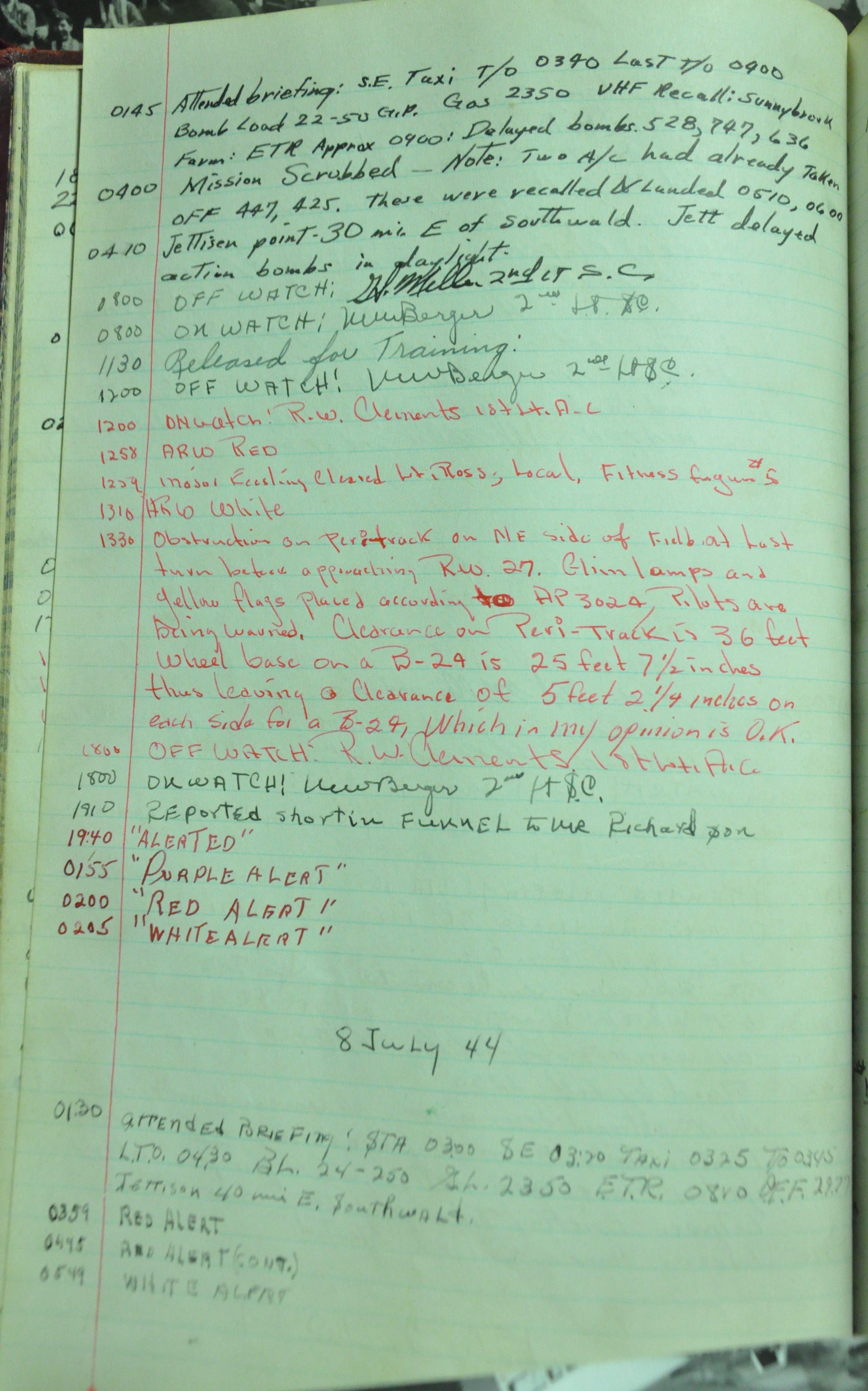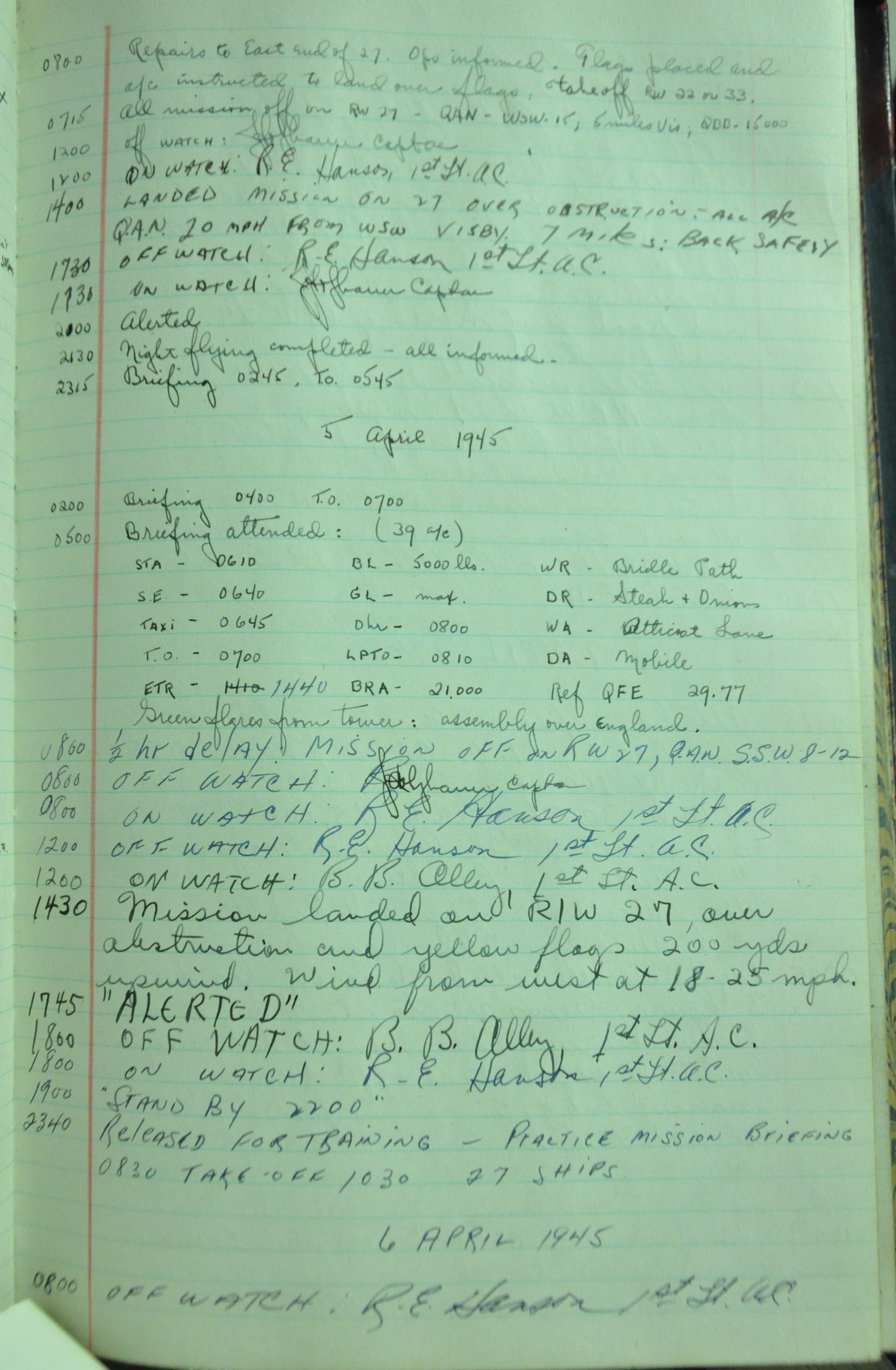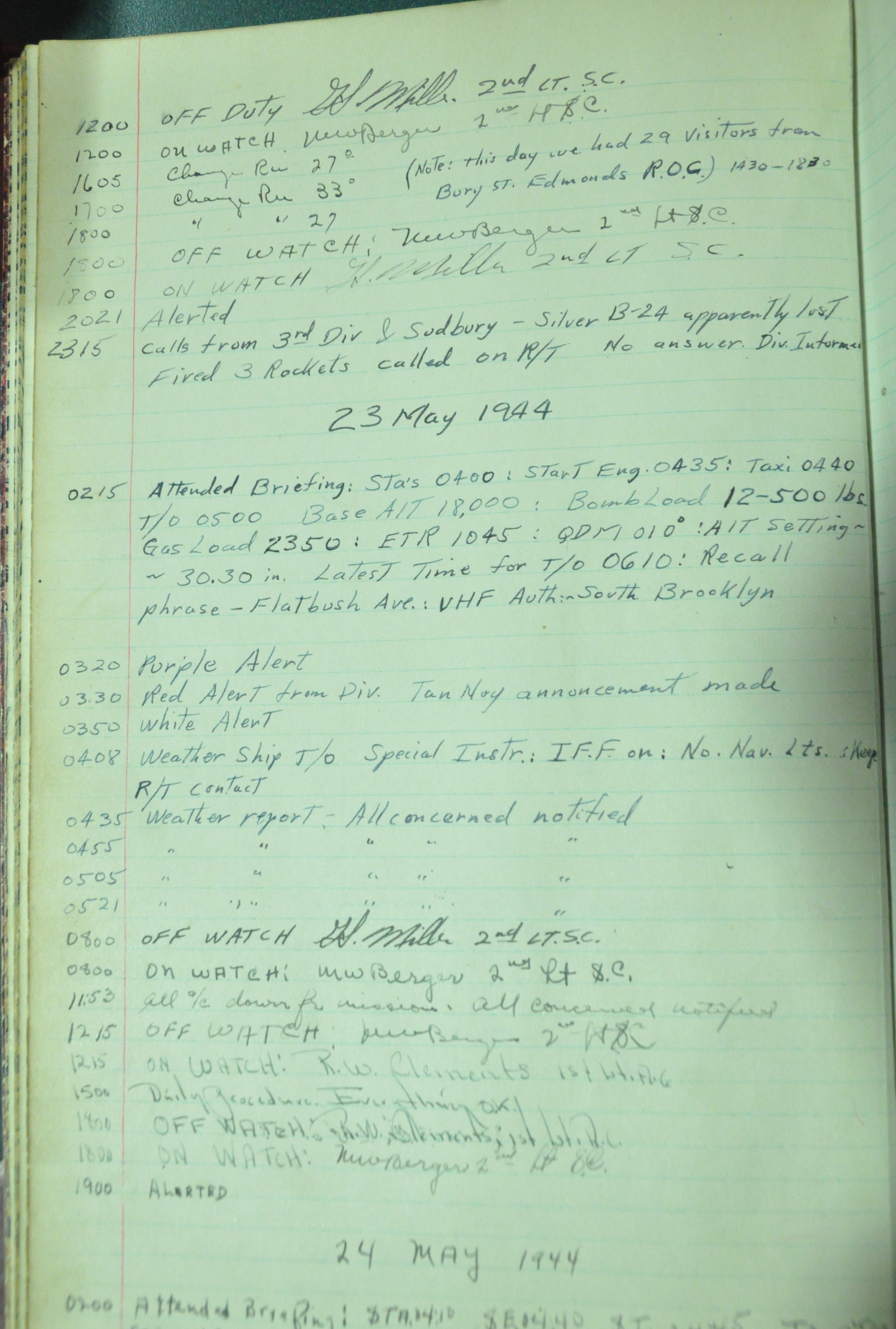 the pages of the 487th Tower Log book that is at the museum. It contains notes by the control tower officers relative to operations
