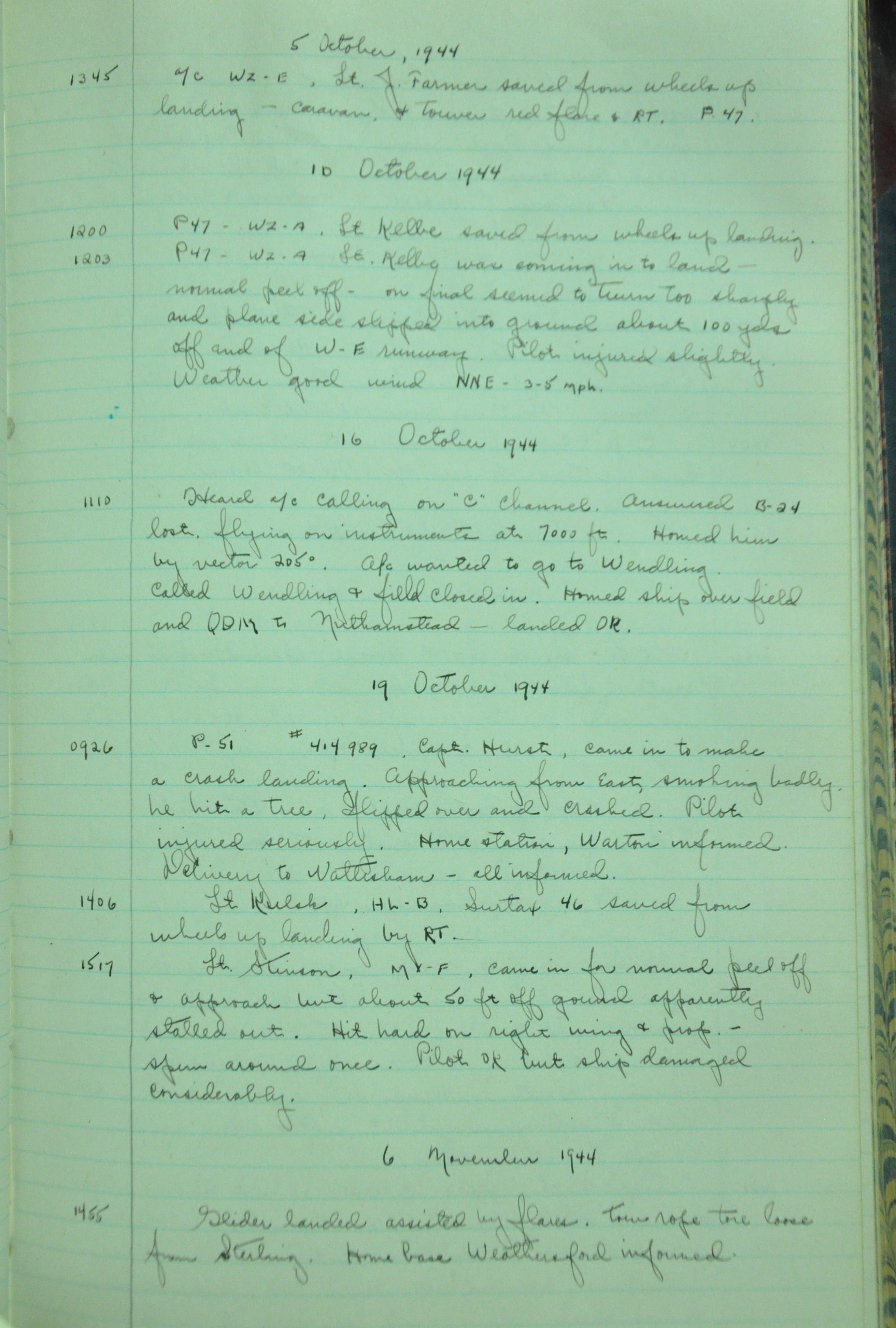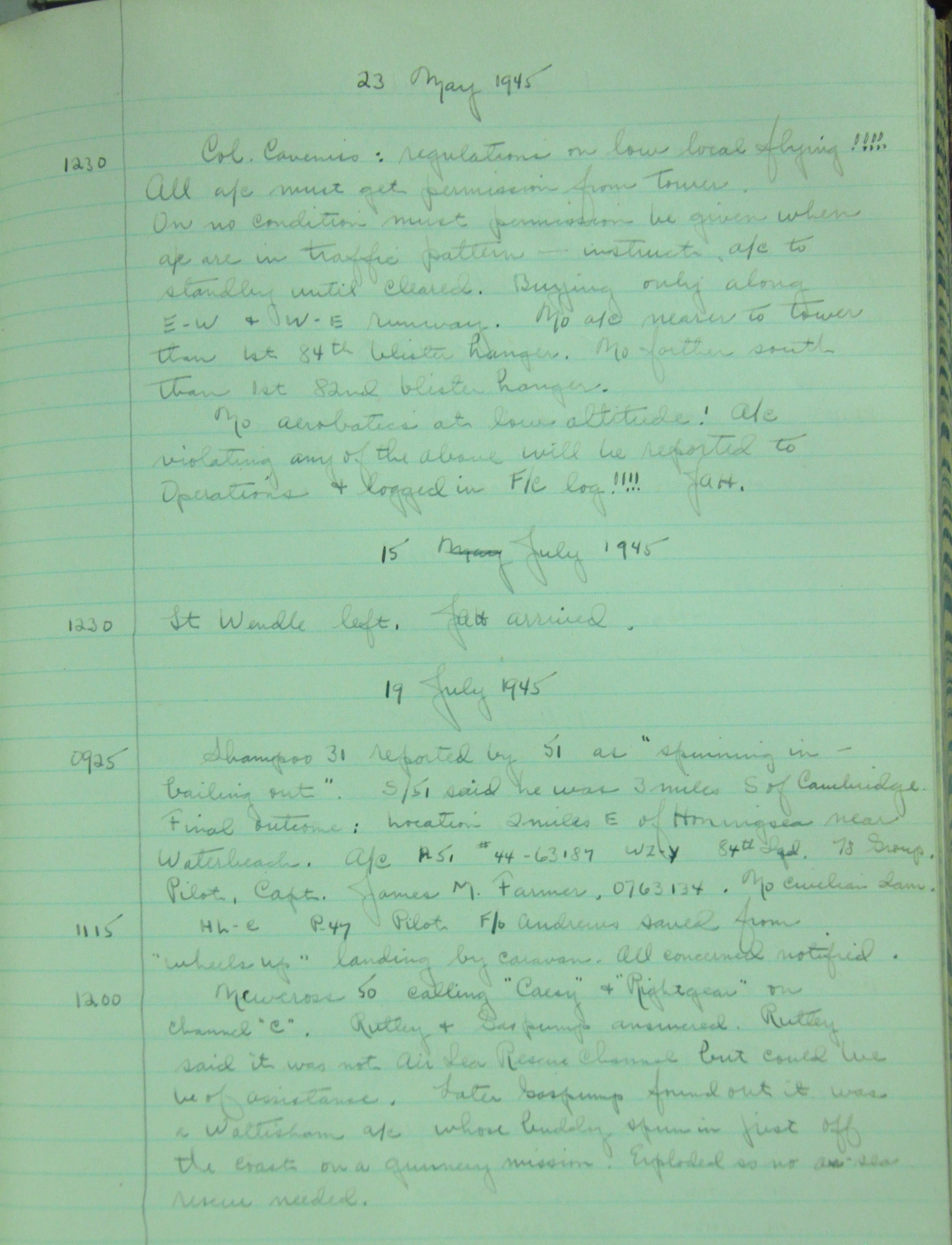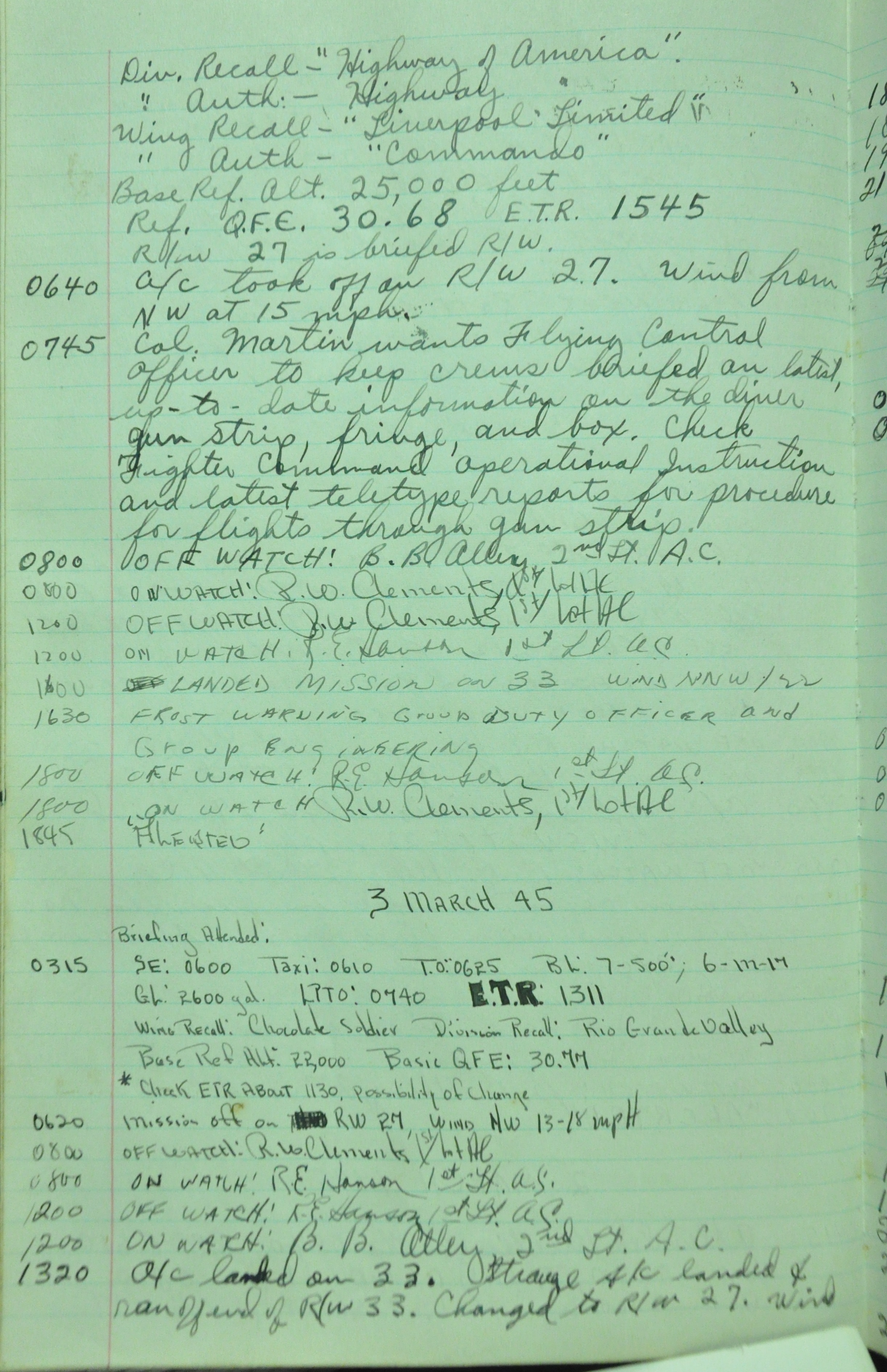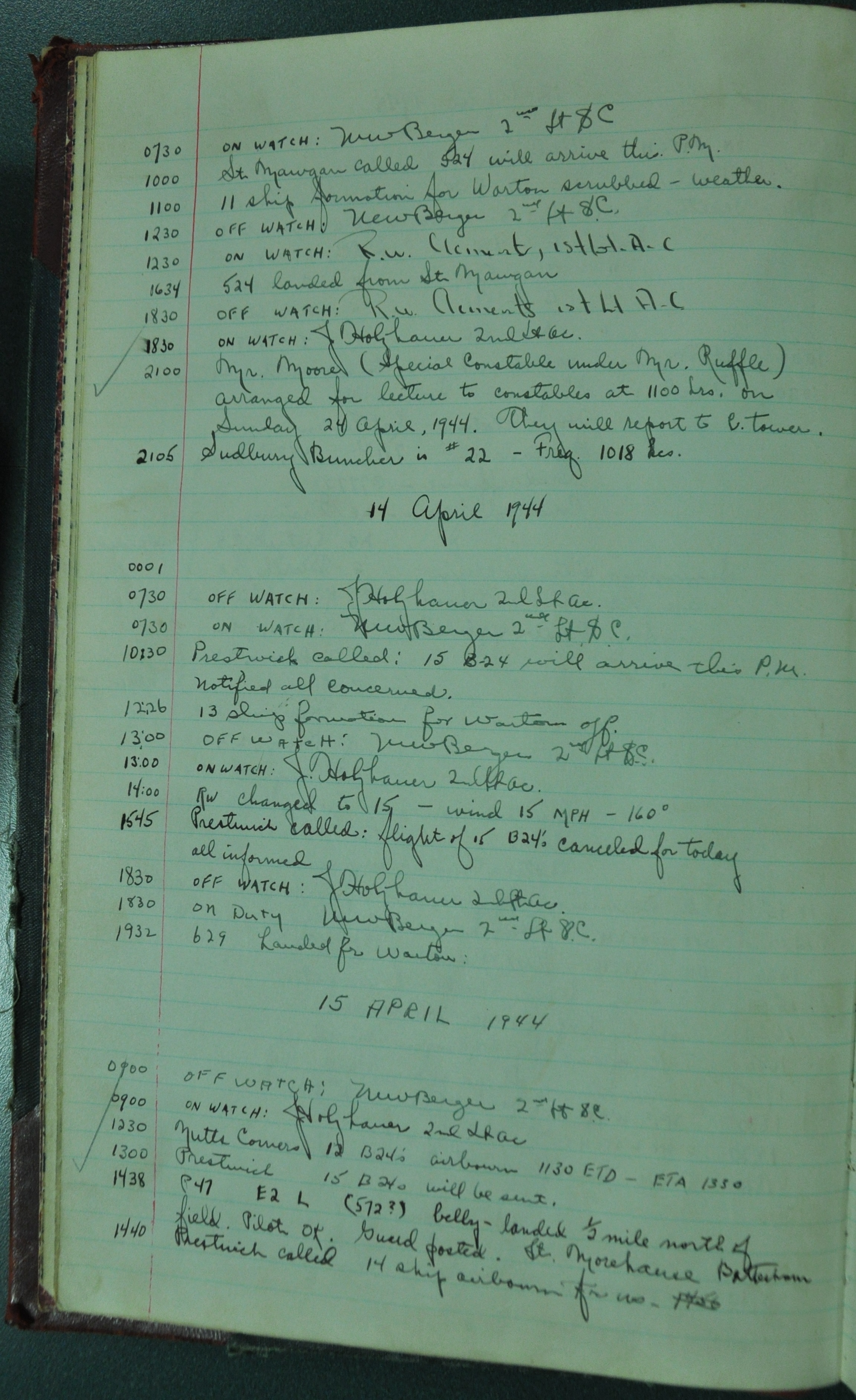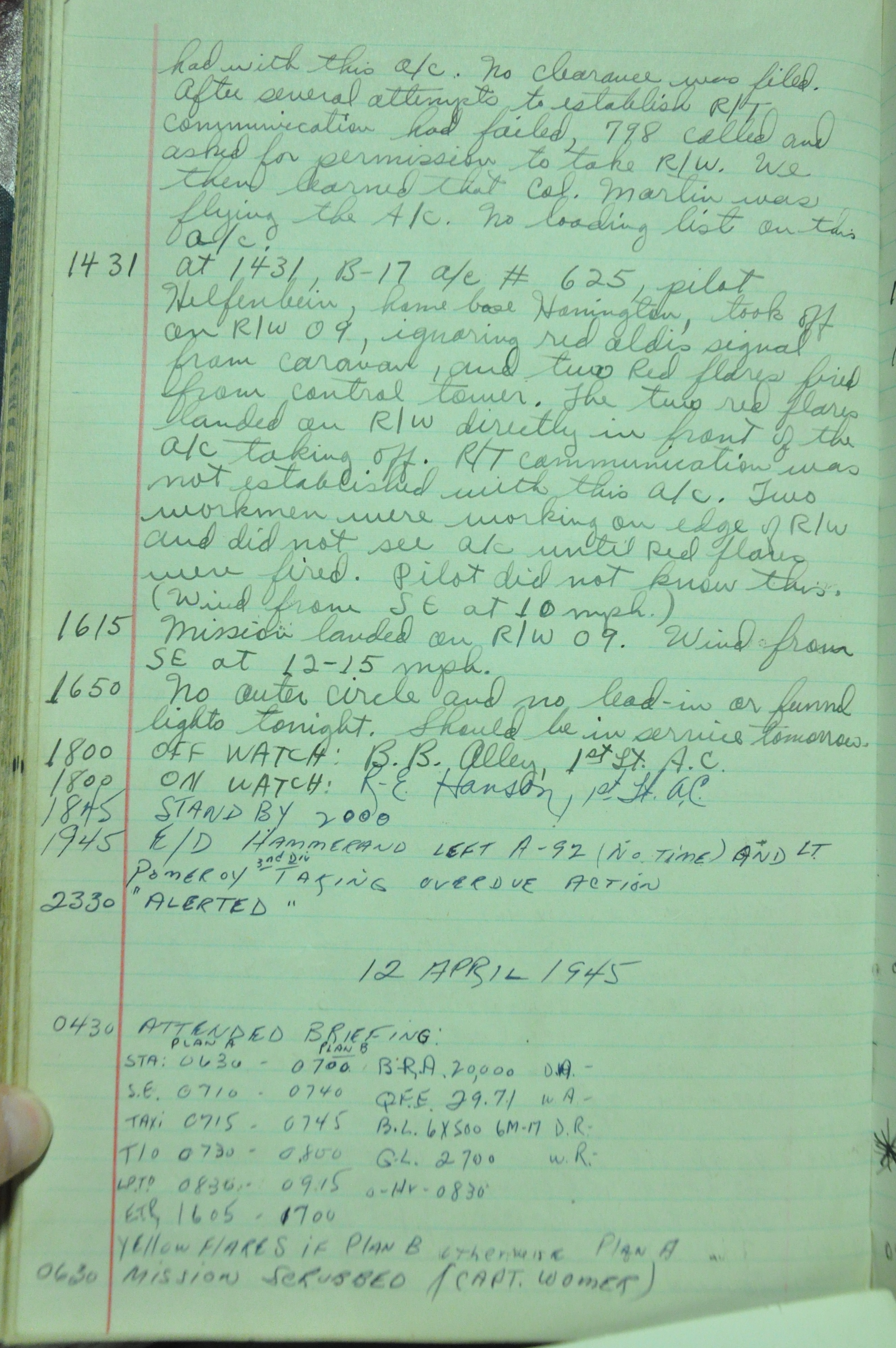 the pages of the 487th Tower Log book that is at the museum. It contains notes by the control tower officers relative to operations