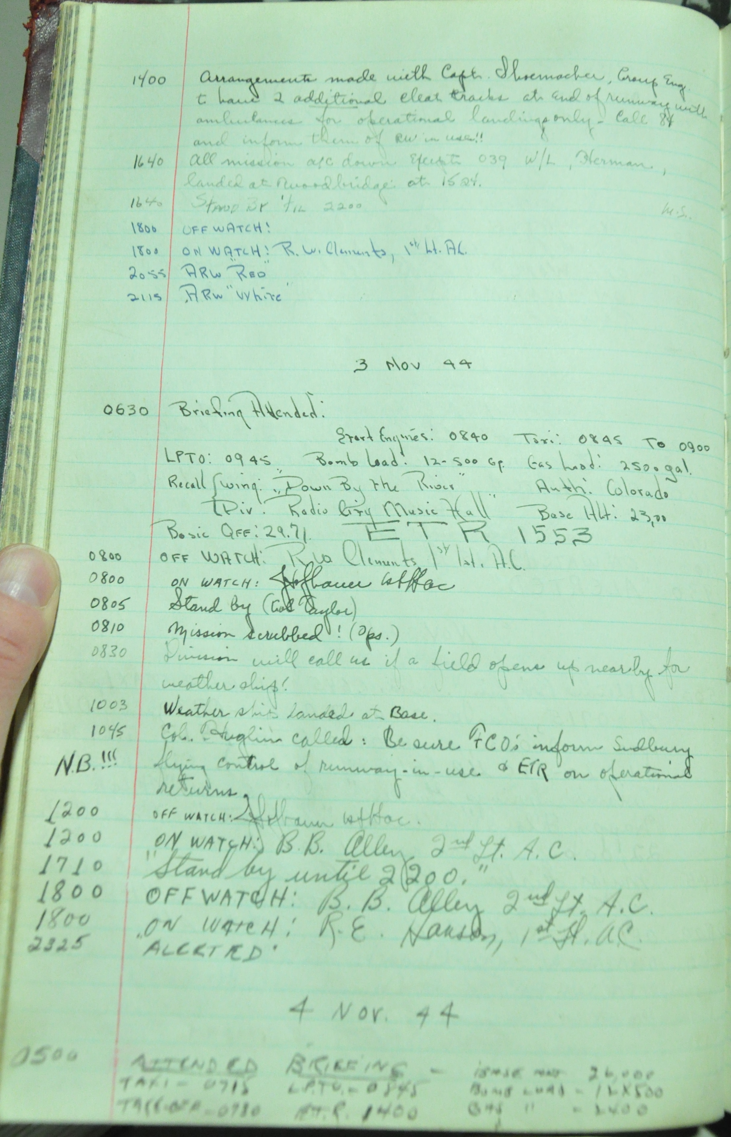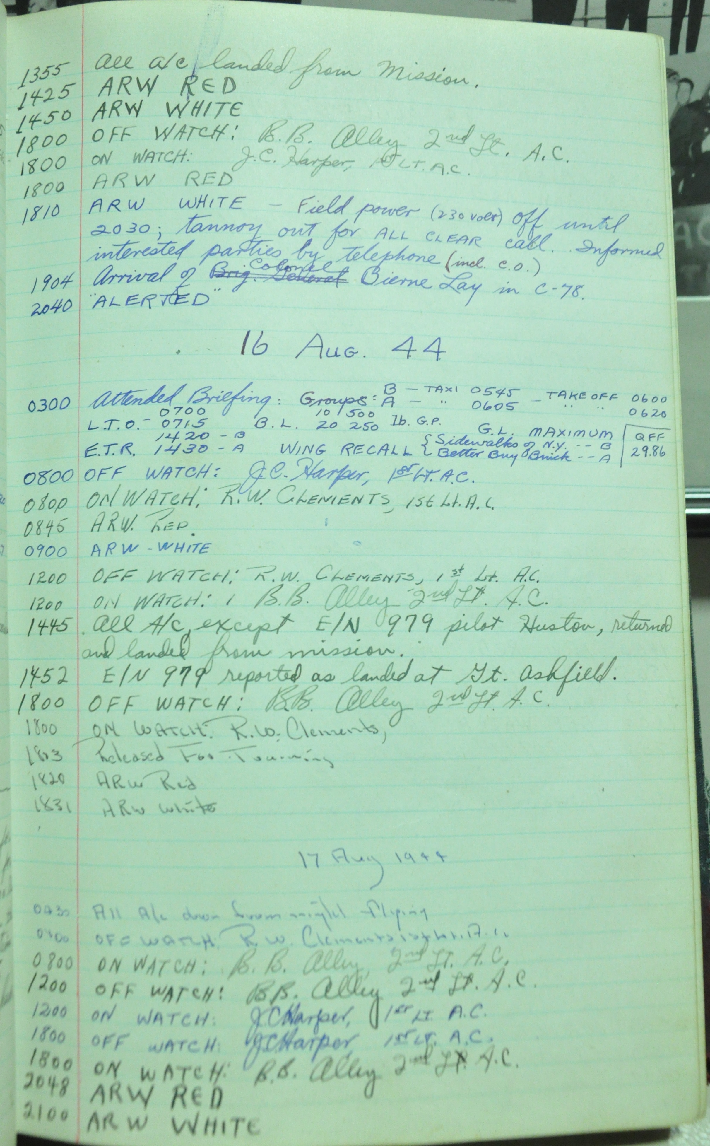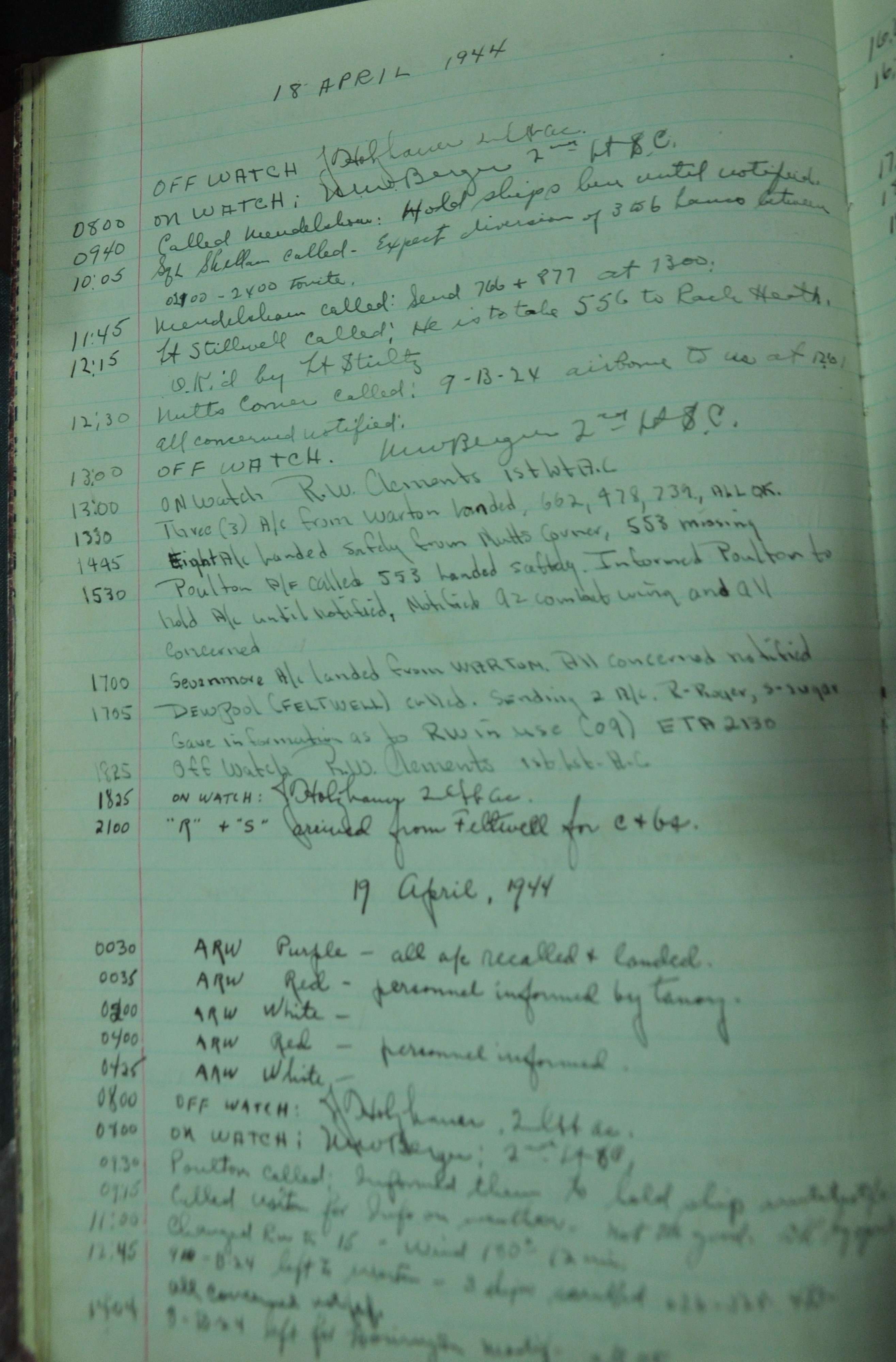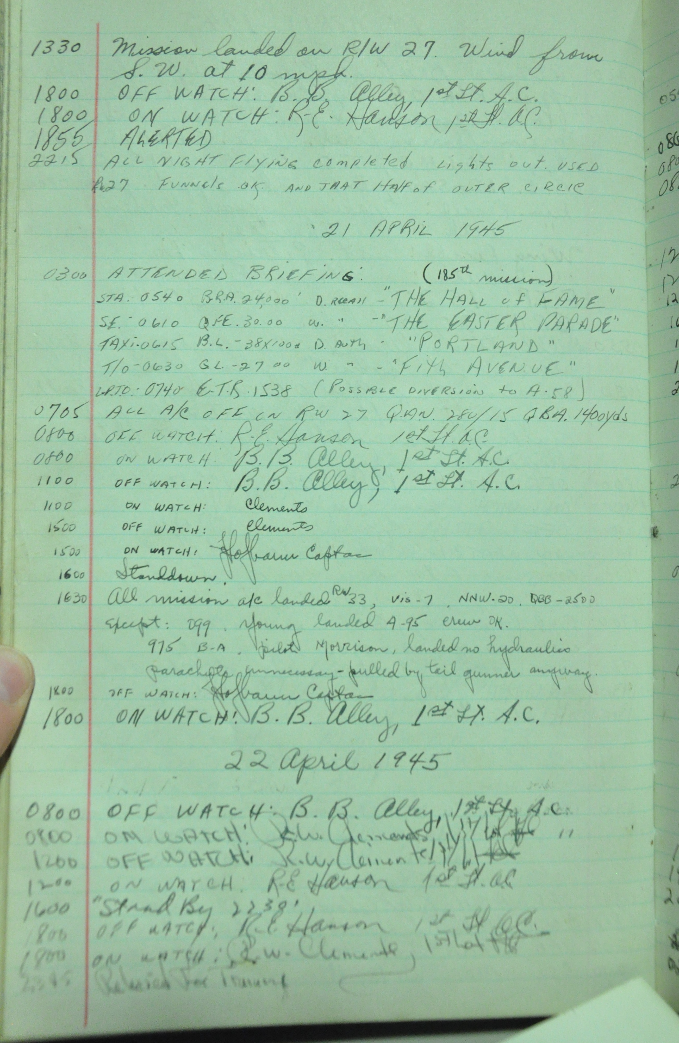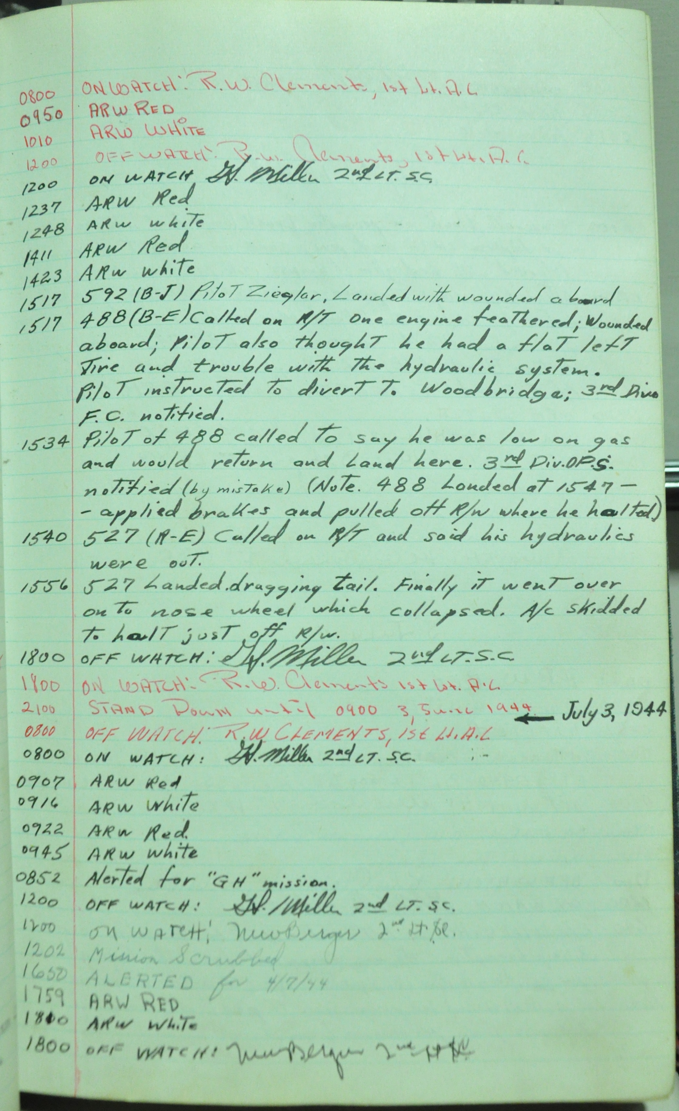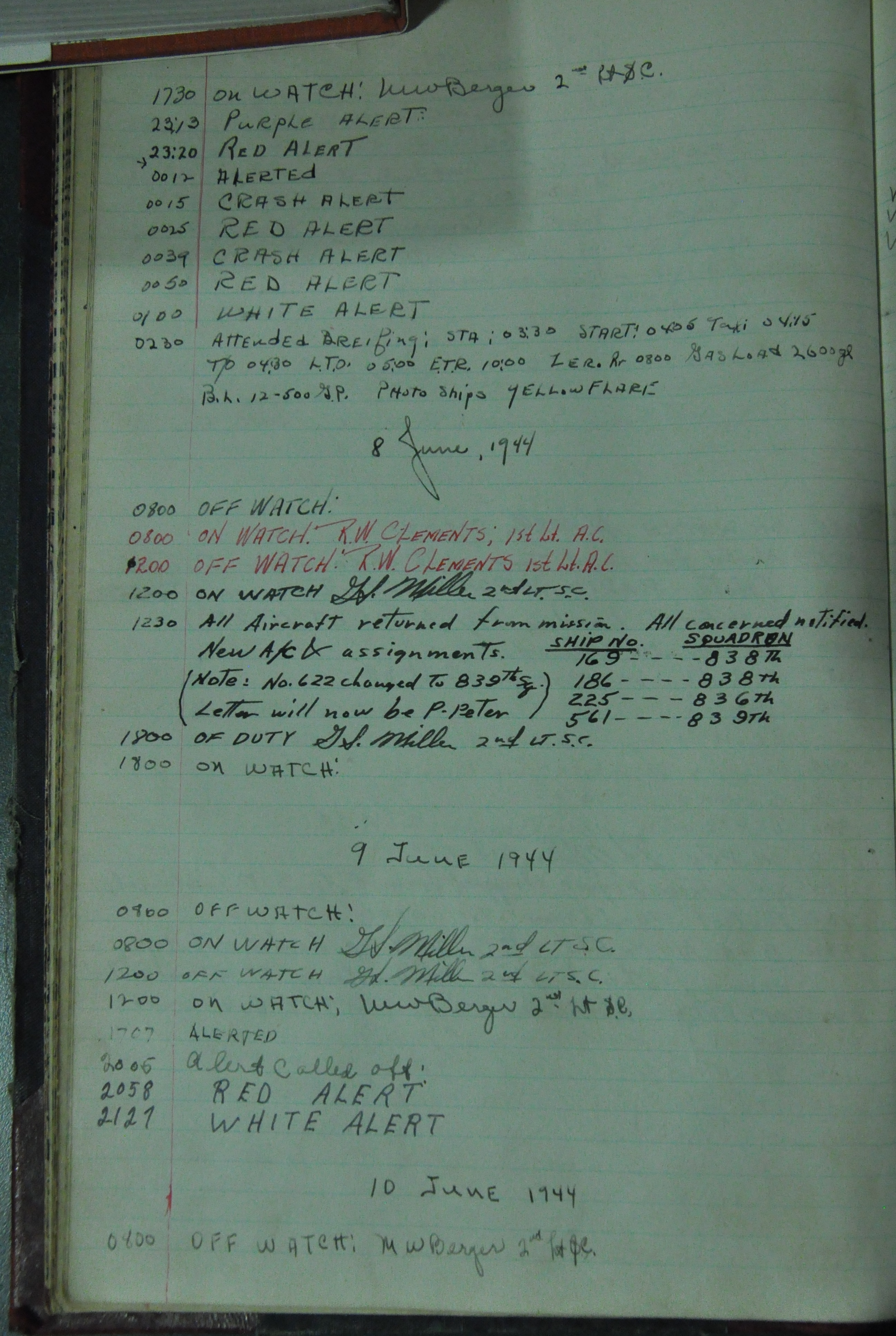 the pages of the 487th Tower Log book that is at the museum. It contains notes by the control tower officers relative to operations