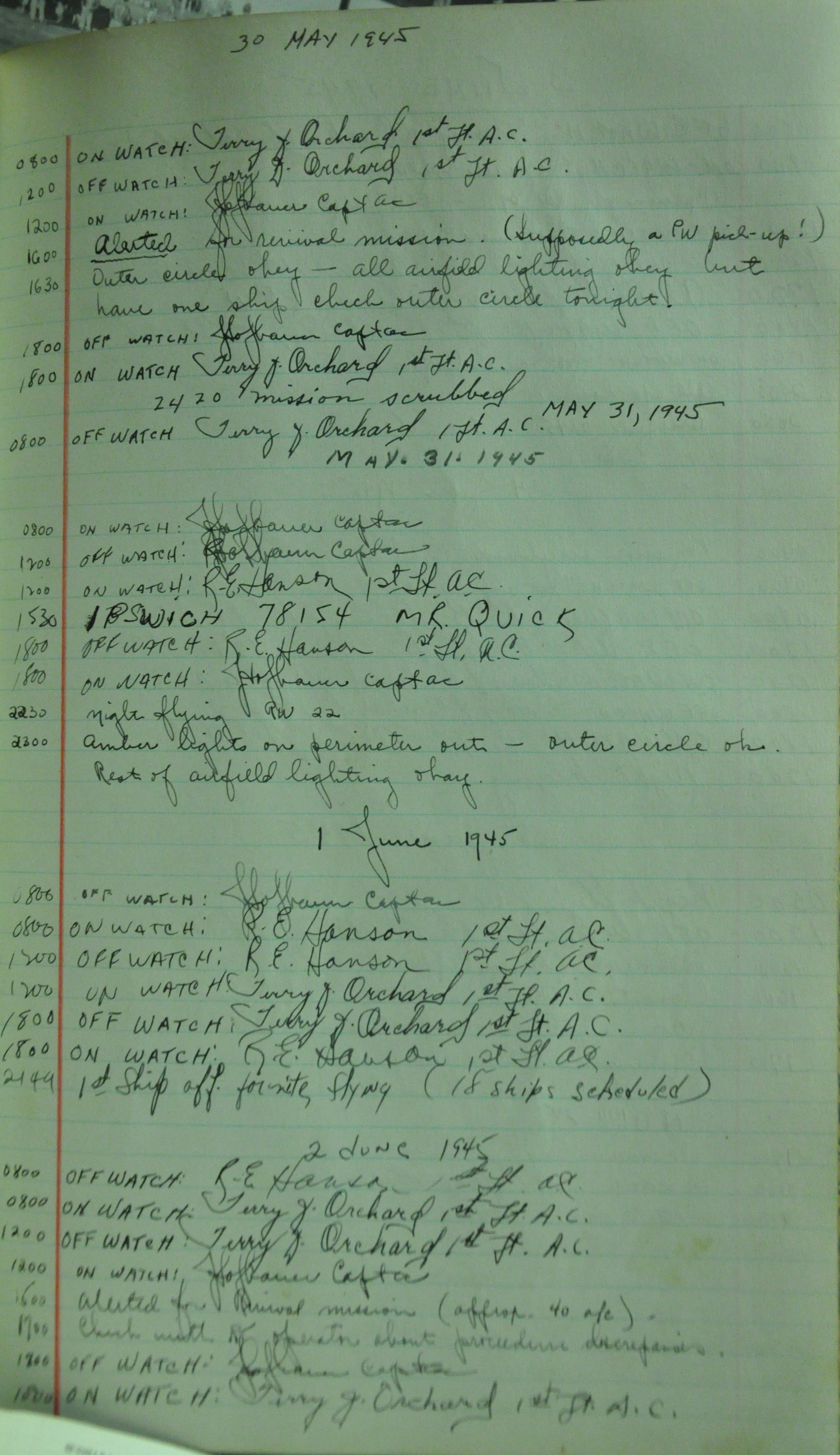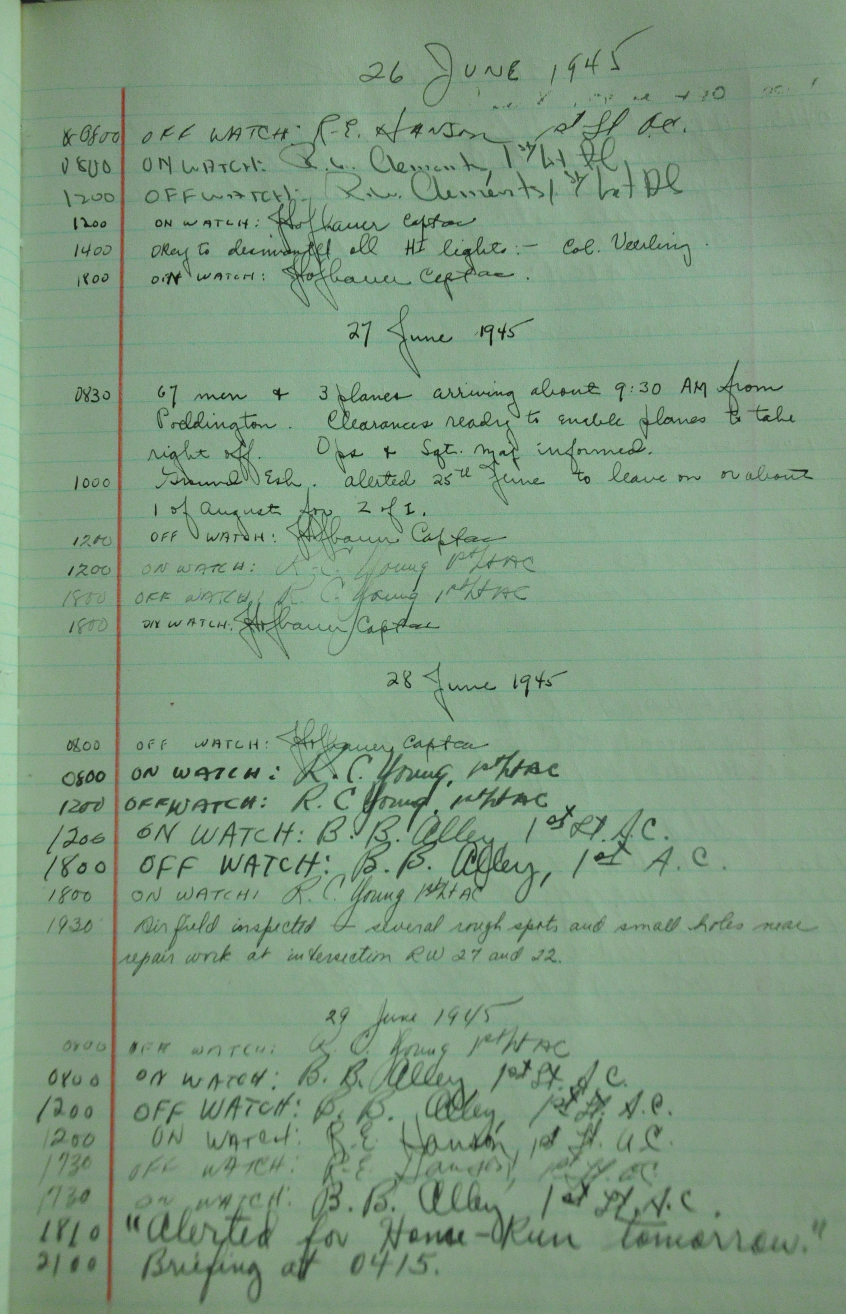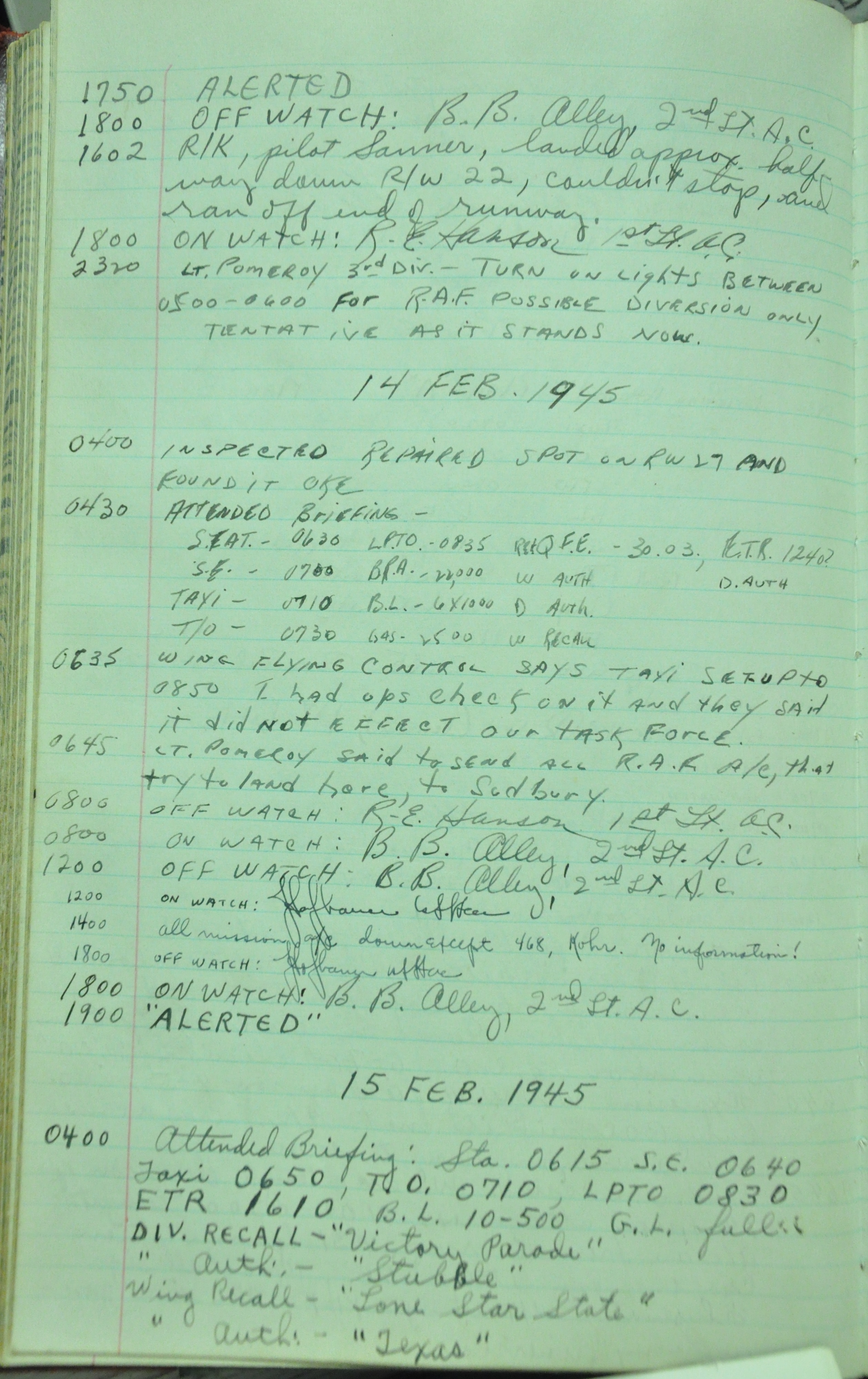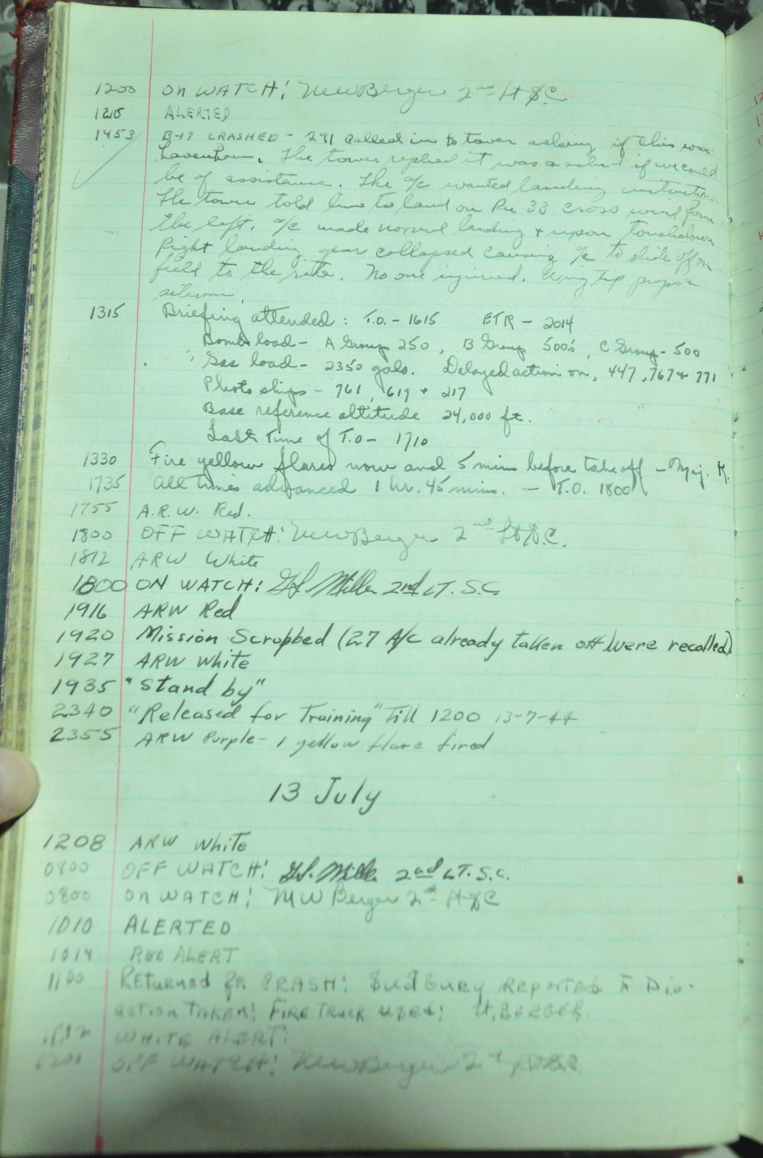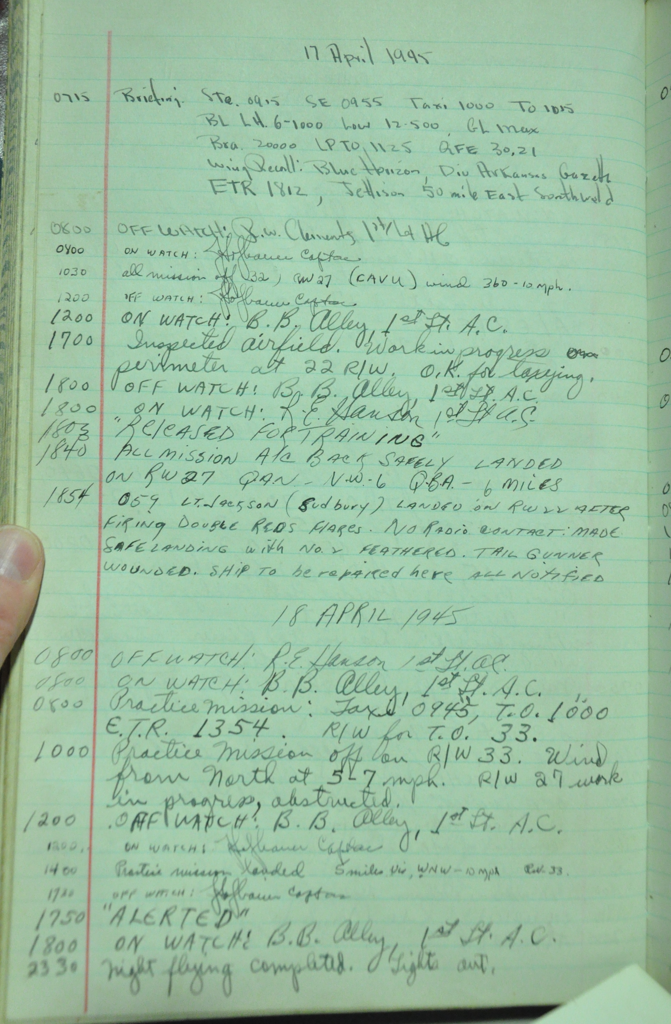 the pages of the 487th Tower Log book that is at the museum. It contains notes by the control tower officers relative to operations