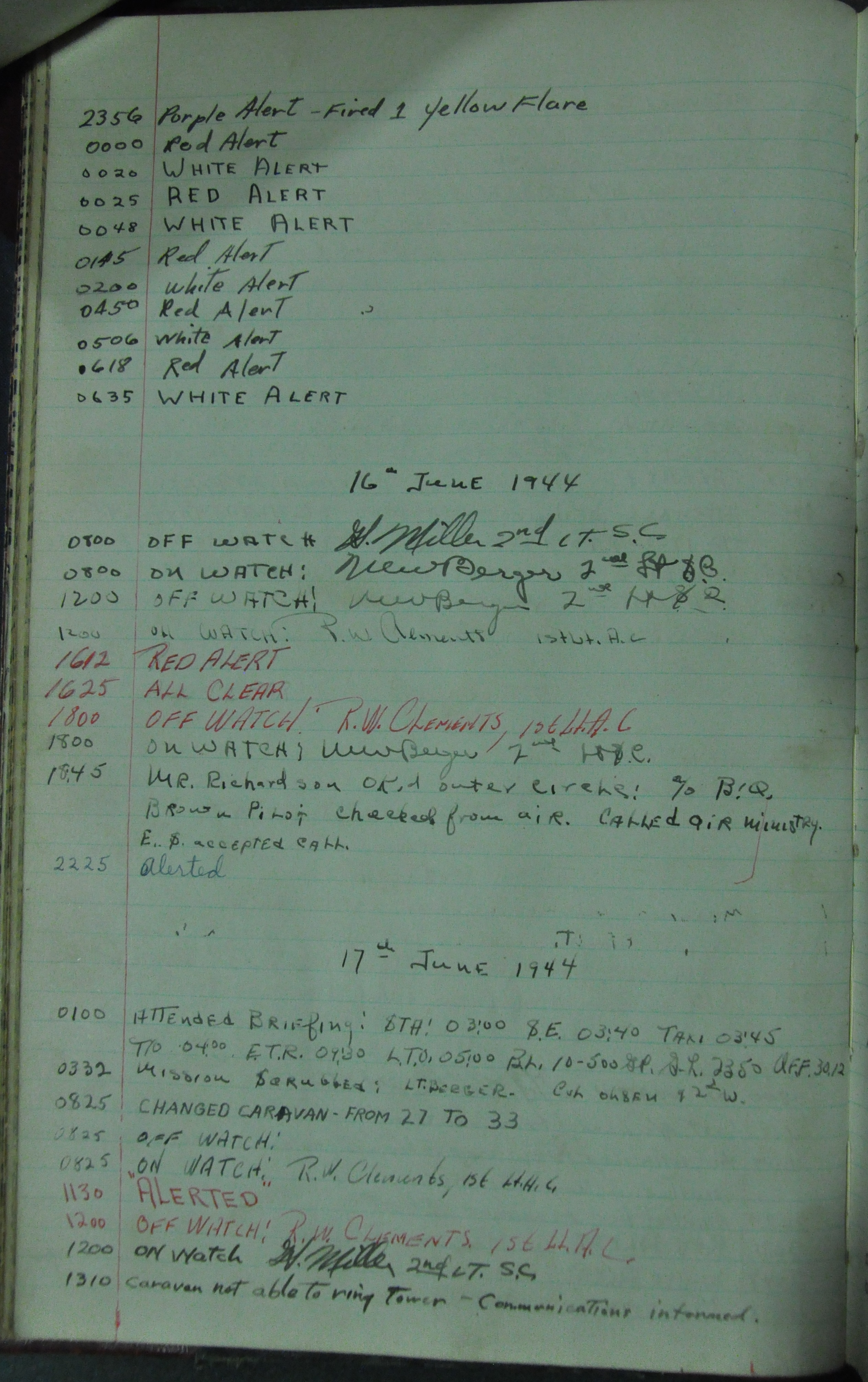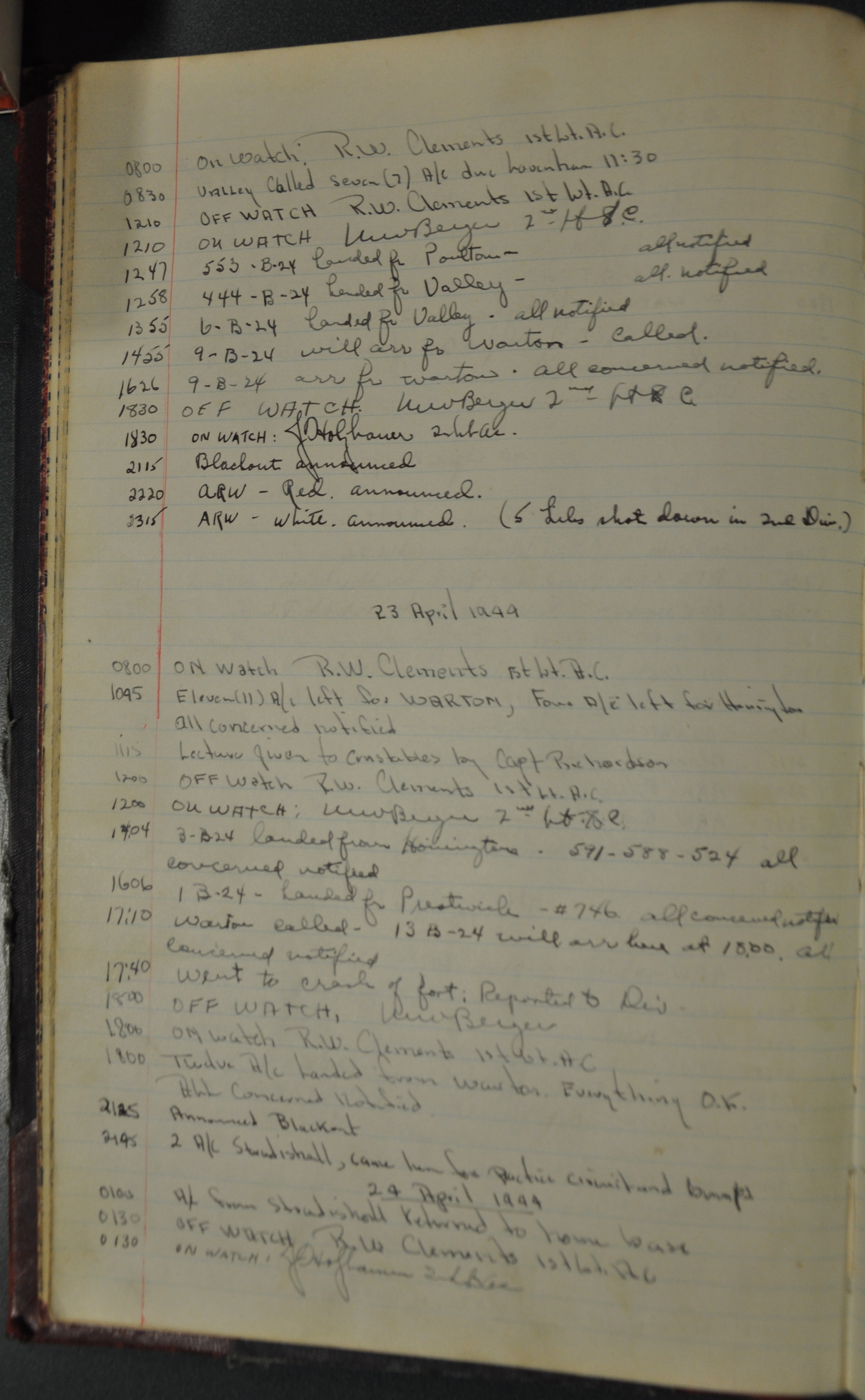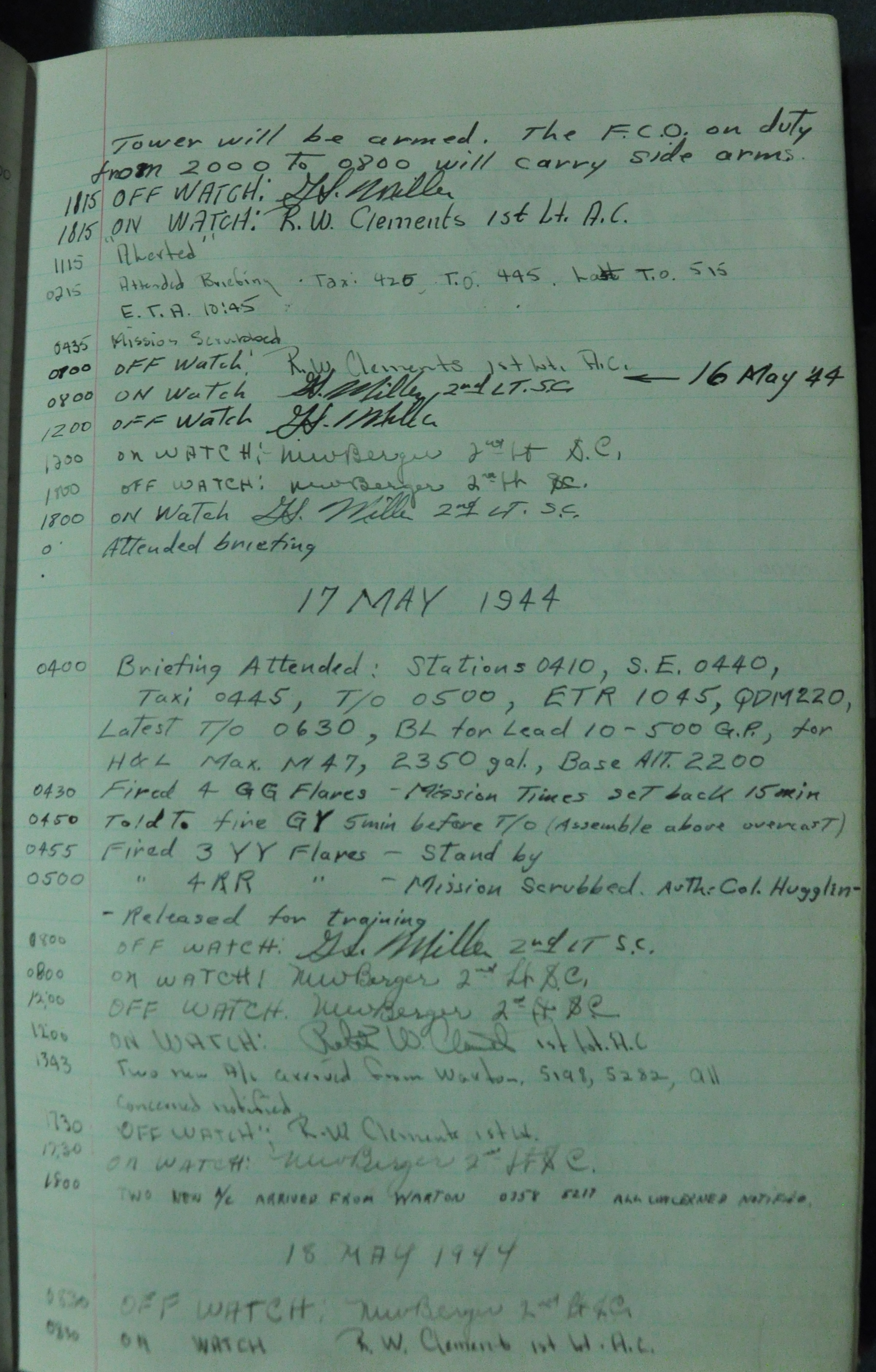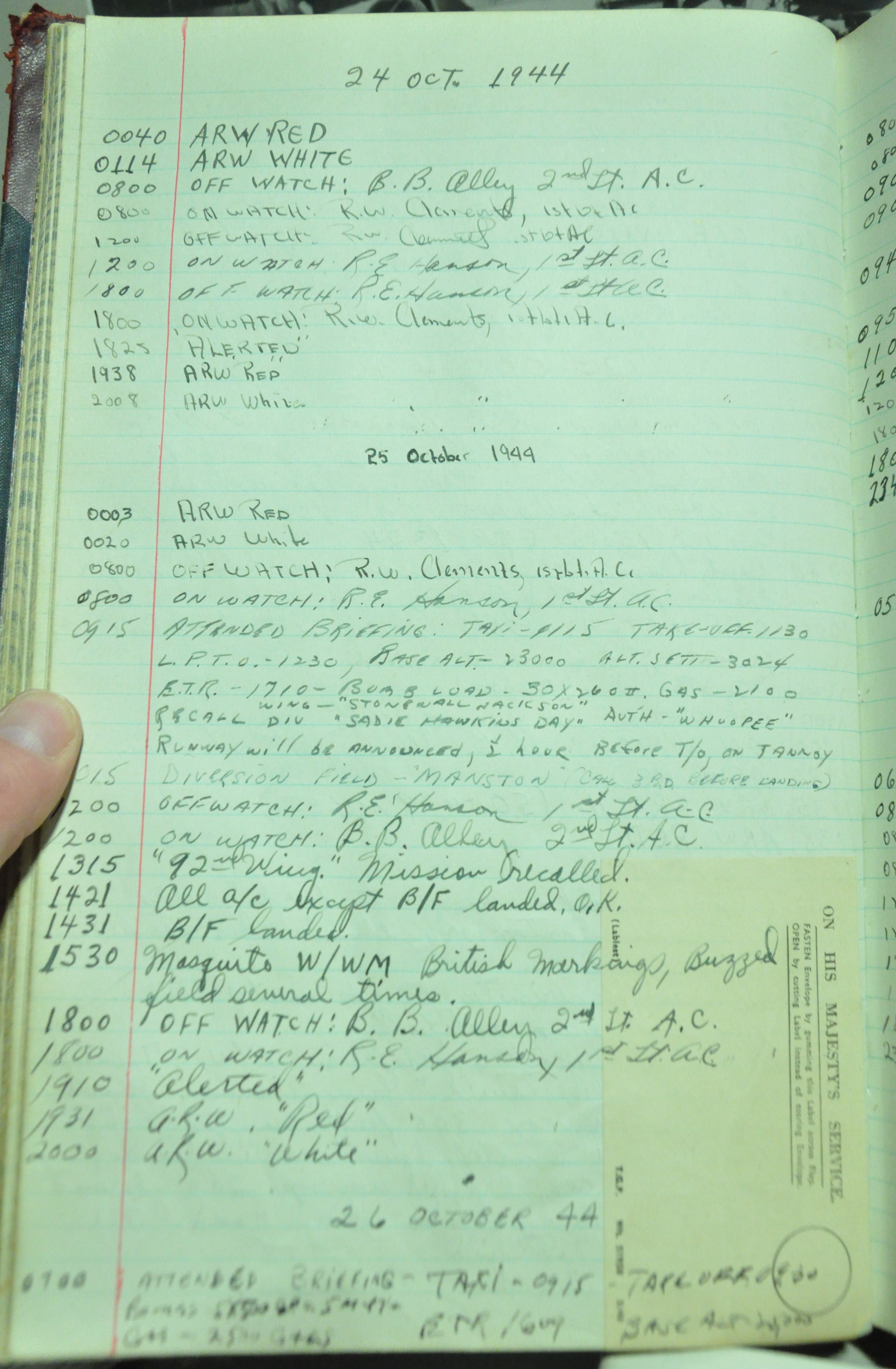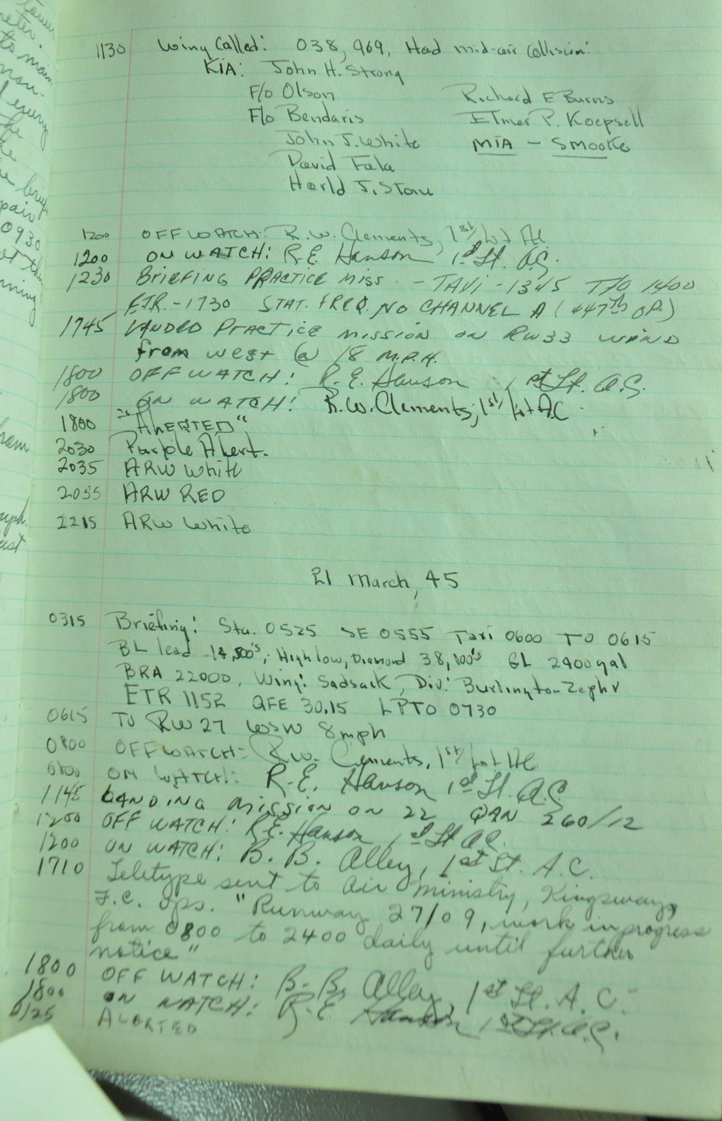 the pages of the 487th Tower Log book that is at the museum. It contains notes by the control tower officers relative to operations