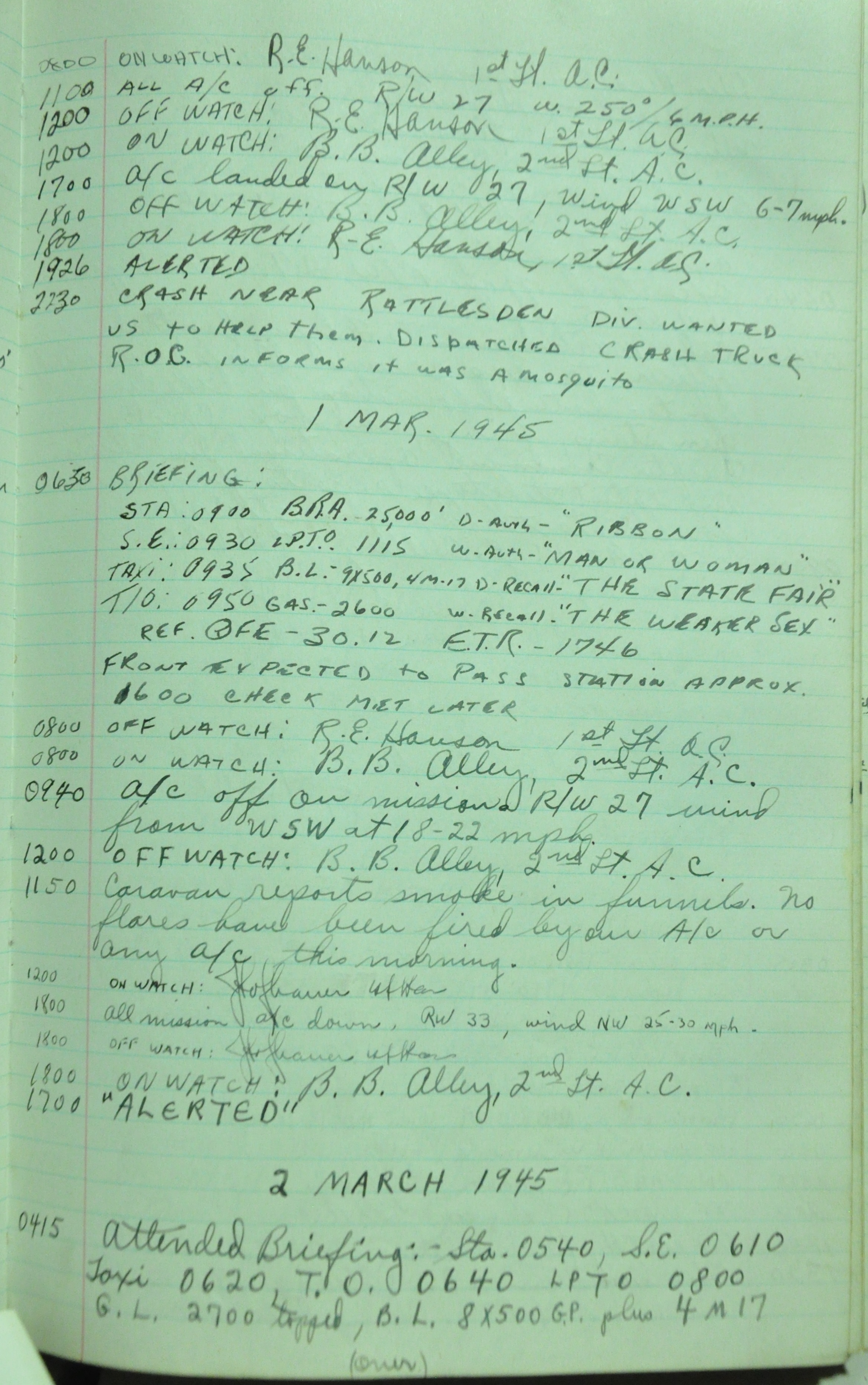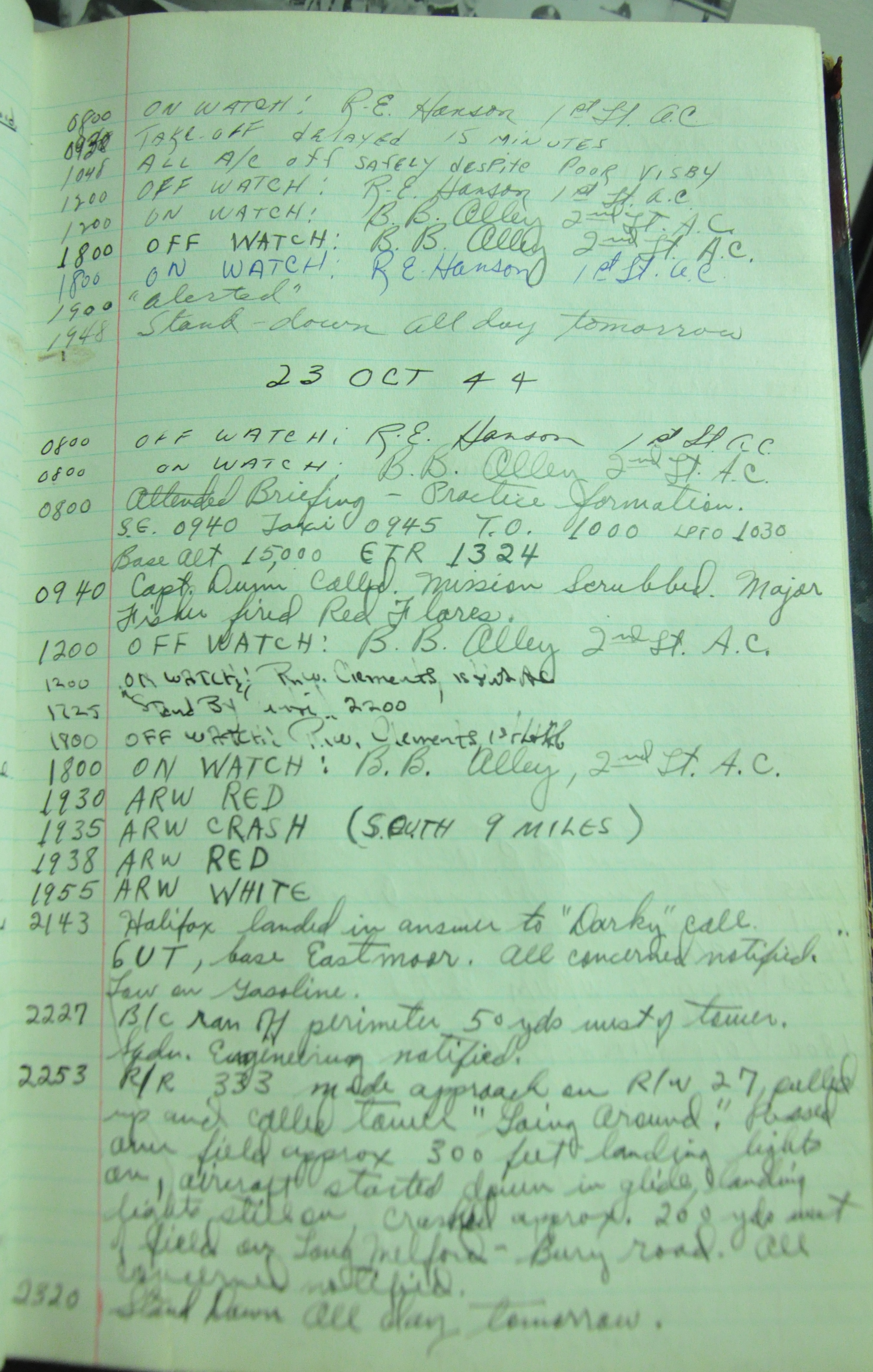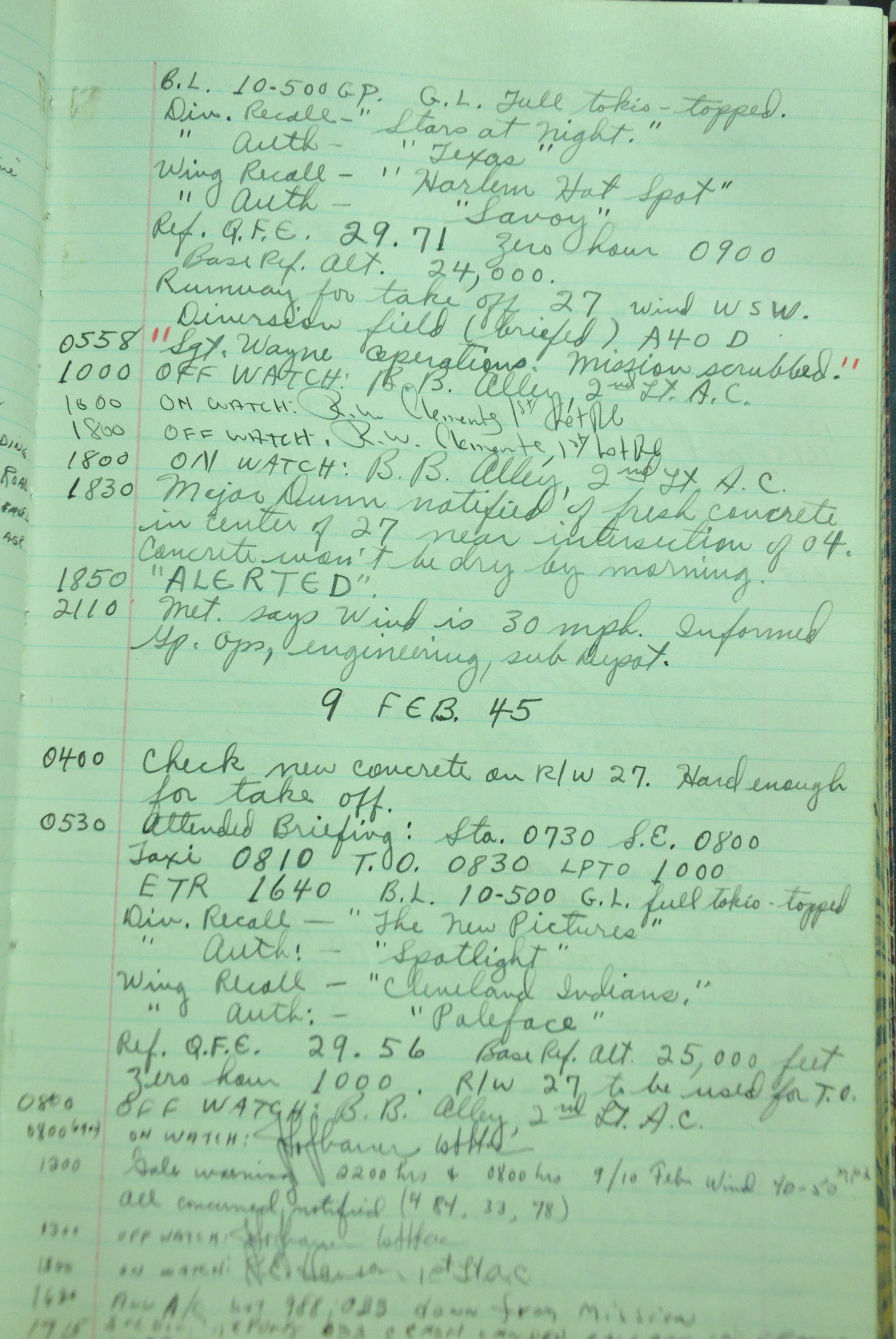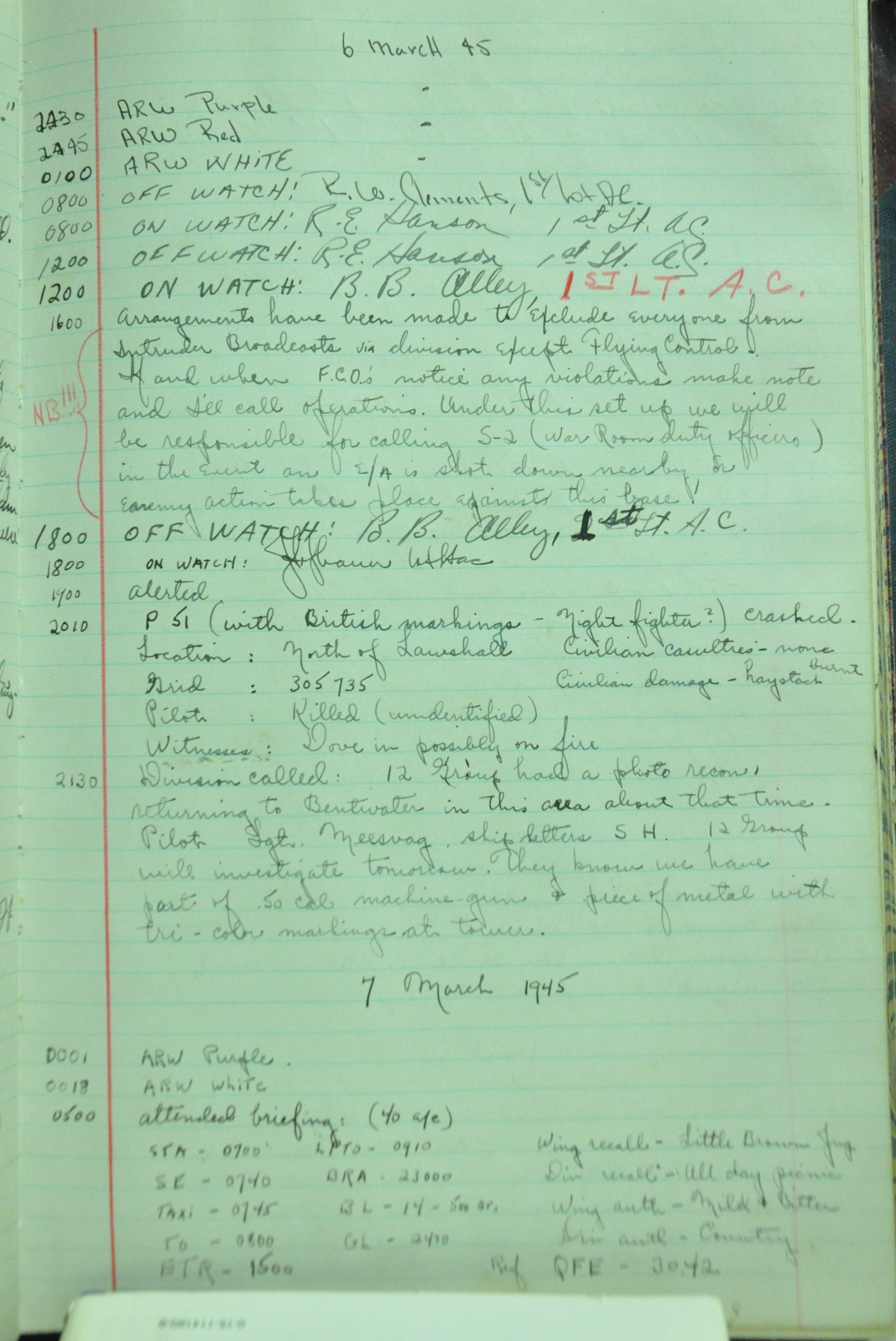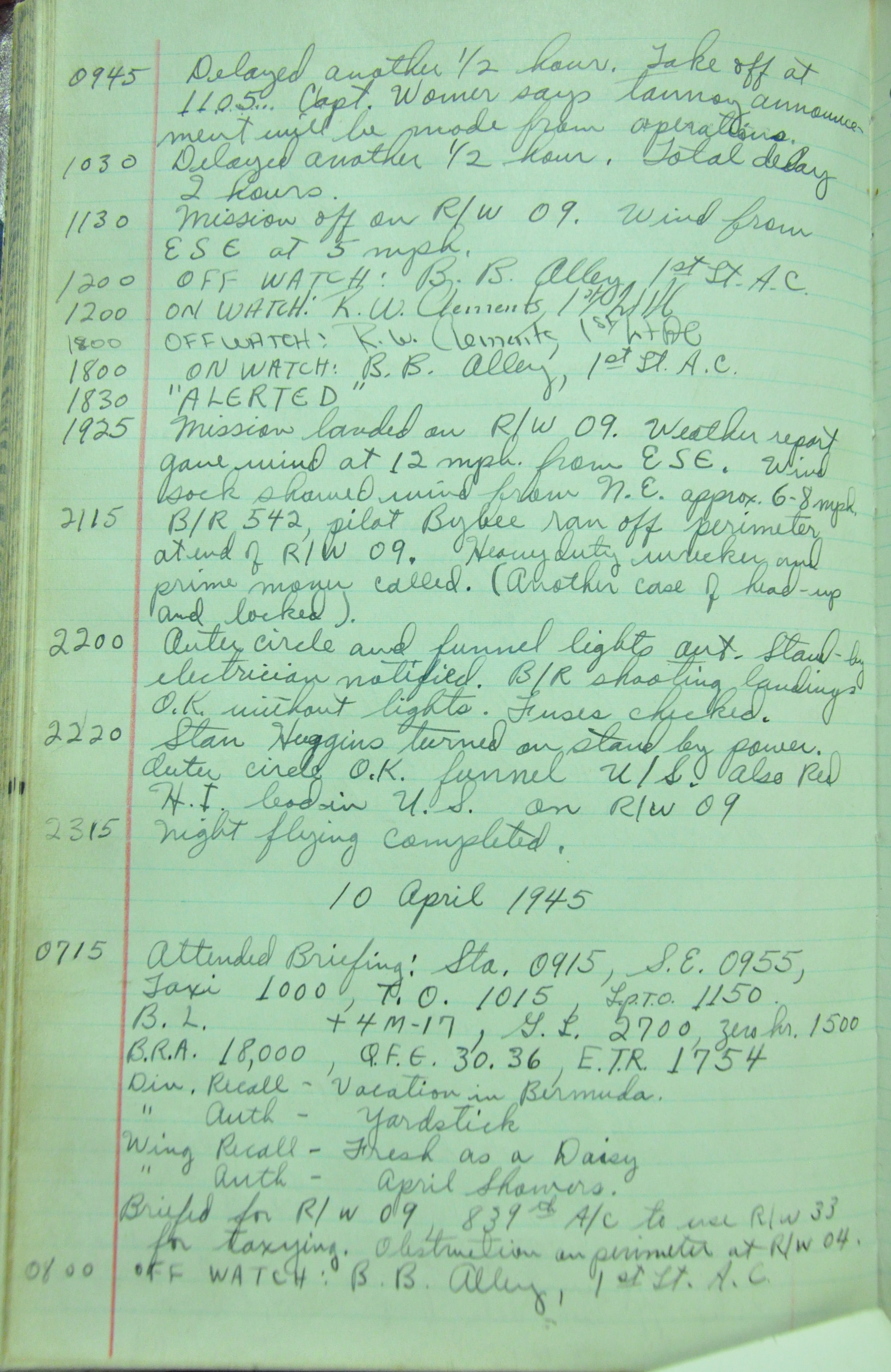 the pages of the 487th Tower Log book that is at the museum. It contains notes by the control tower officers relative to operations