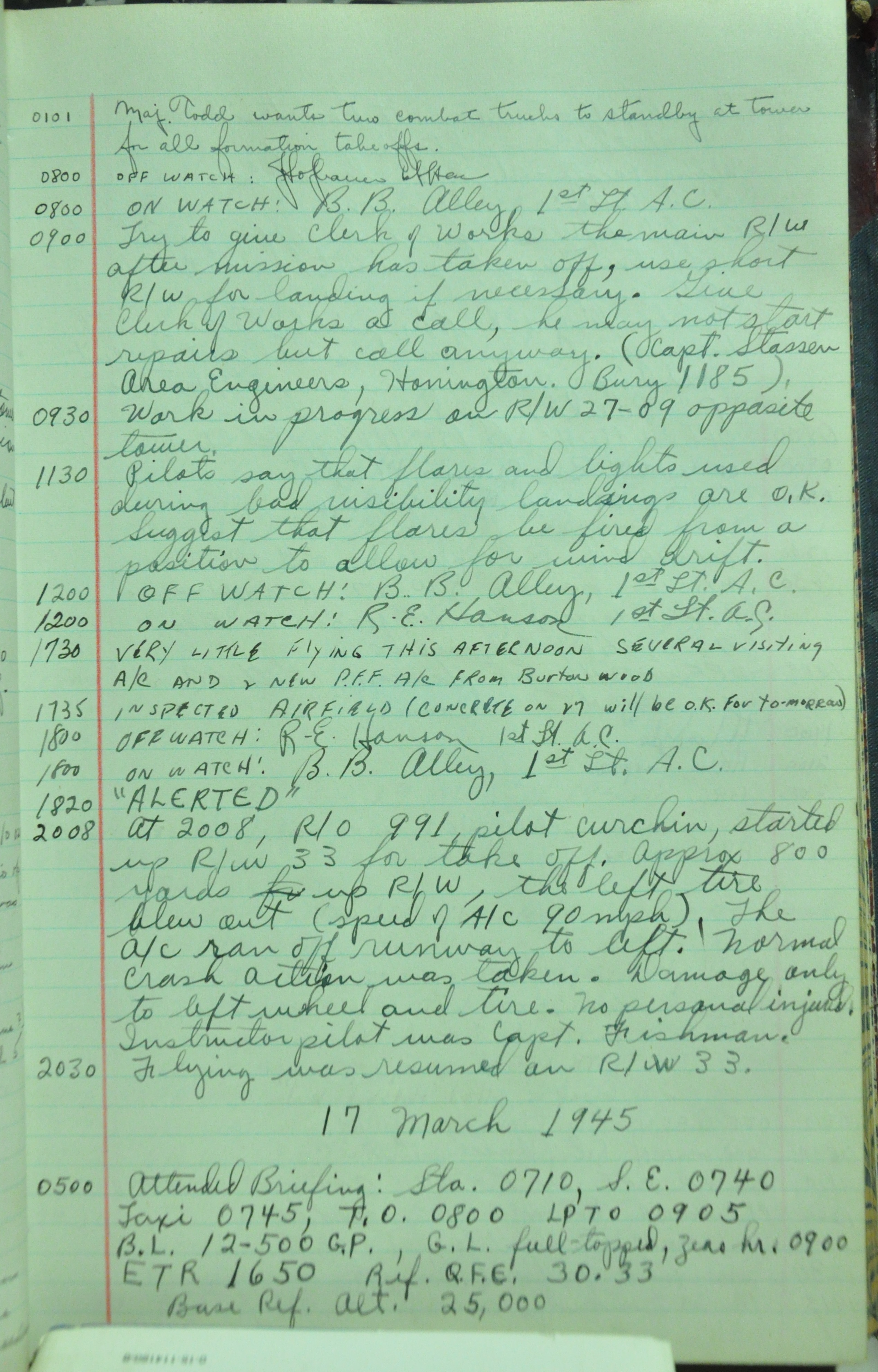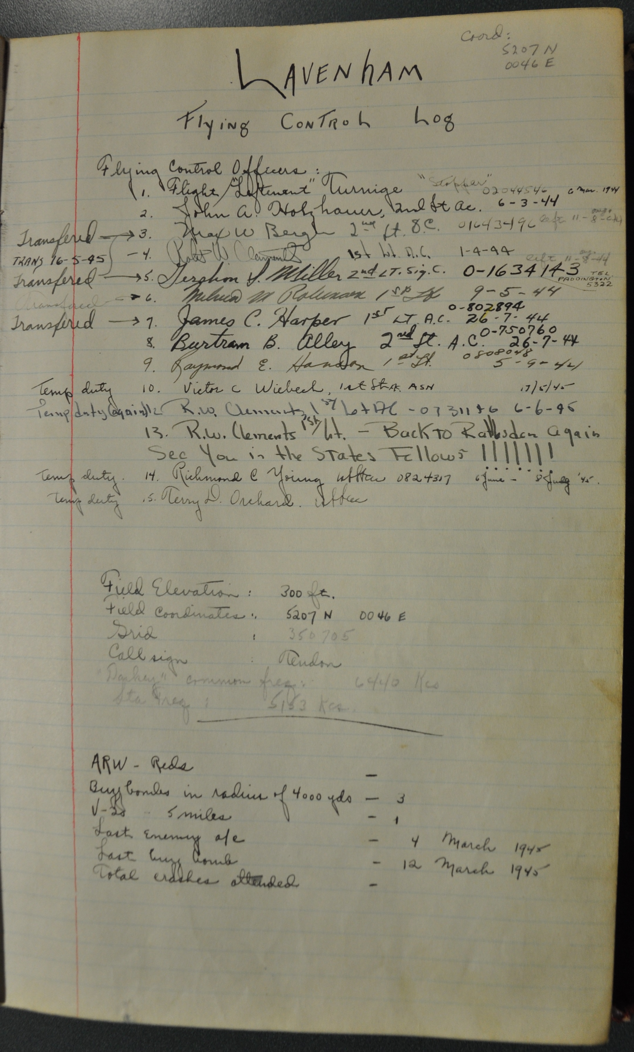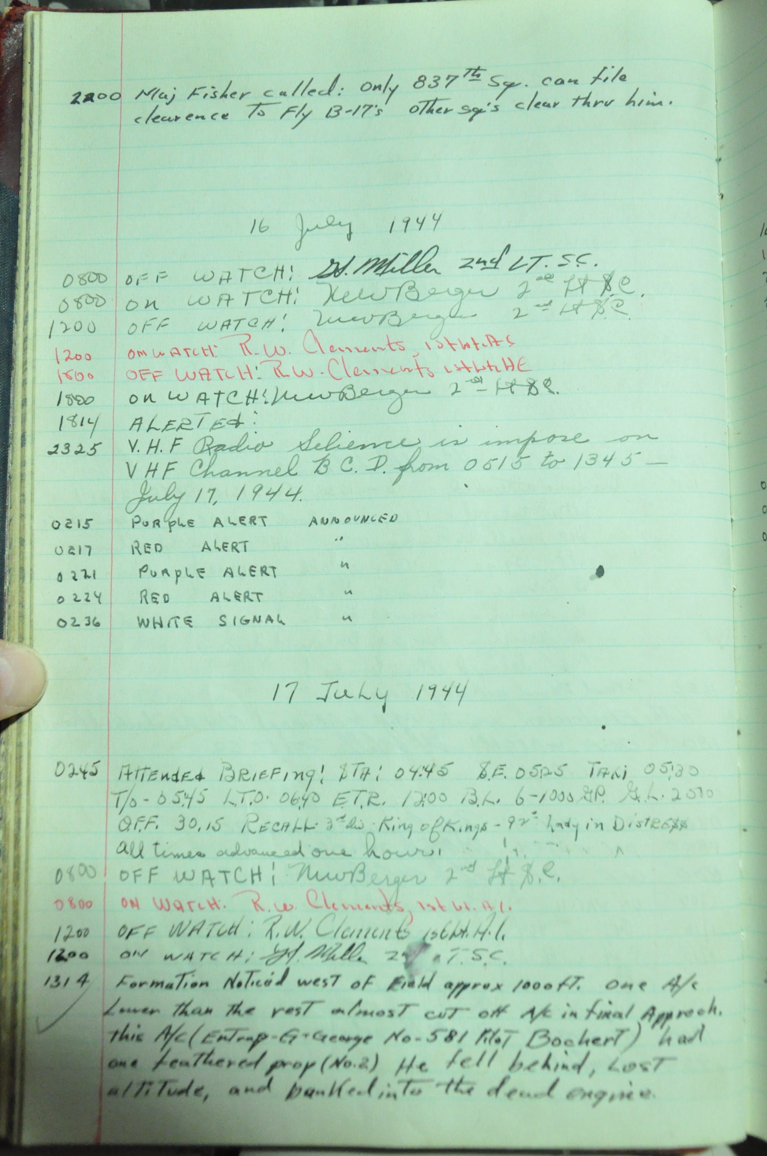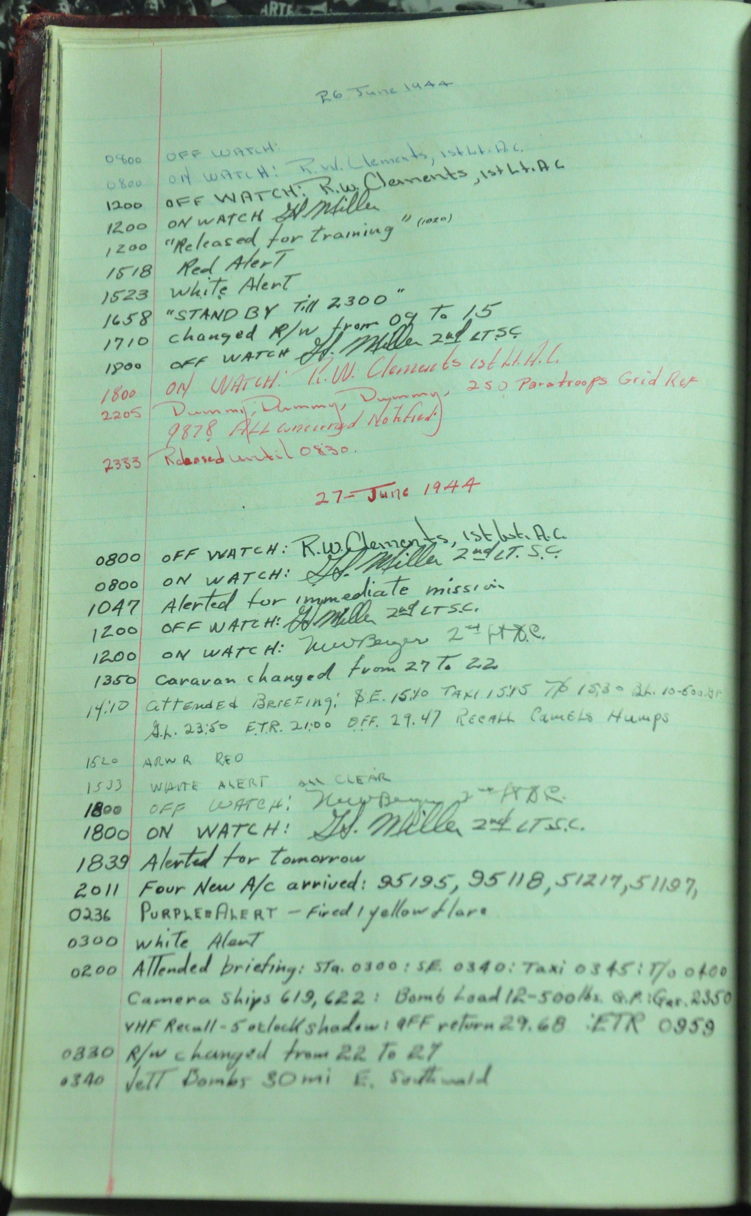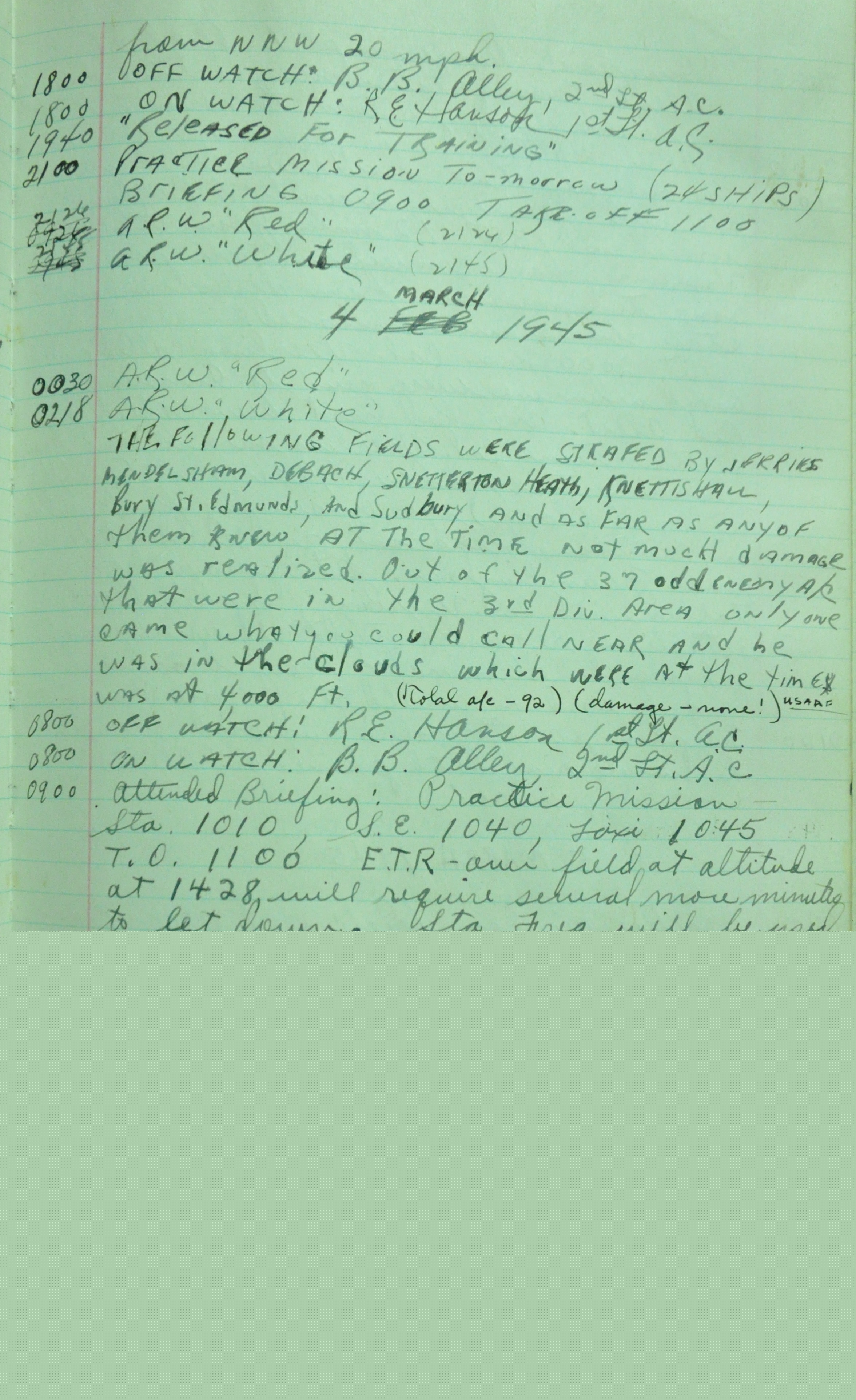 the pages of the 487th Tower Log book that is at the museum. It contains notes by the control tower officers relative to operations
