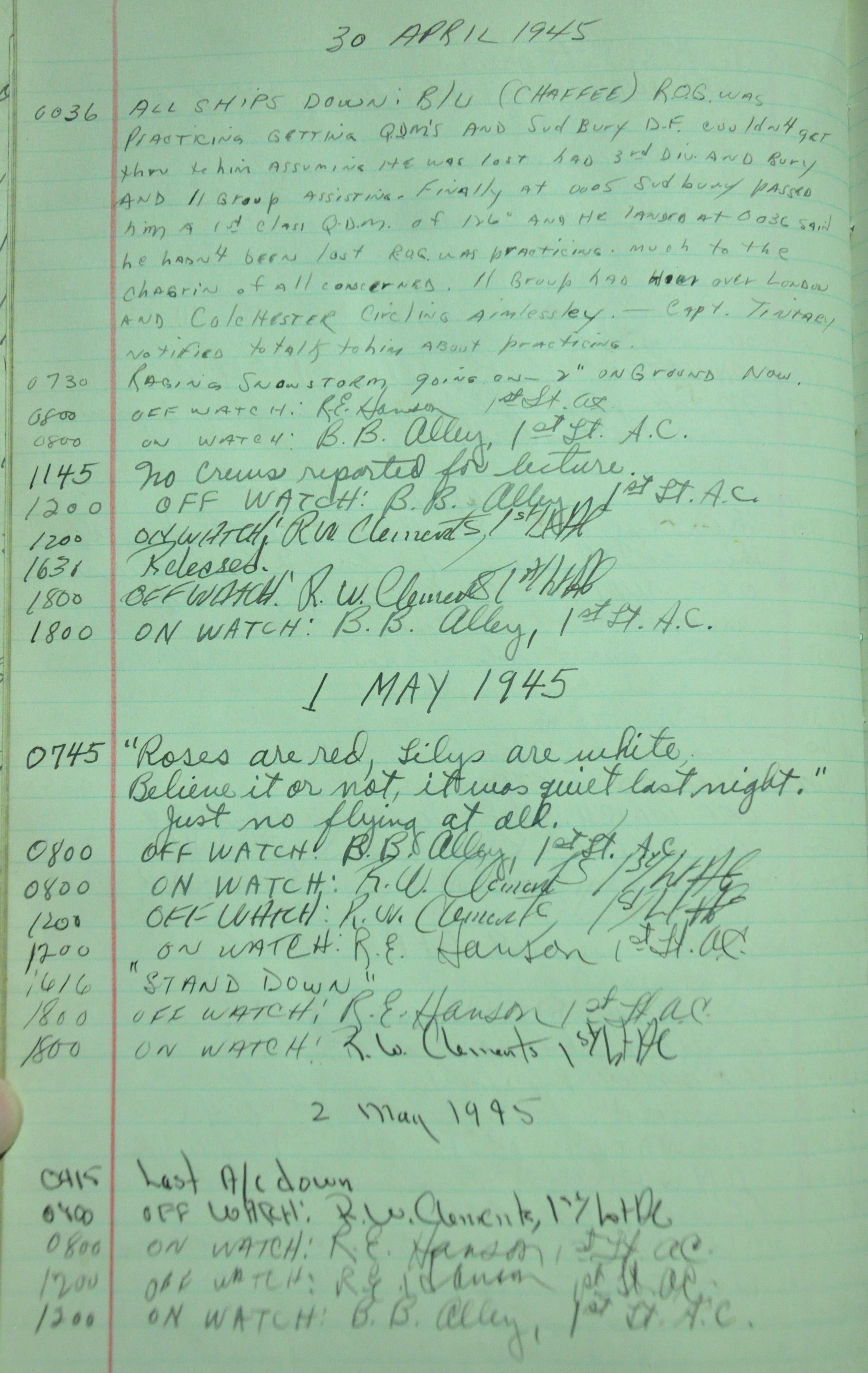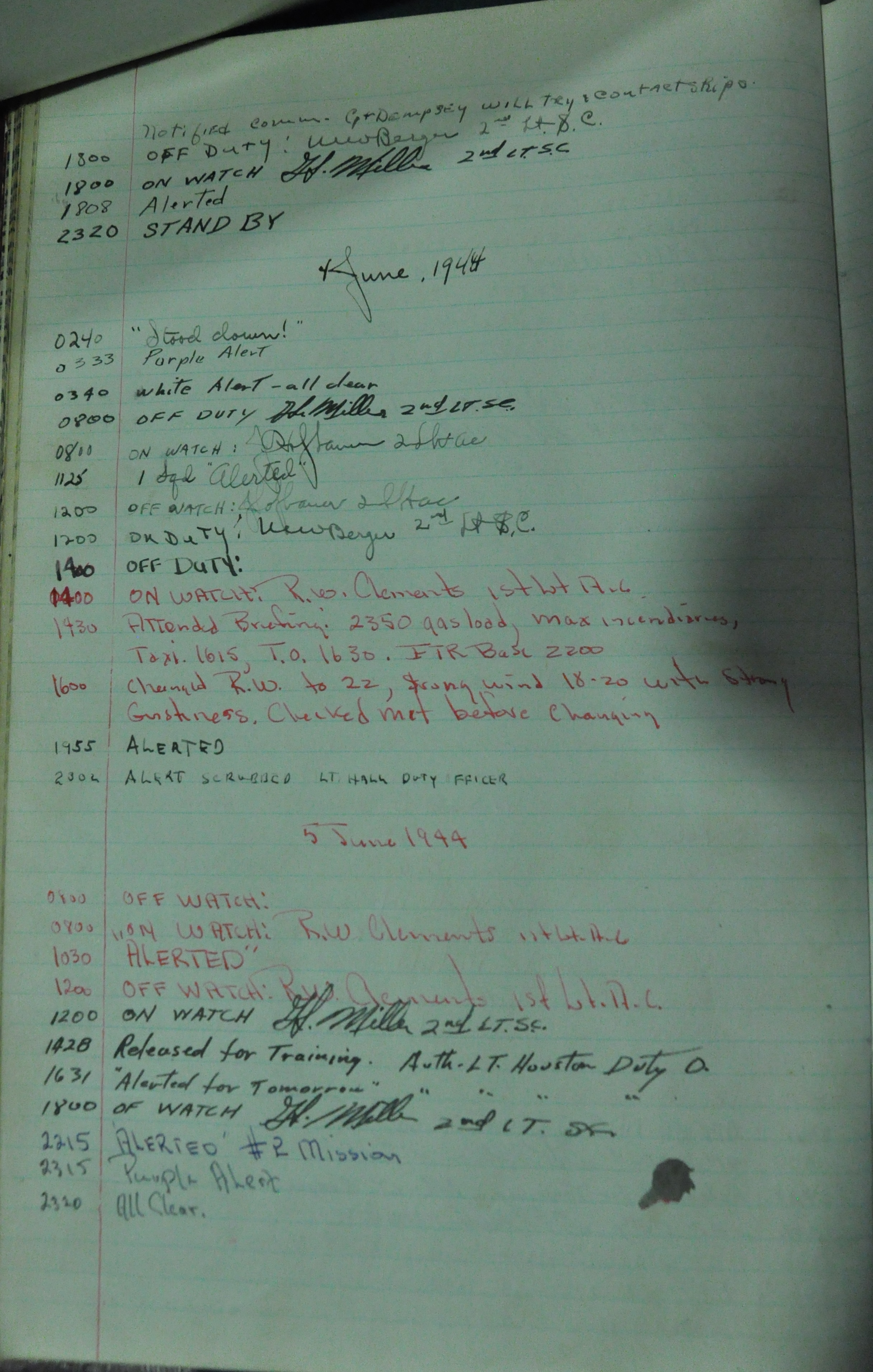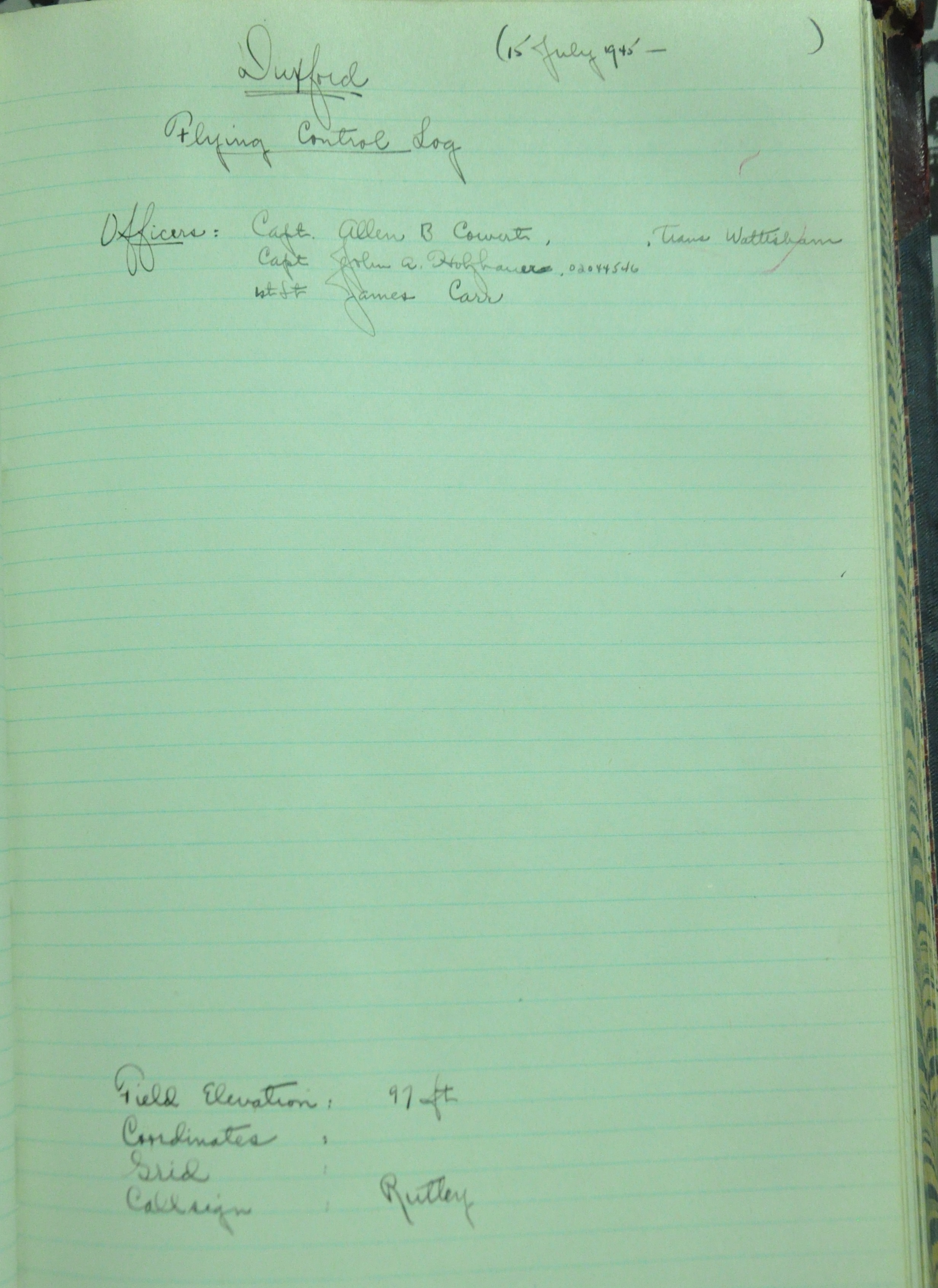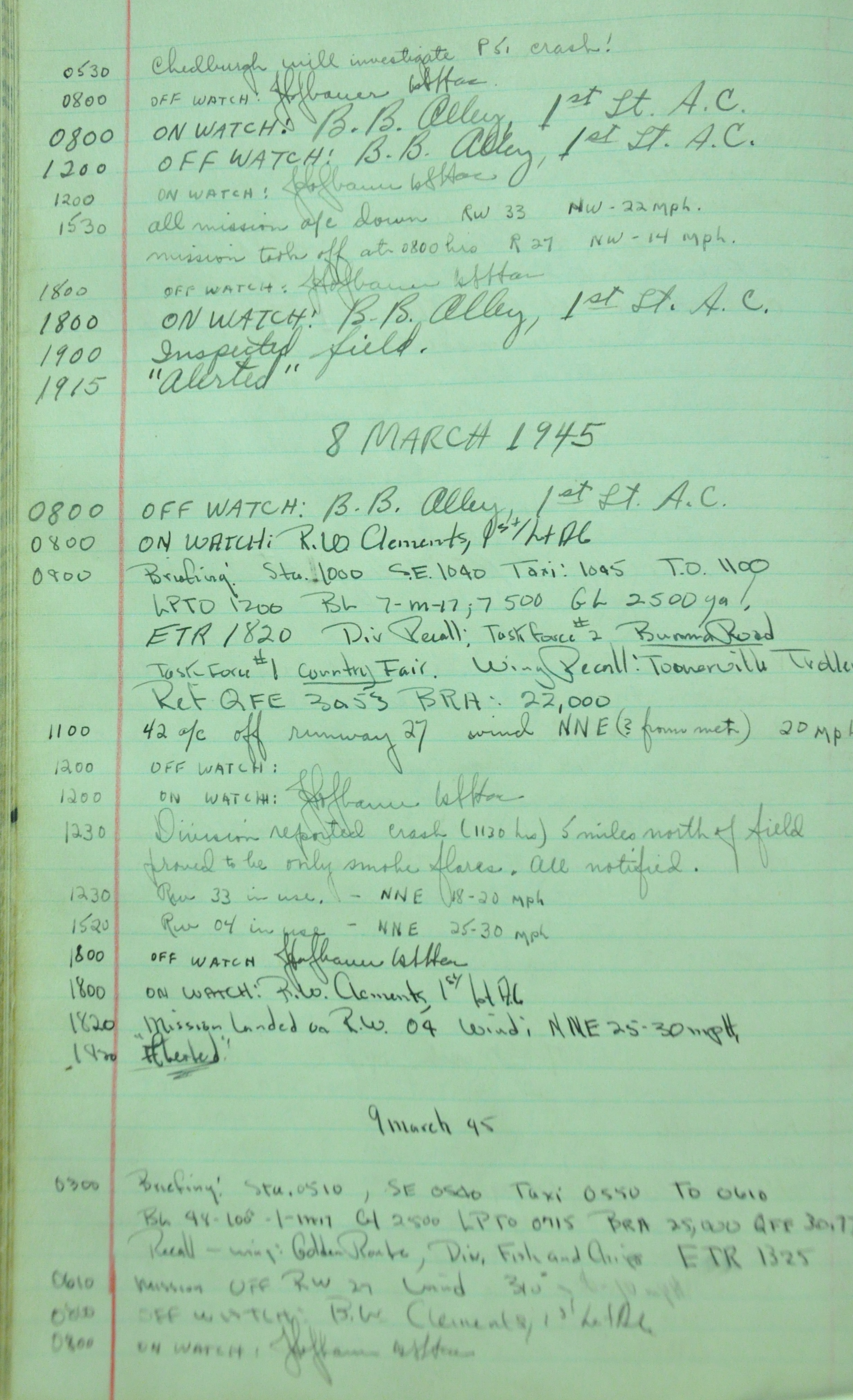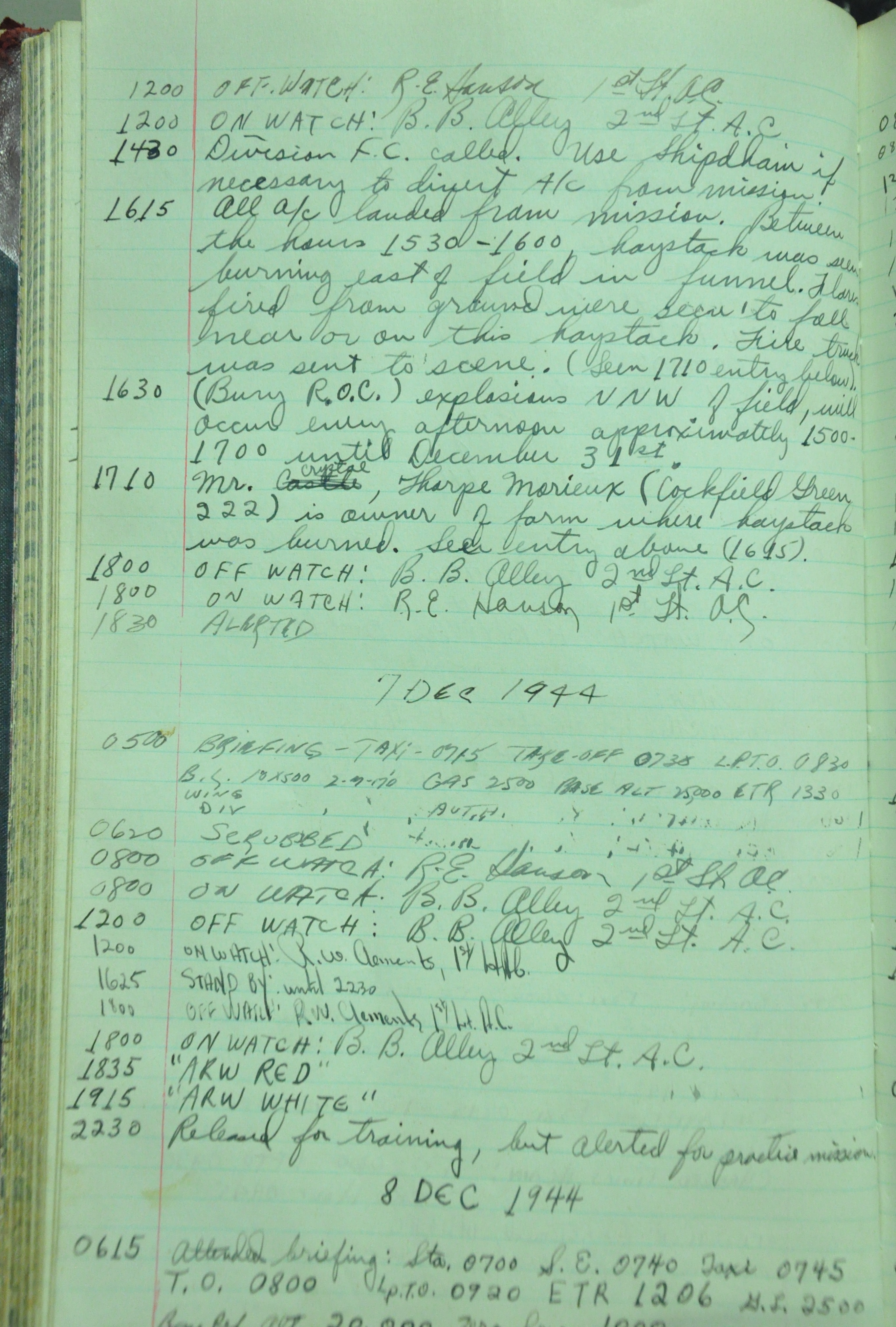 the pages of the 487th Tower Log book that is at the museum. It contains notes by the control tower officers relative to operations