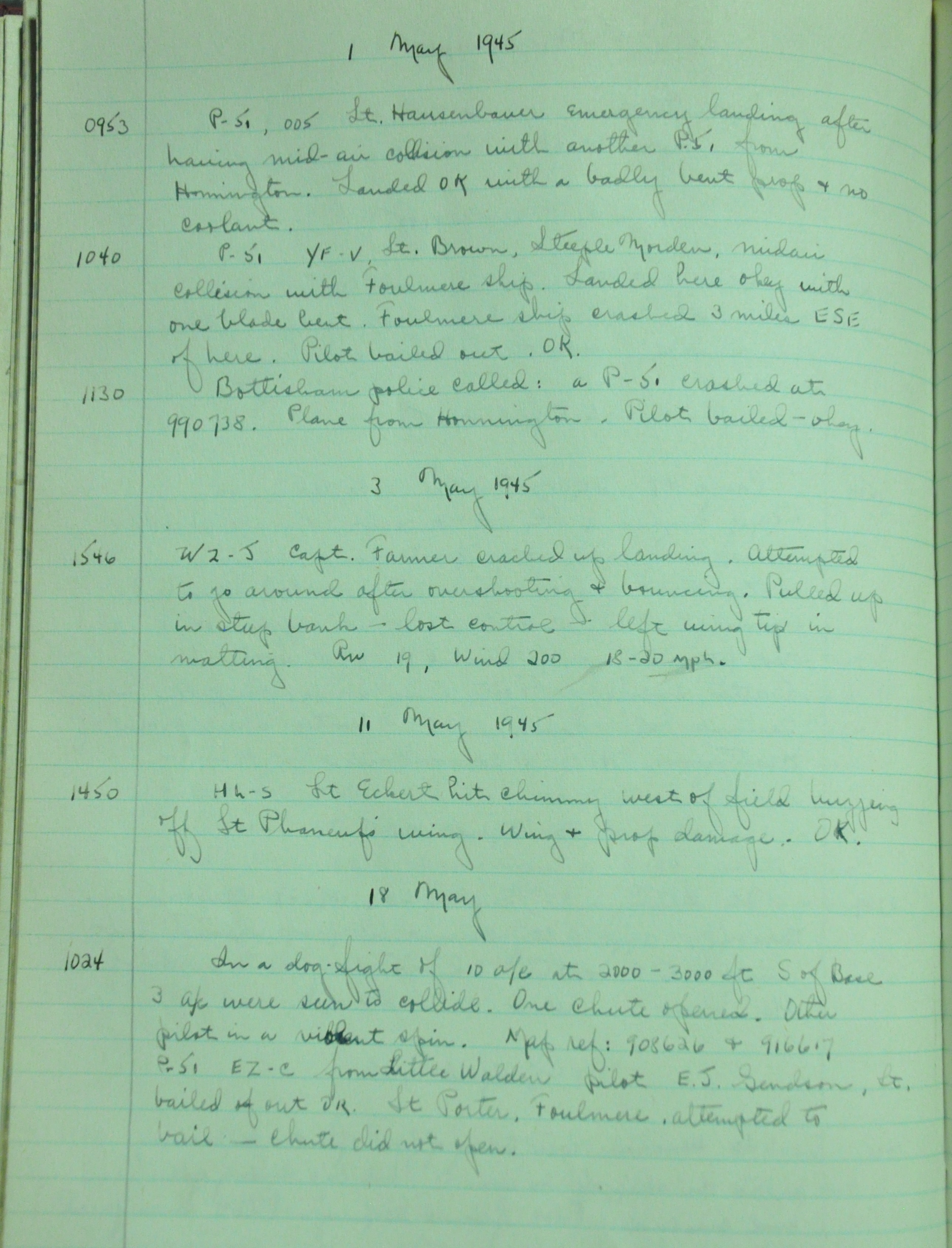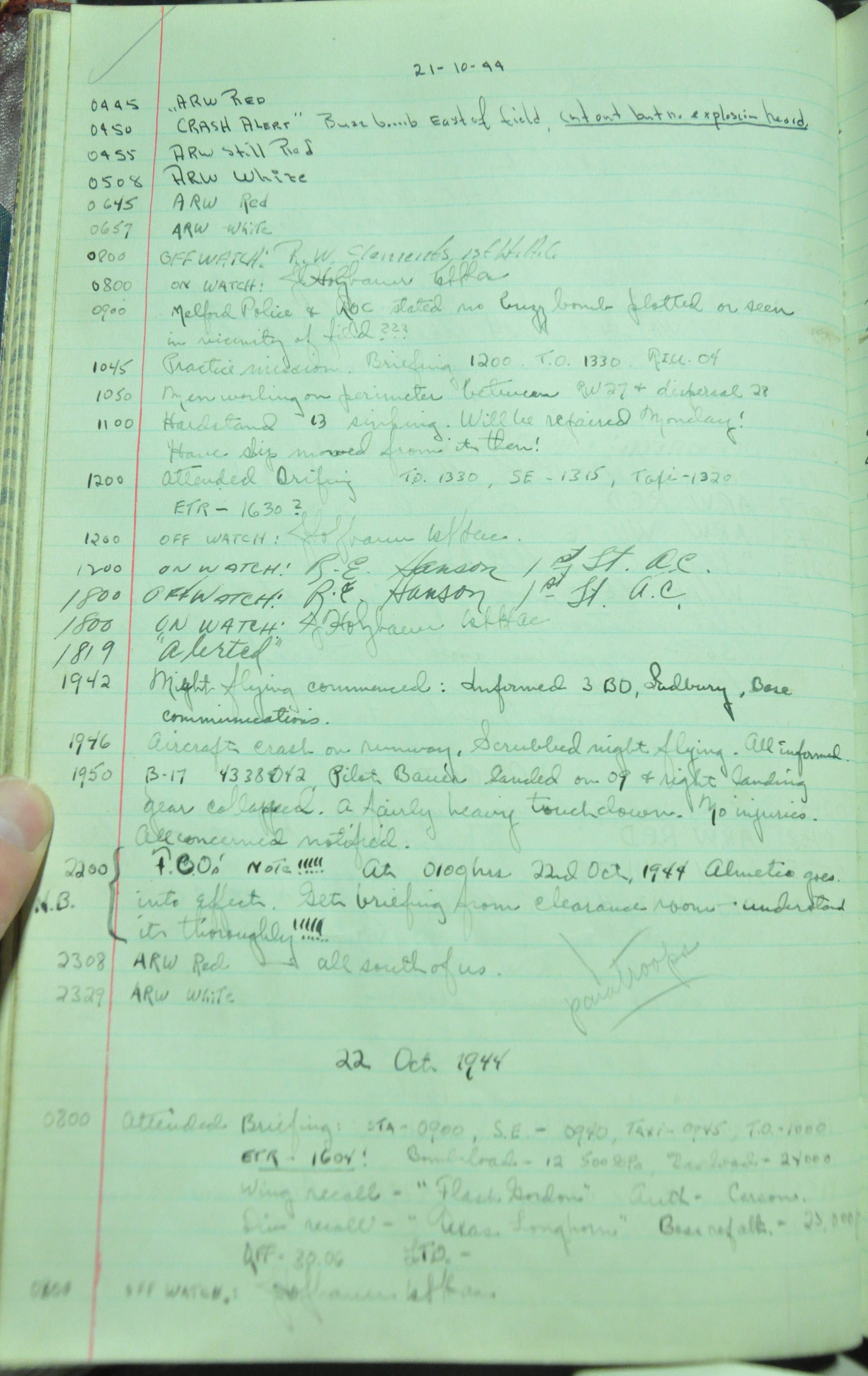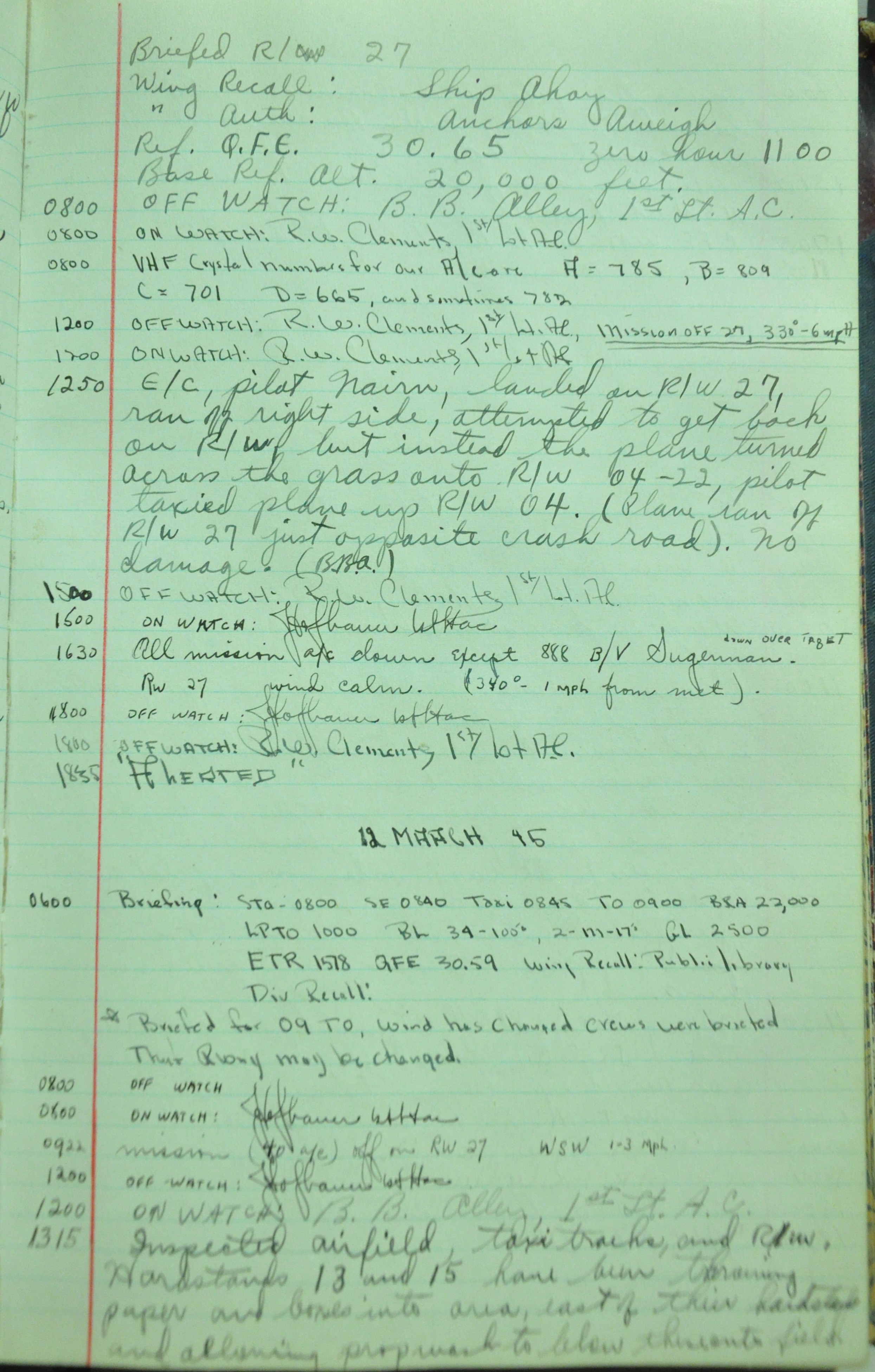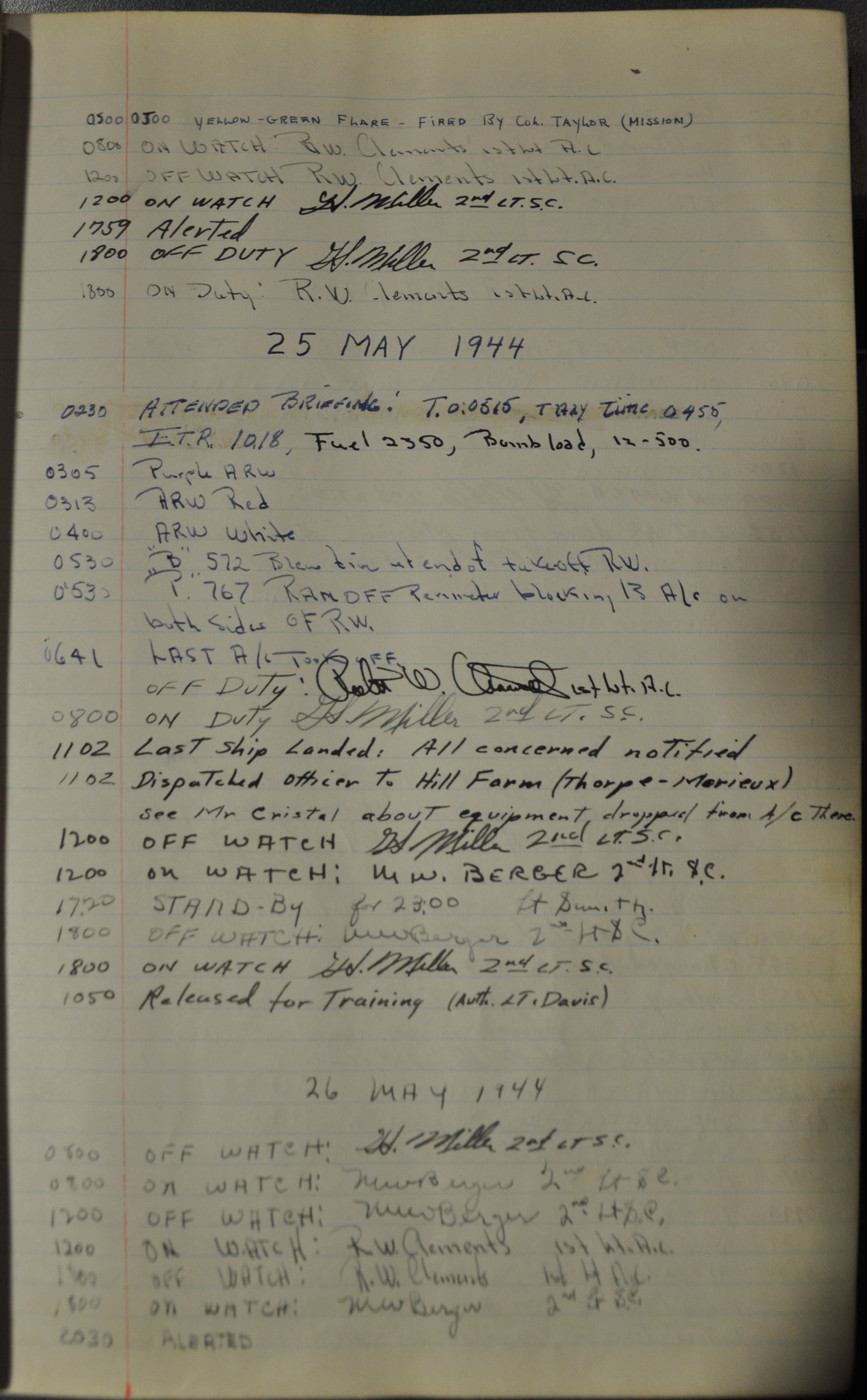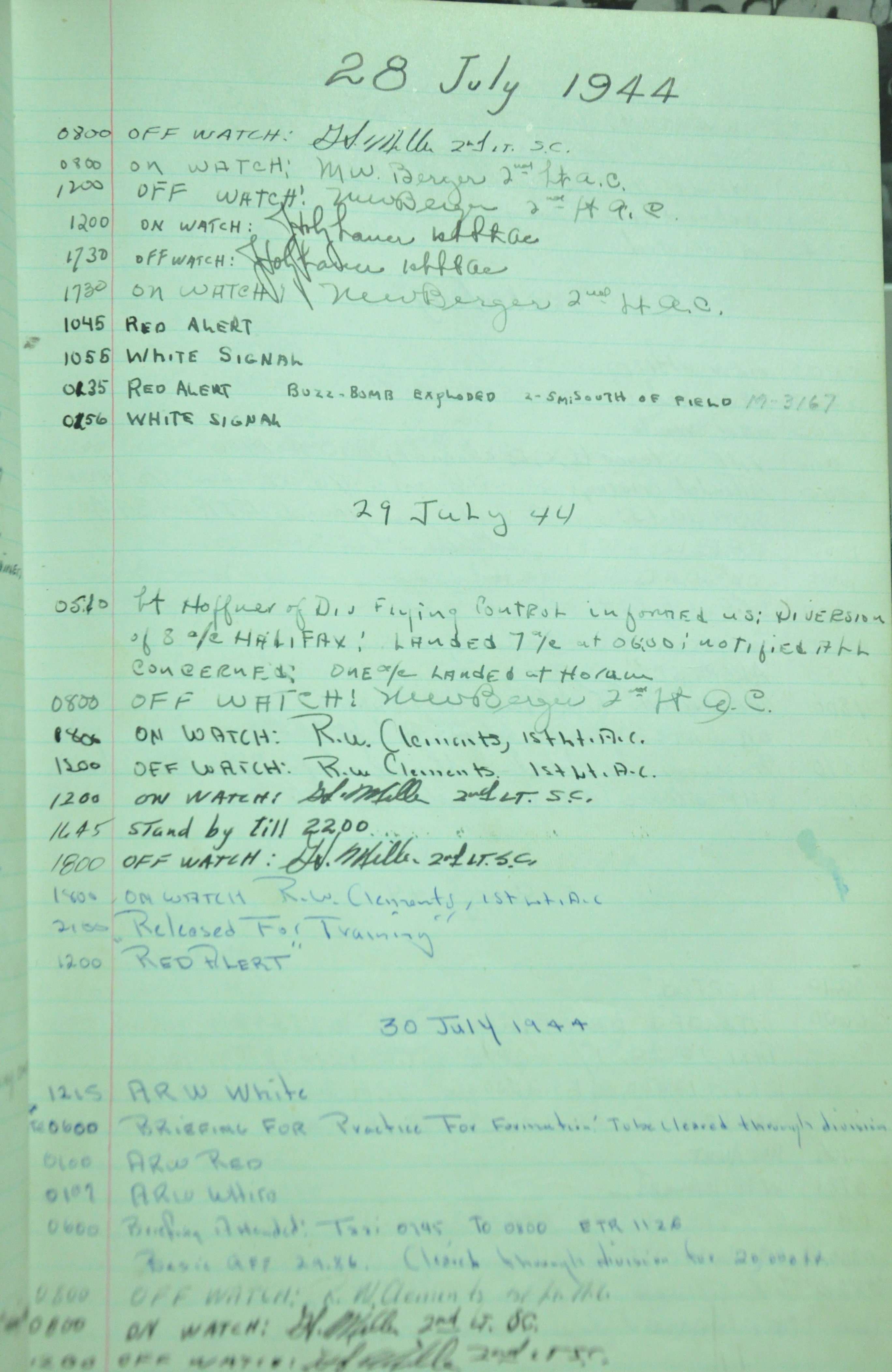 the pages of the 487th Tower Log book that is at the museum. It contains notes by the control tower officers relative to operations