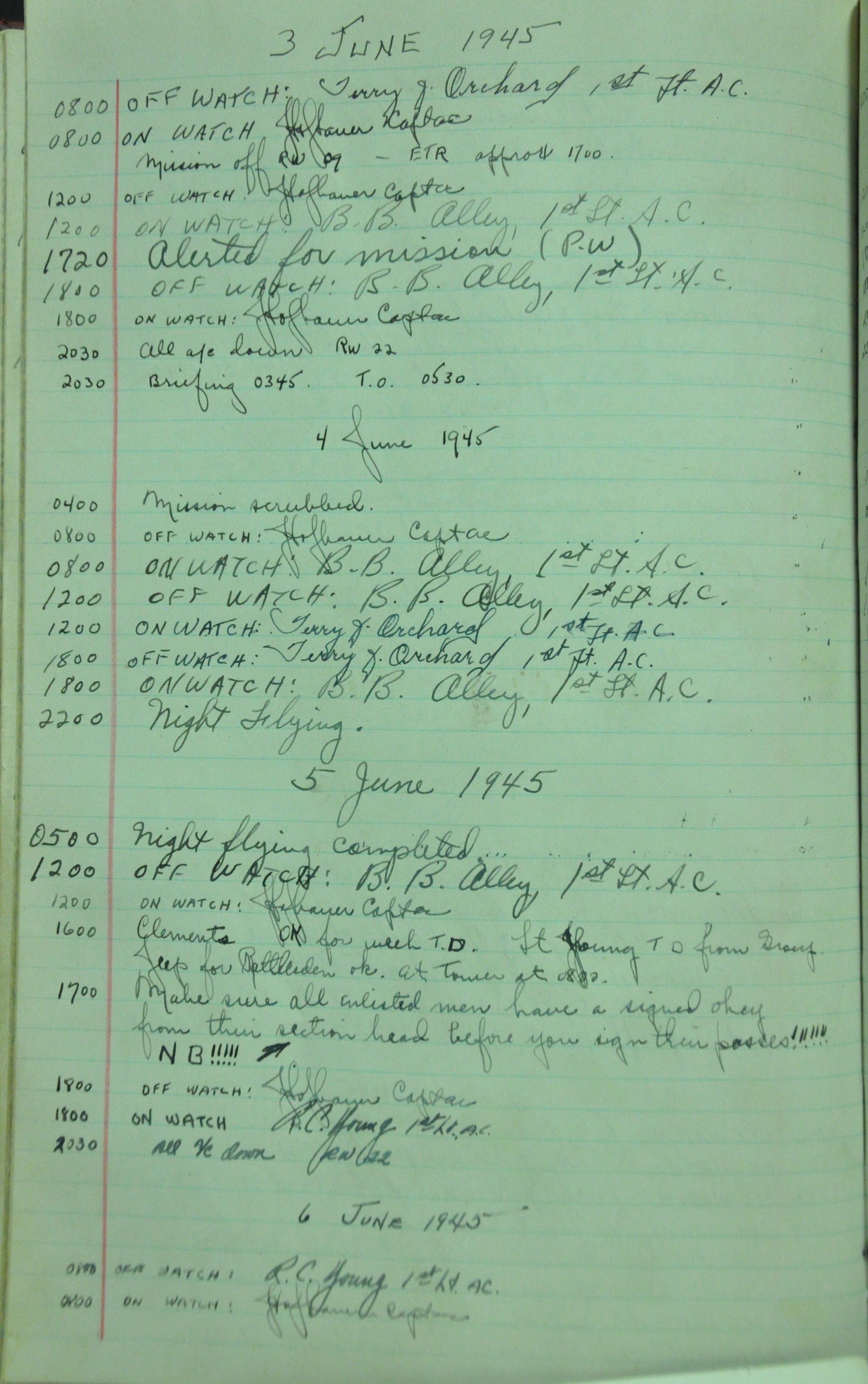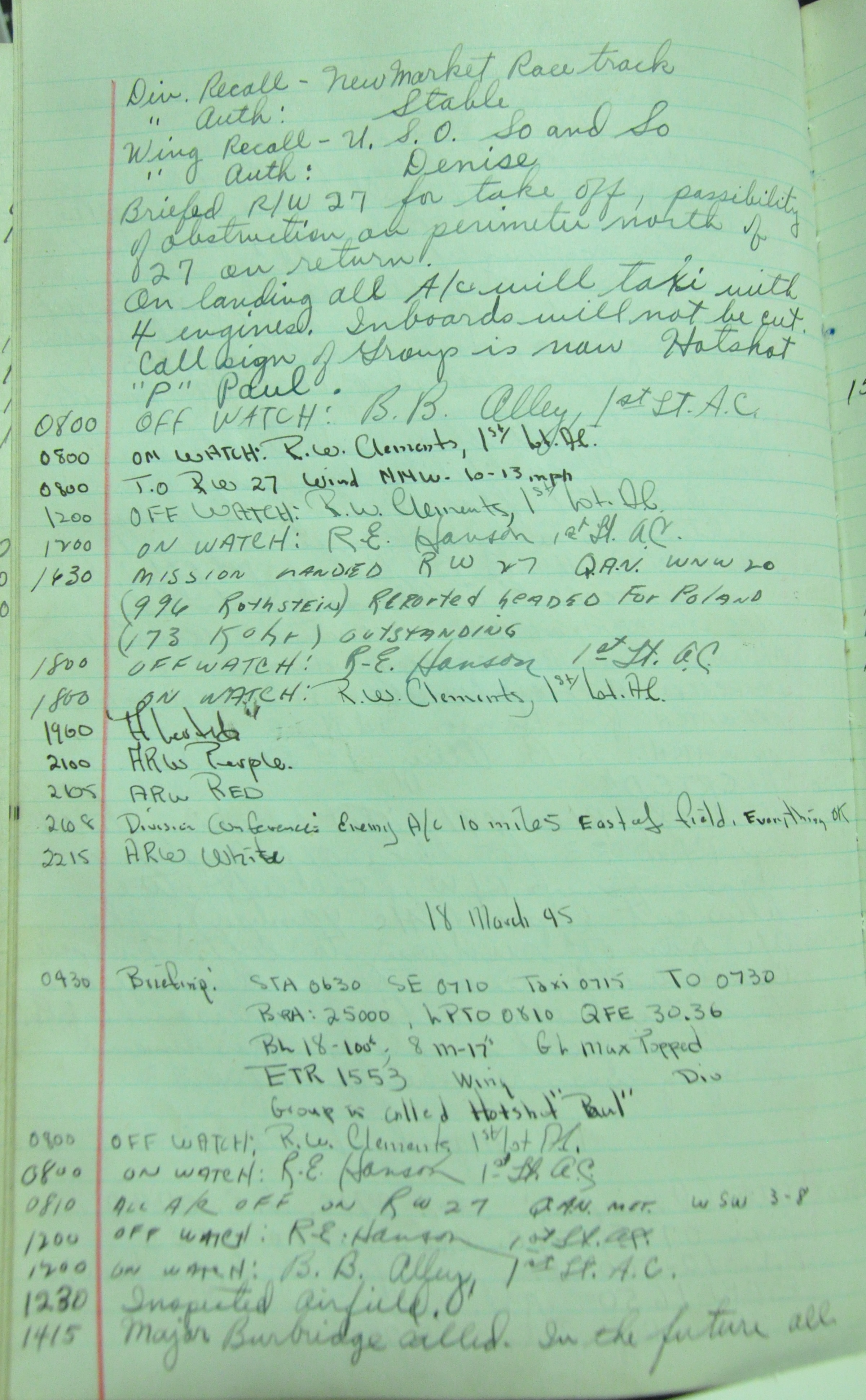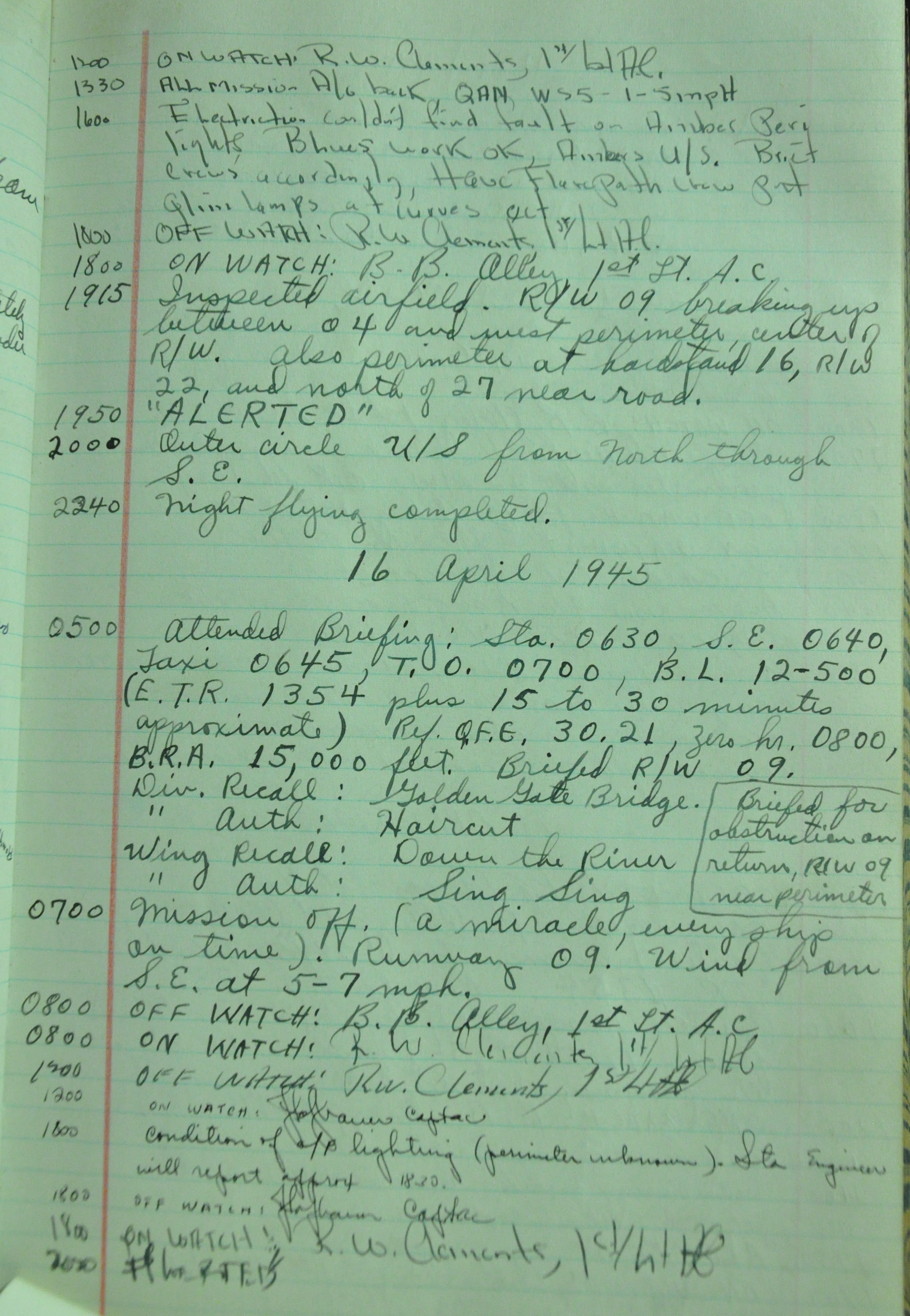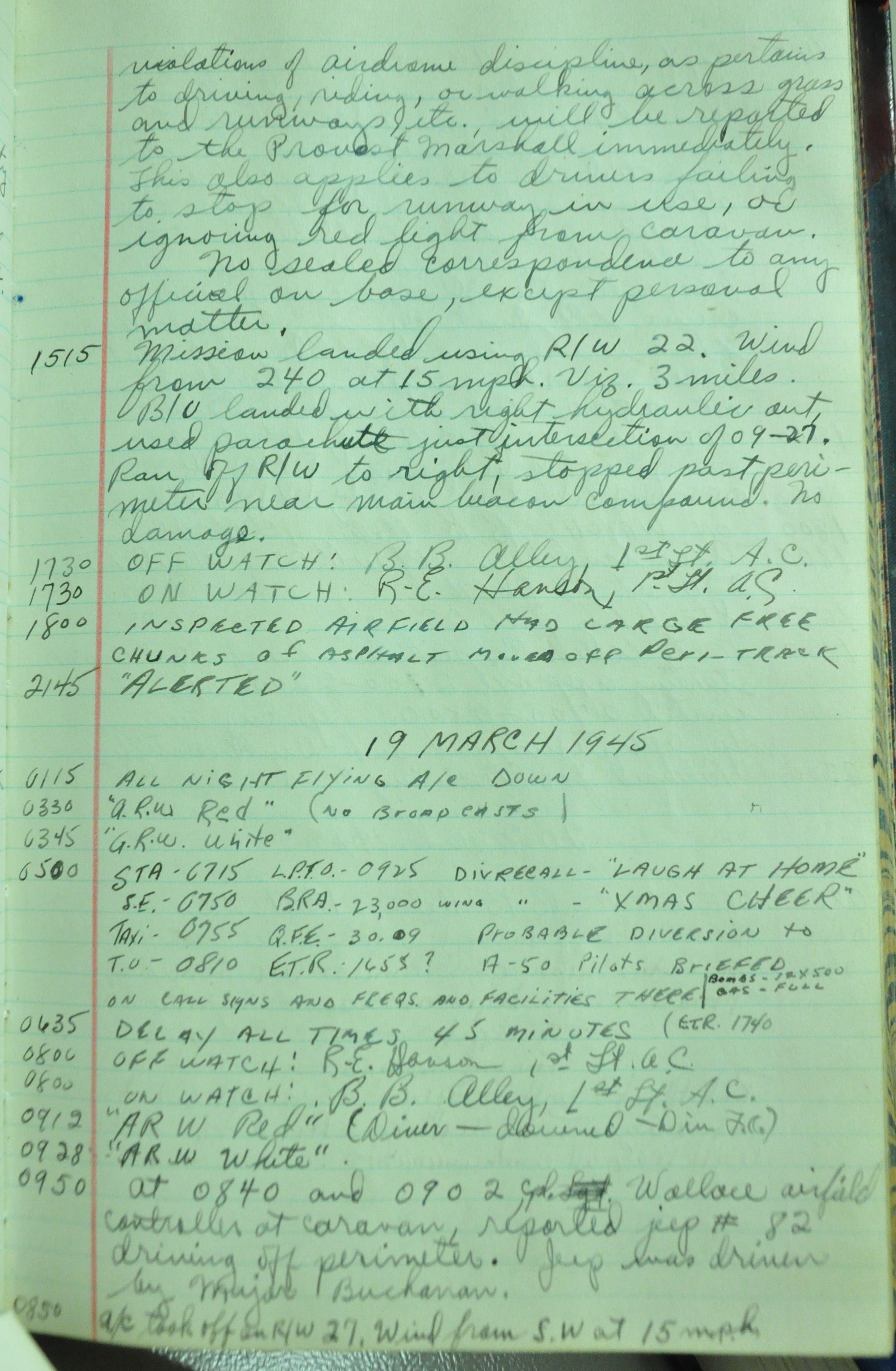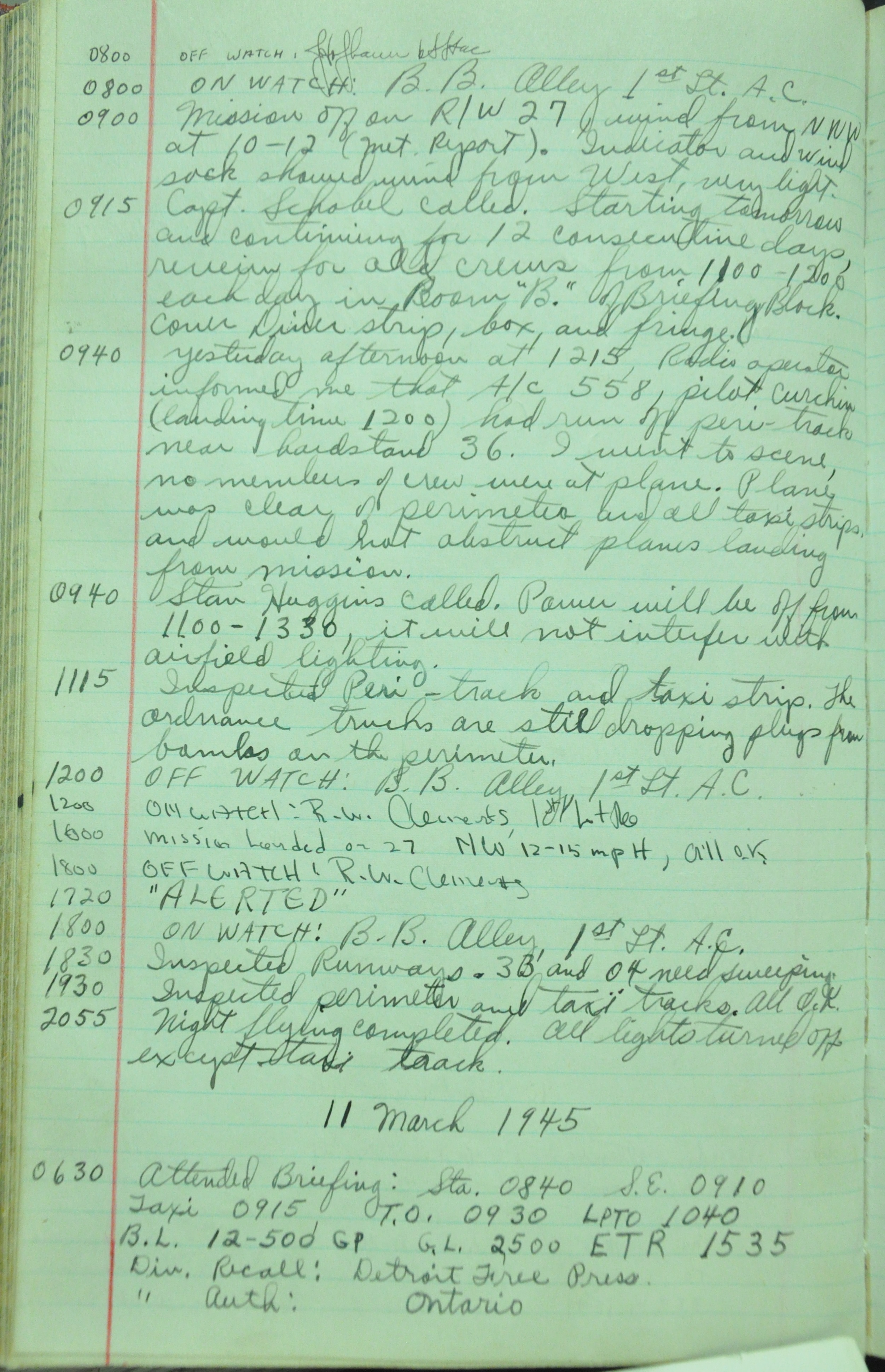 the pages of the 487th Tower Log book that is at the museum. It contains notes by the control tower officers relative to operations