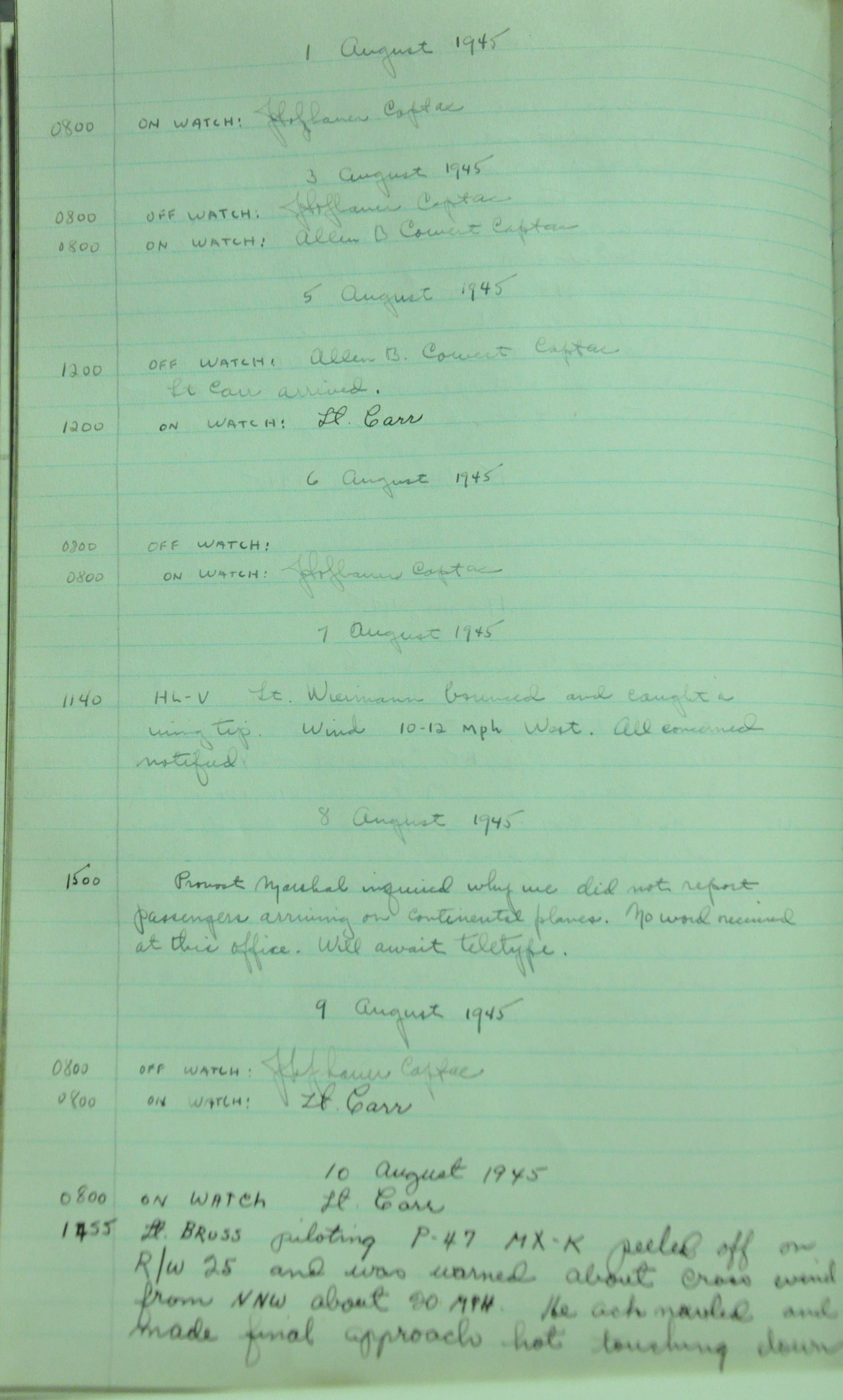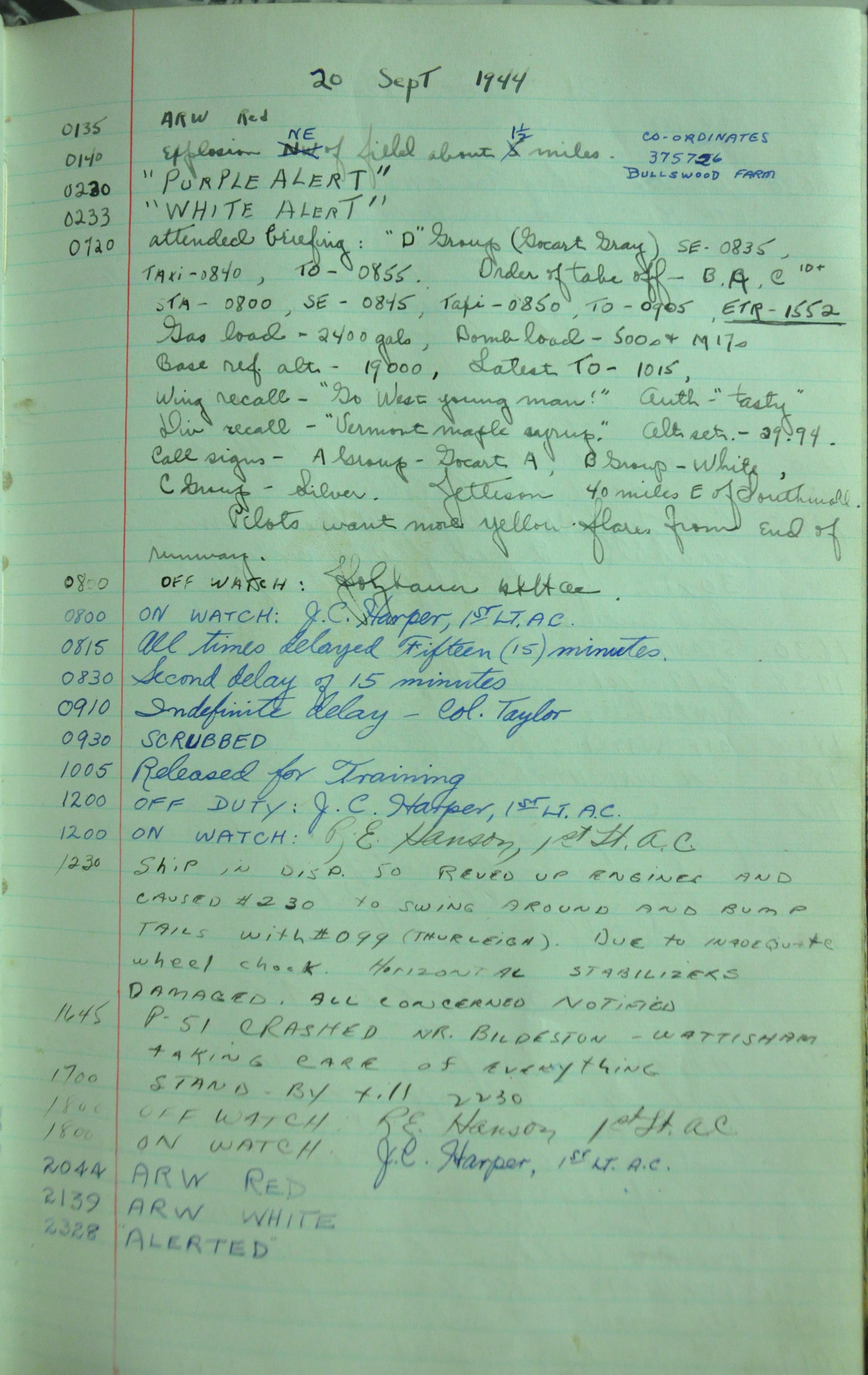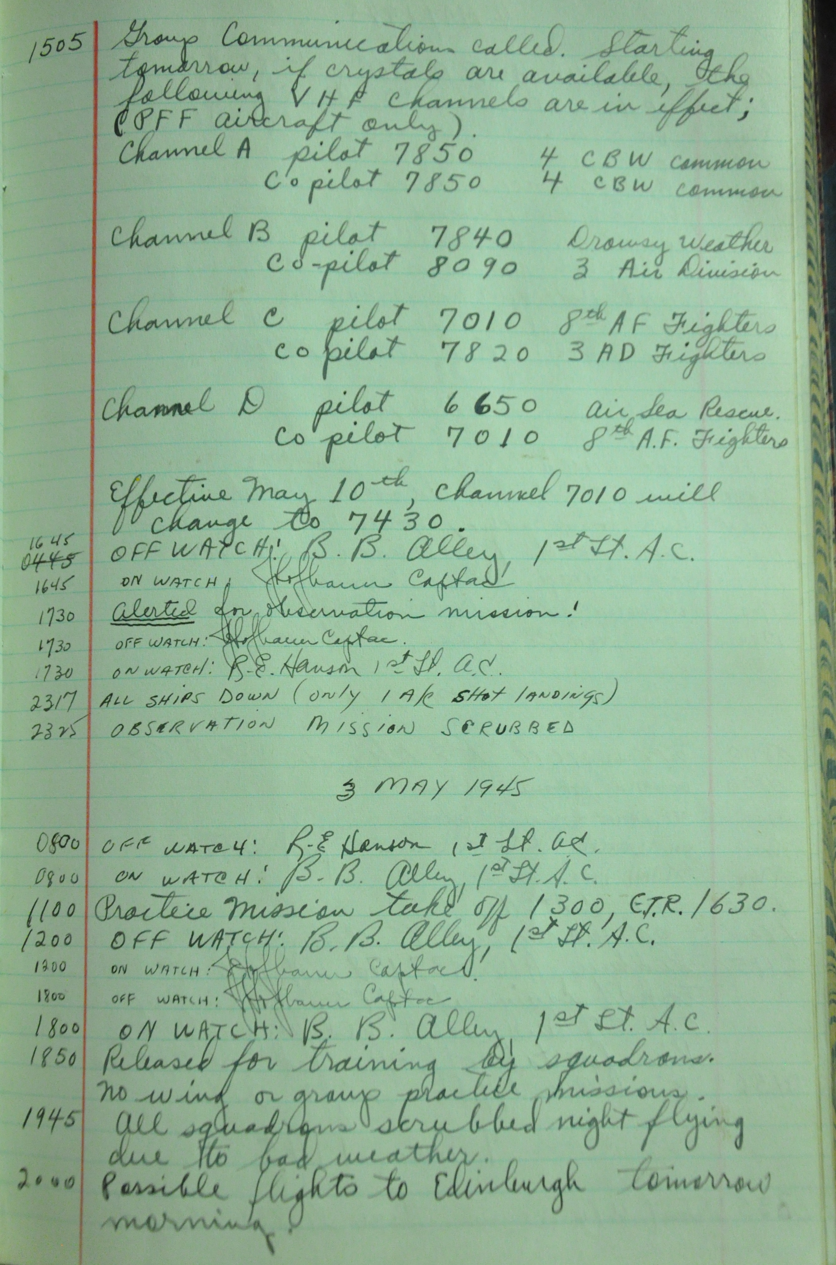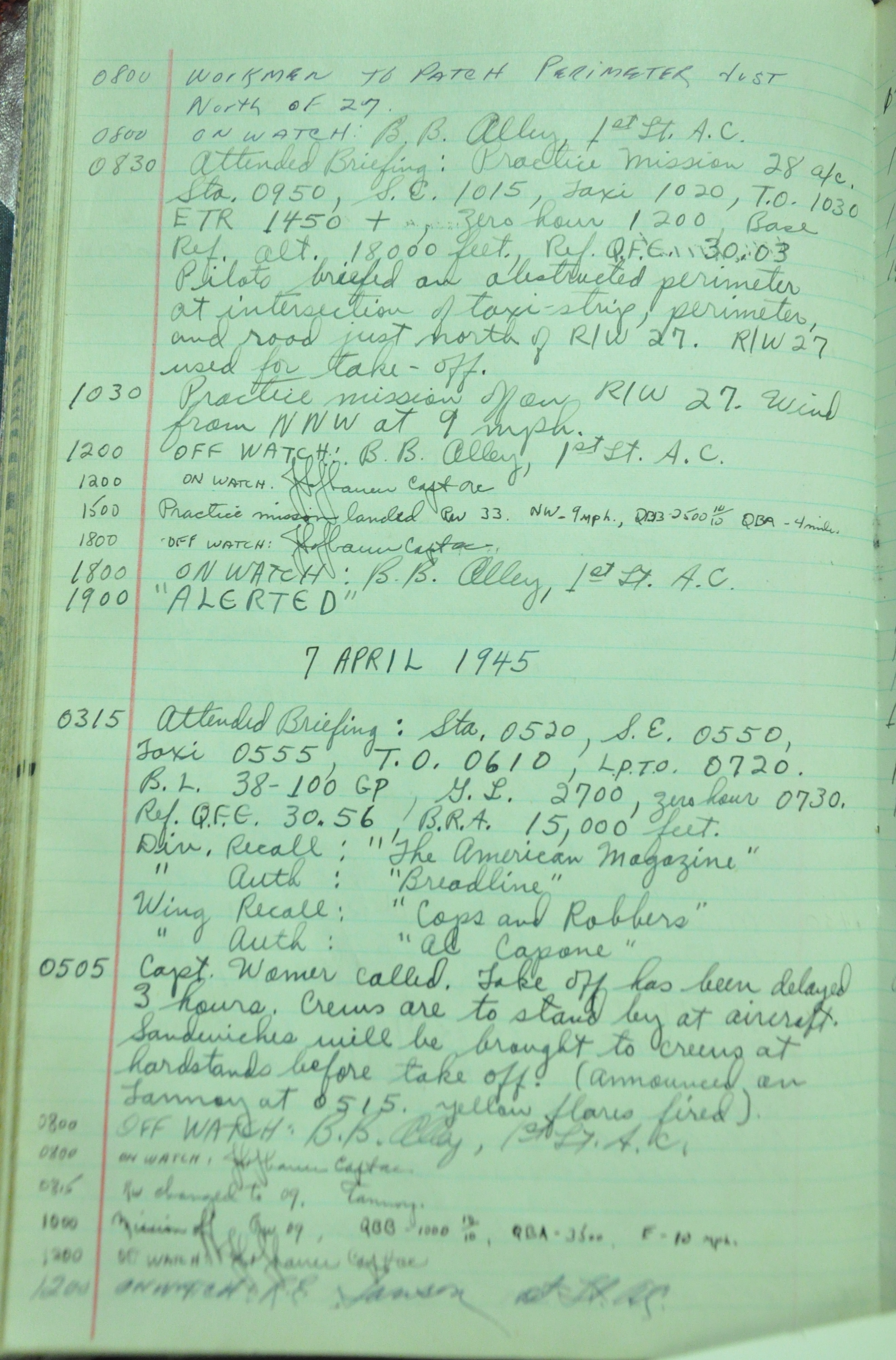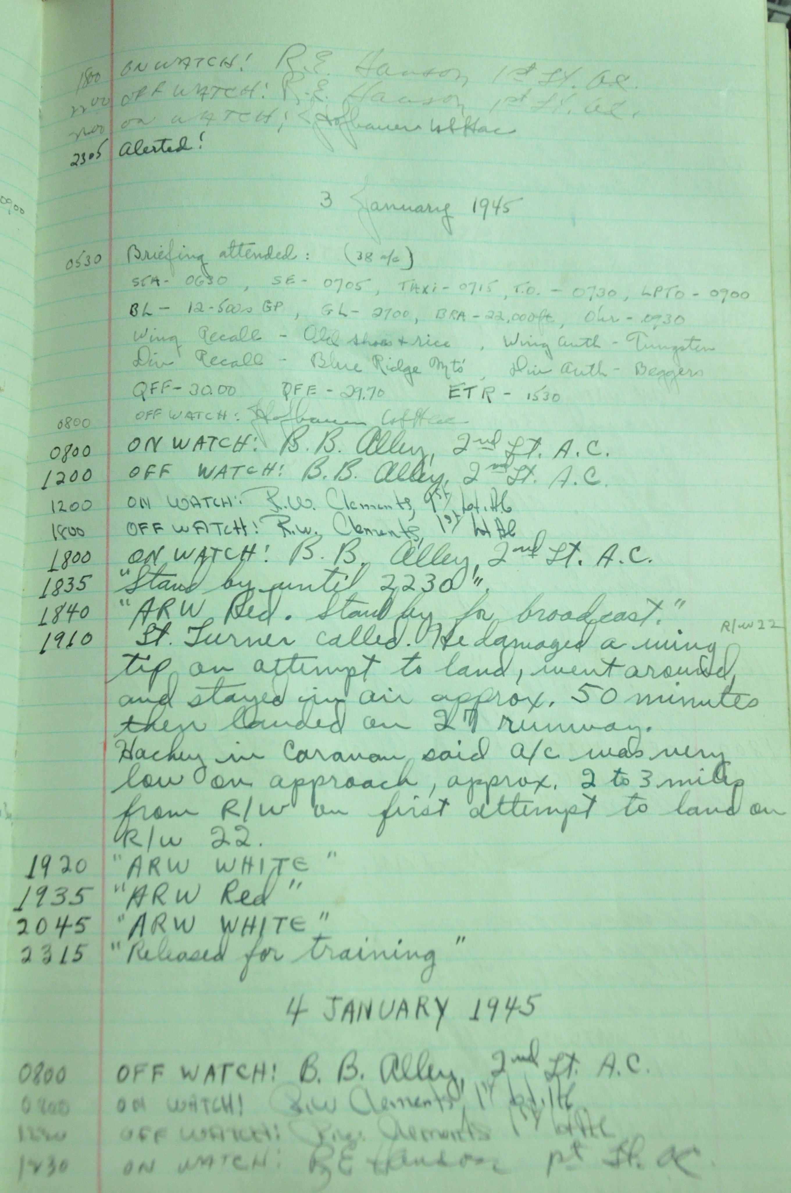 the pages of the 487th Tower Log book that is at the museum. It contains notes by the control tower officers relative to operations