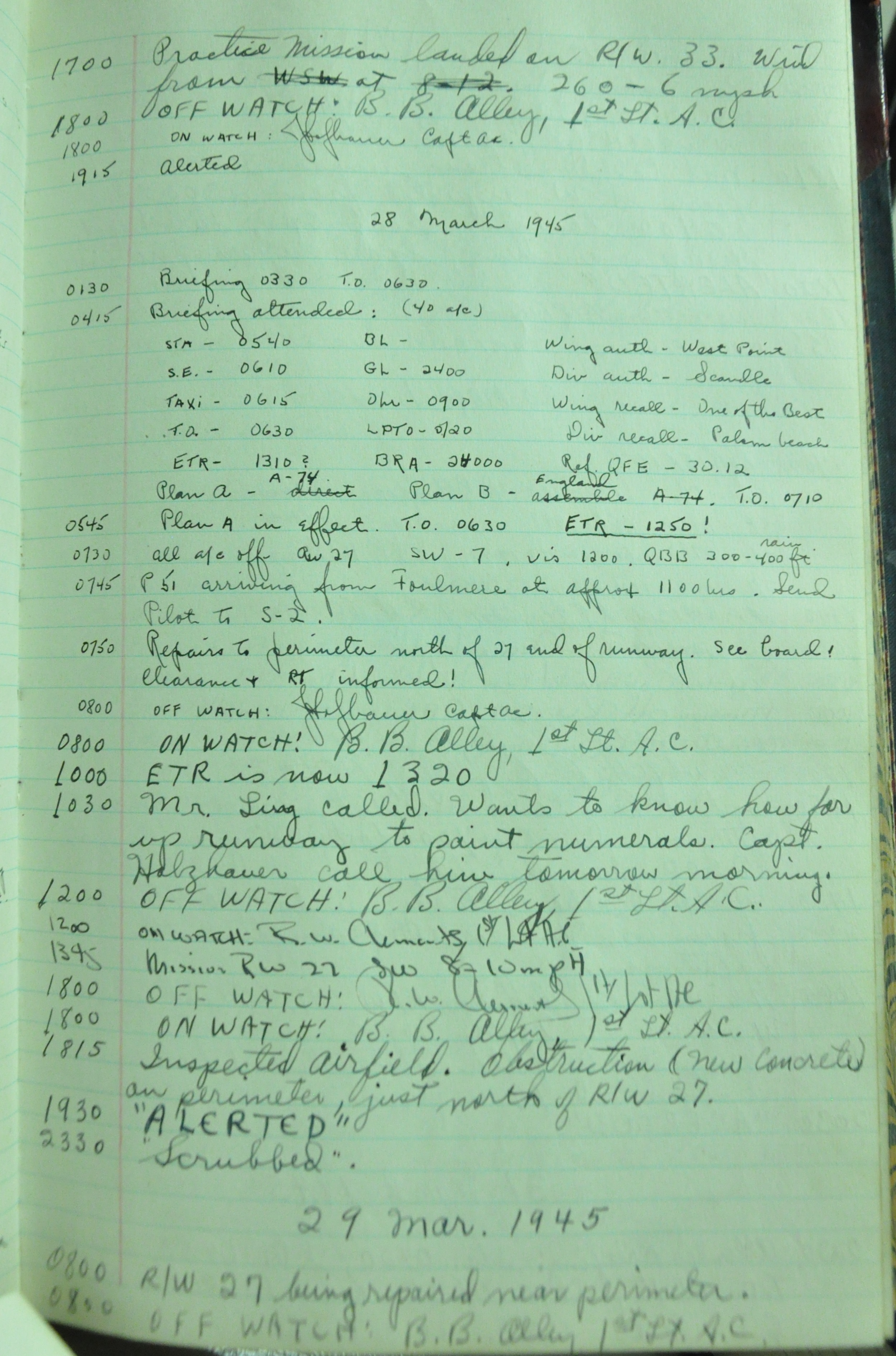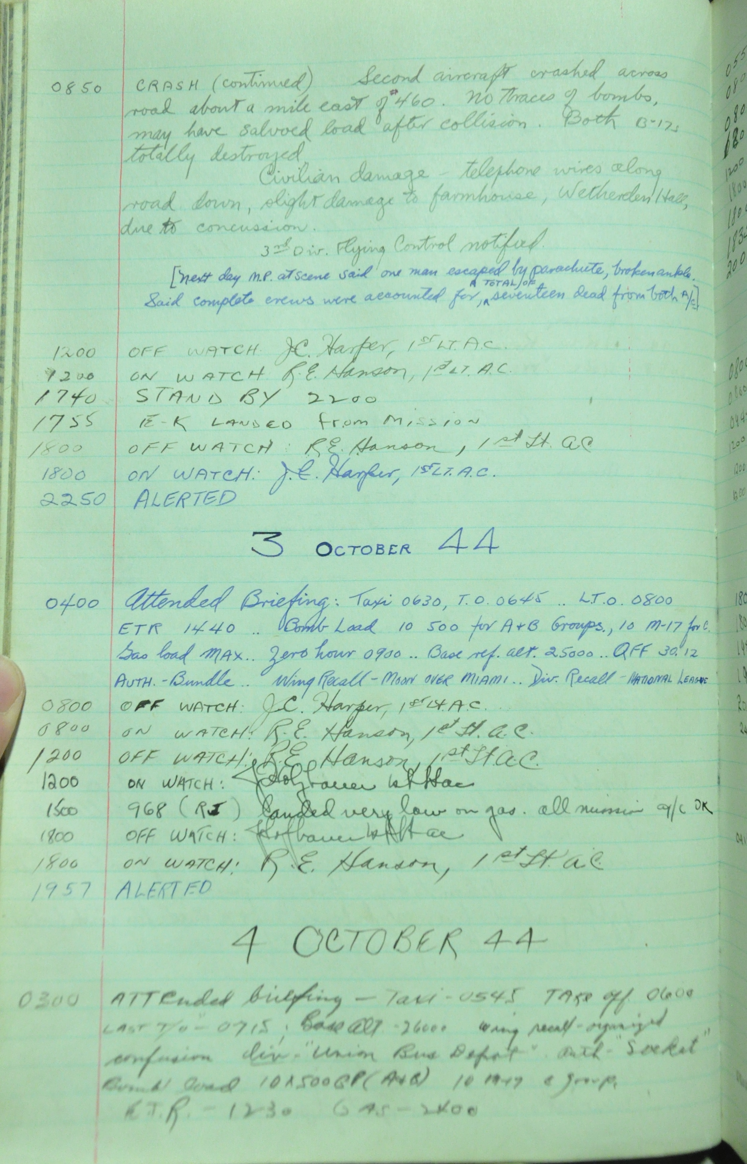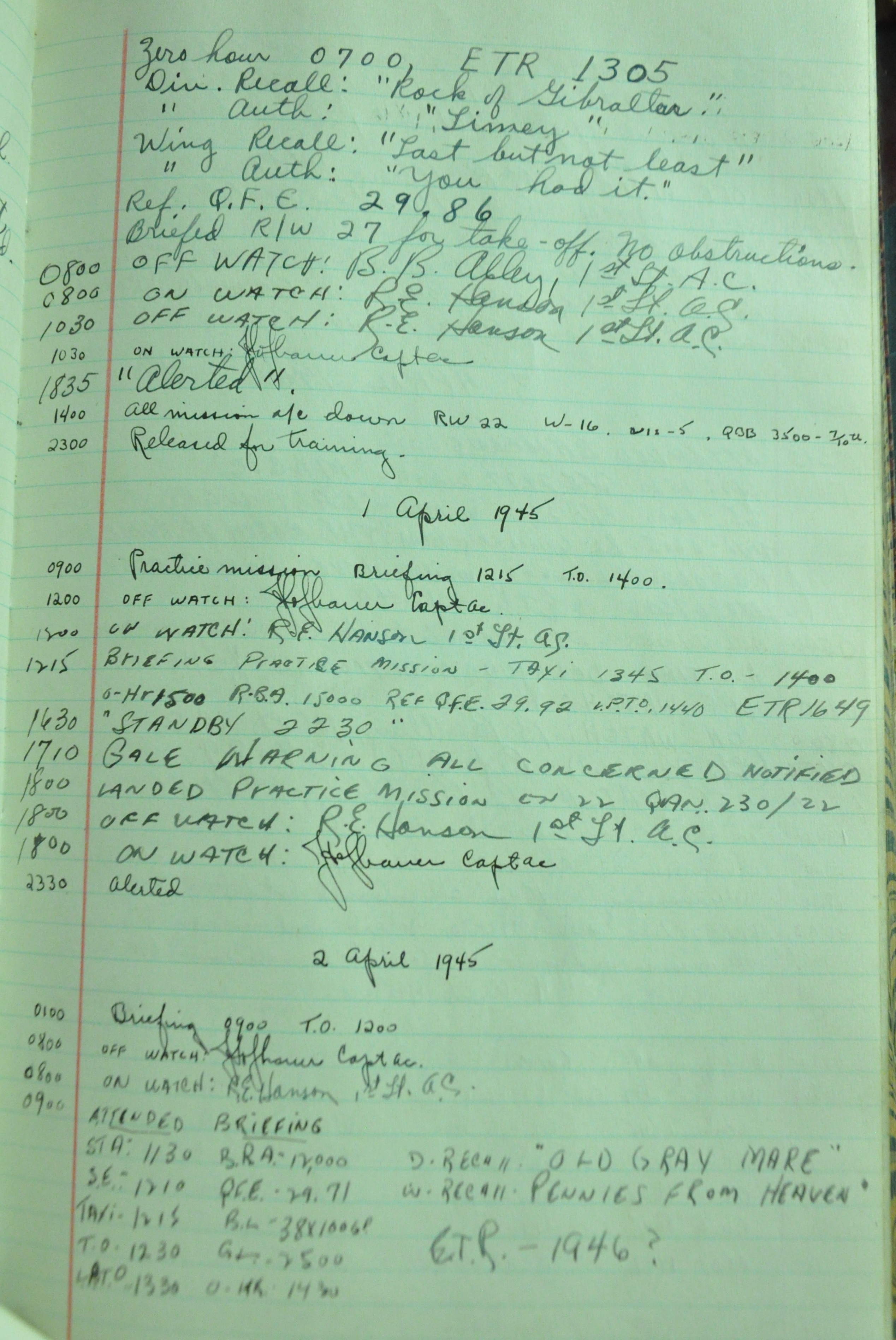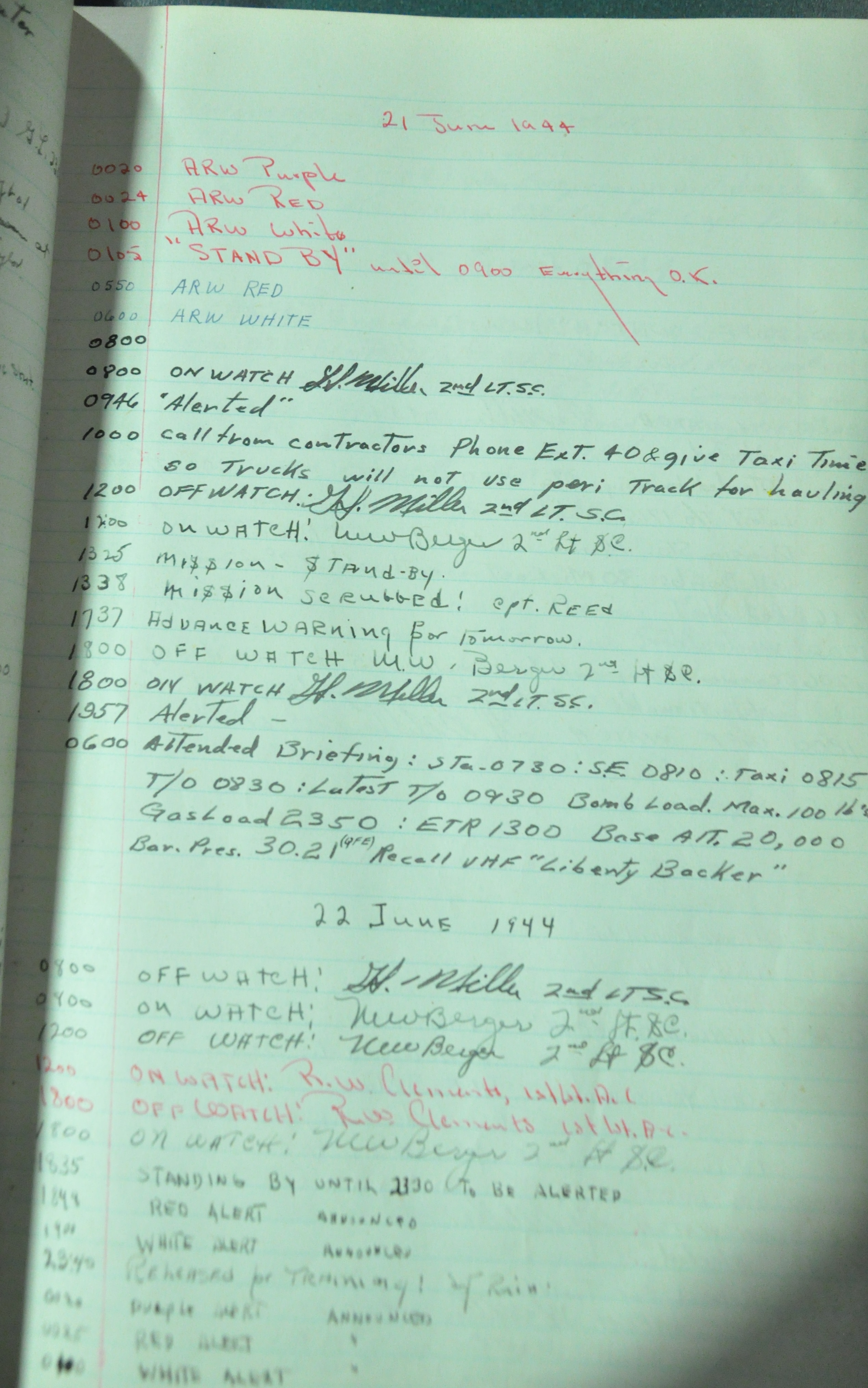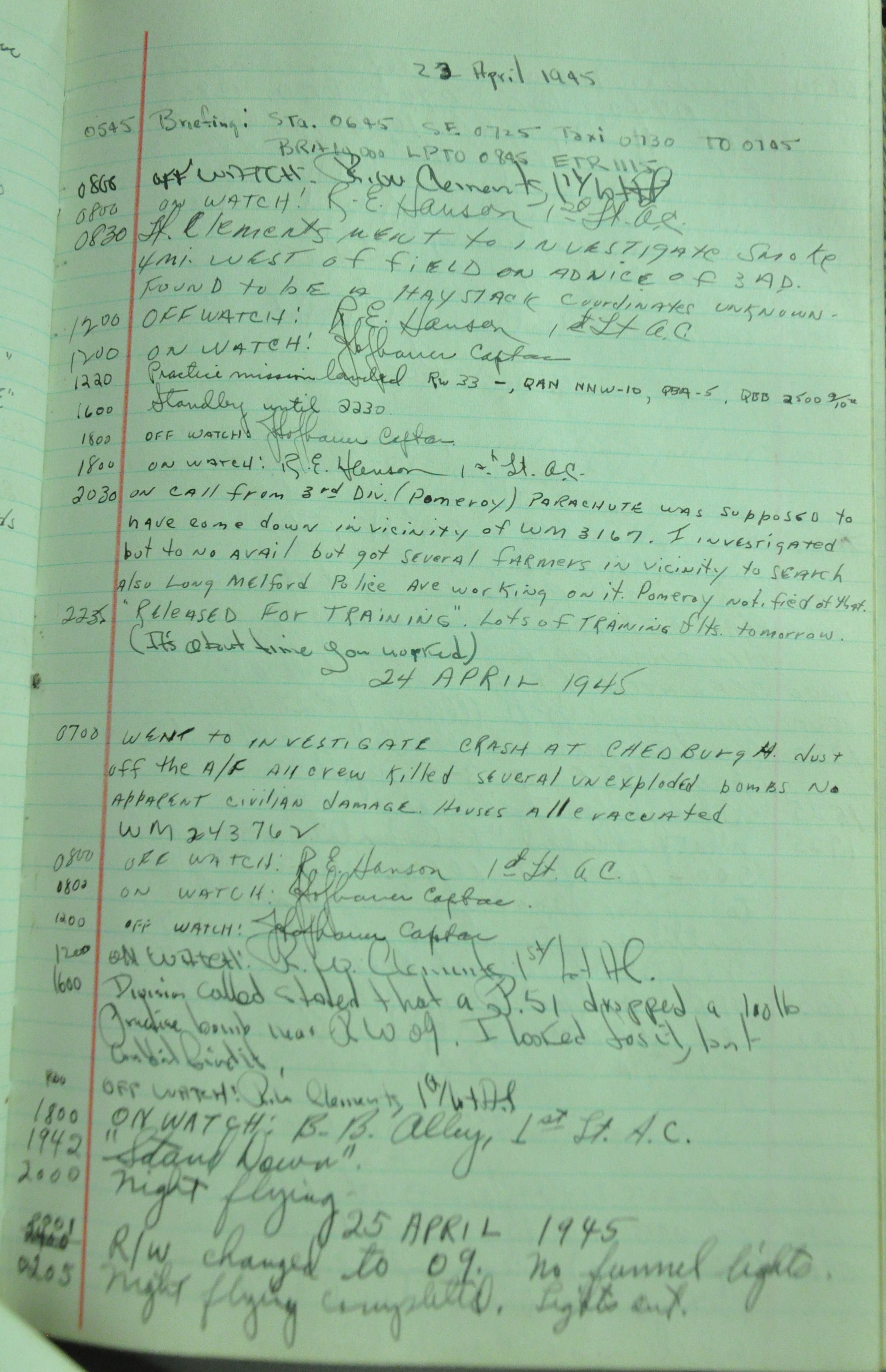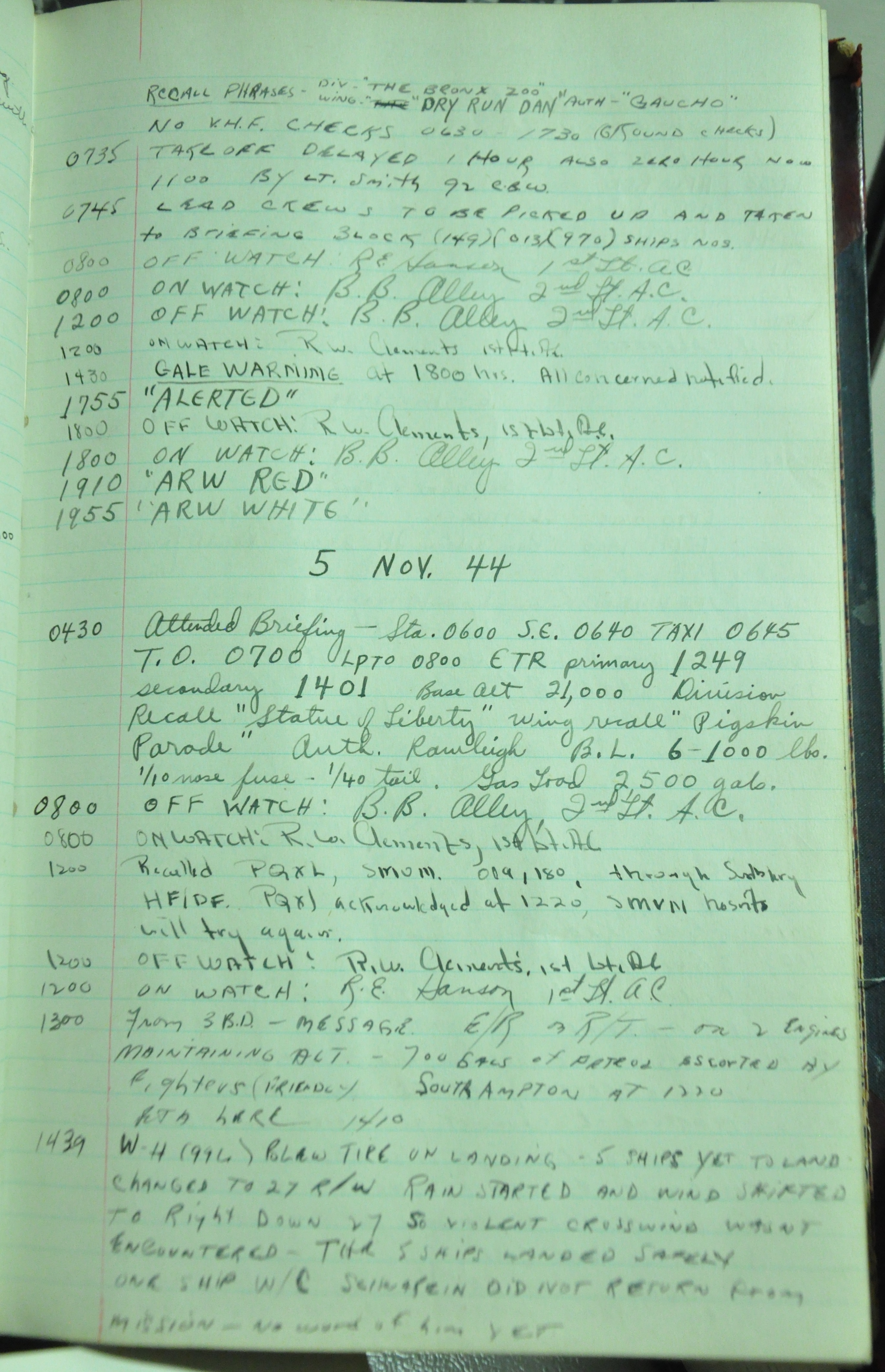 the pages of the 487th Tower Log book that is at the museum. It contains notes by the control tower officers relative to operations
