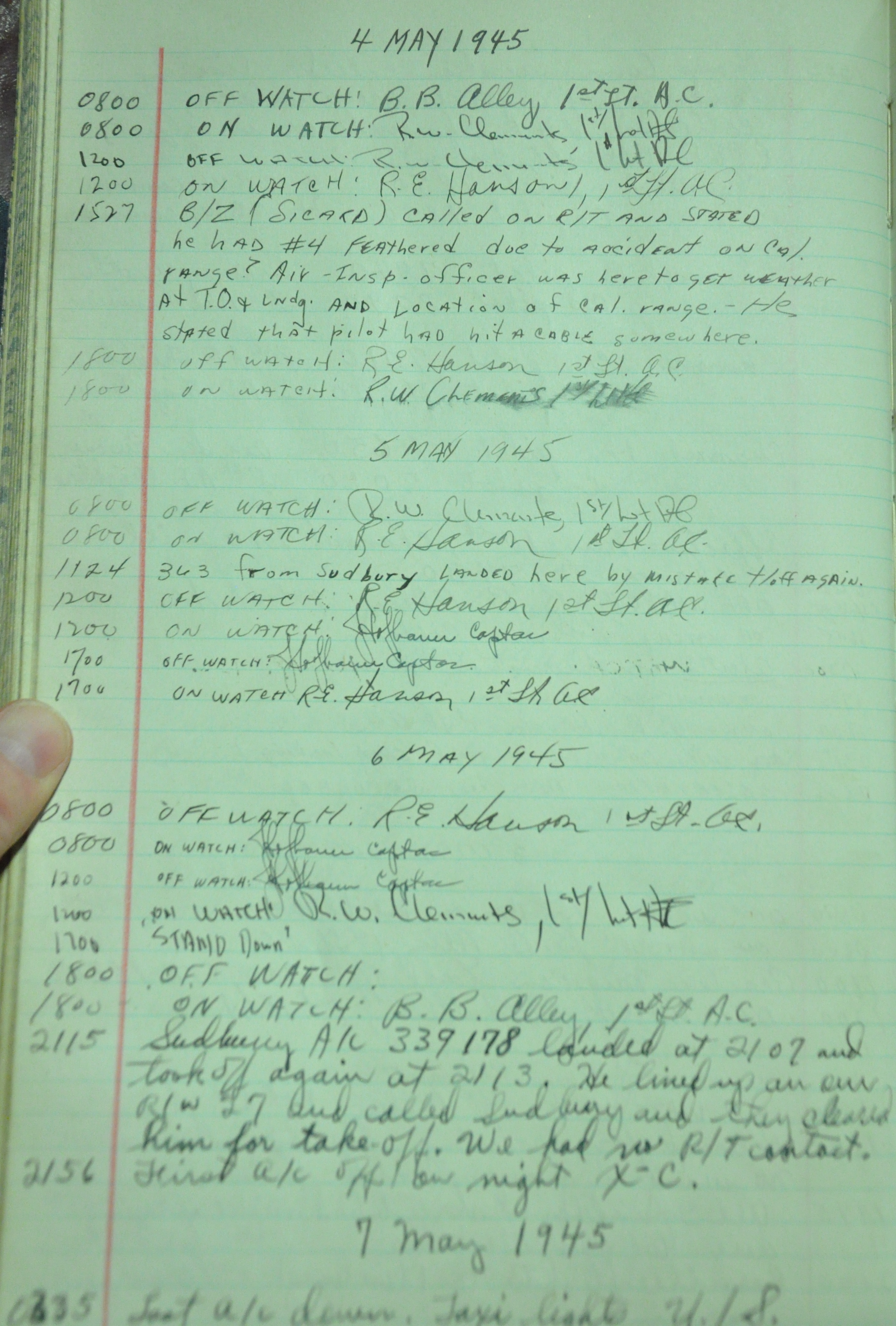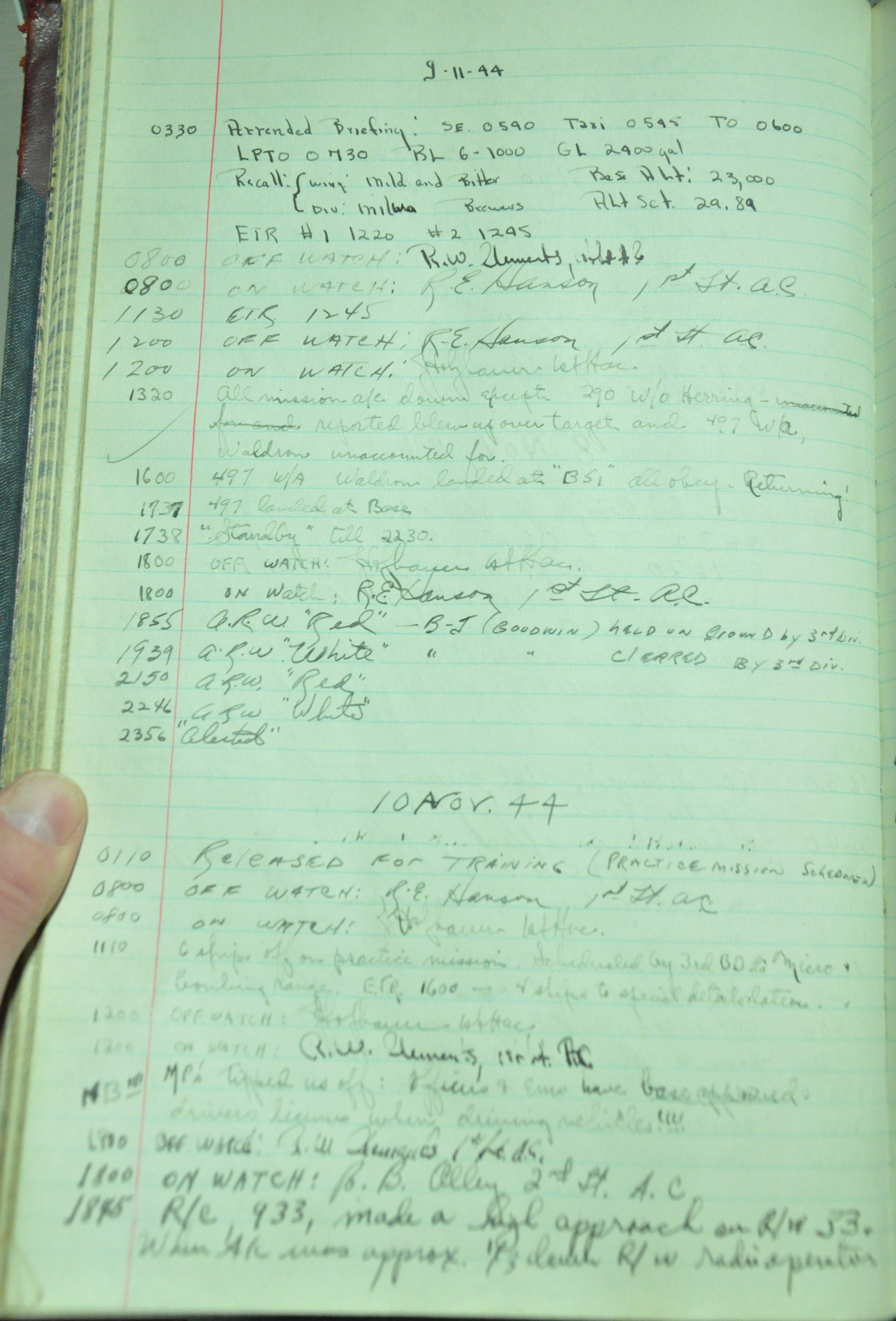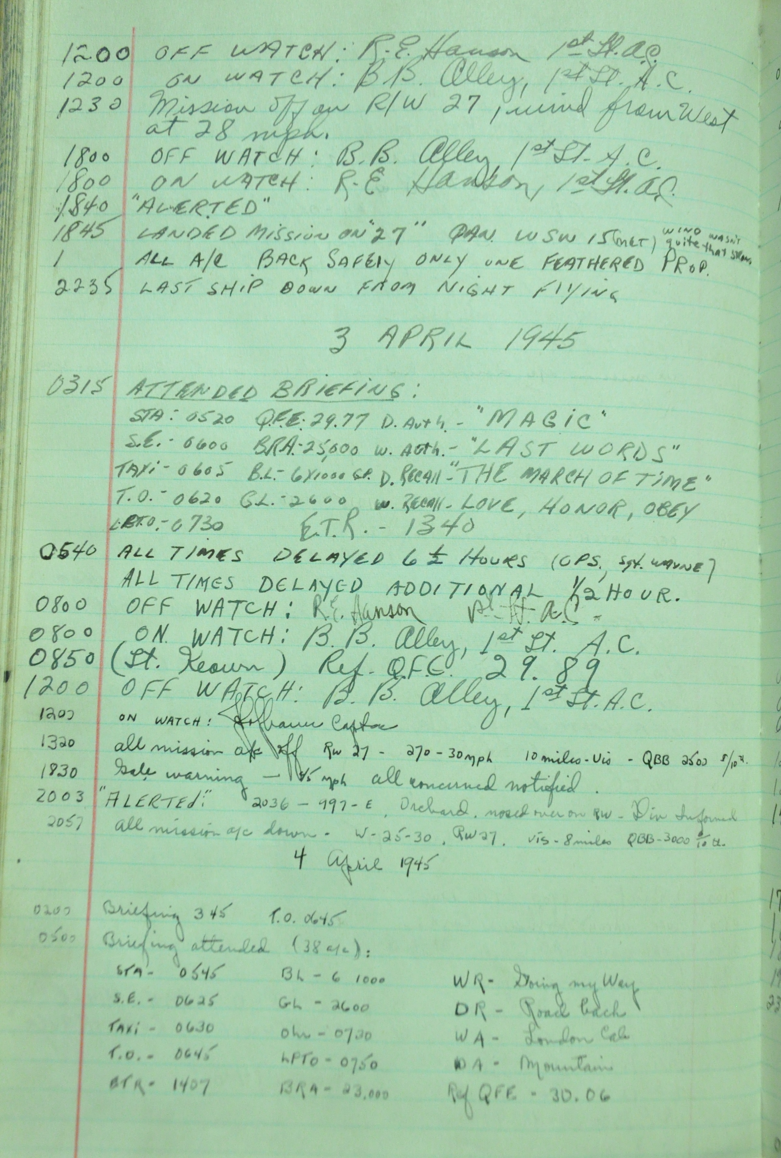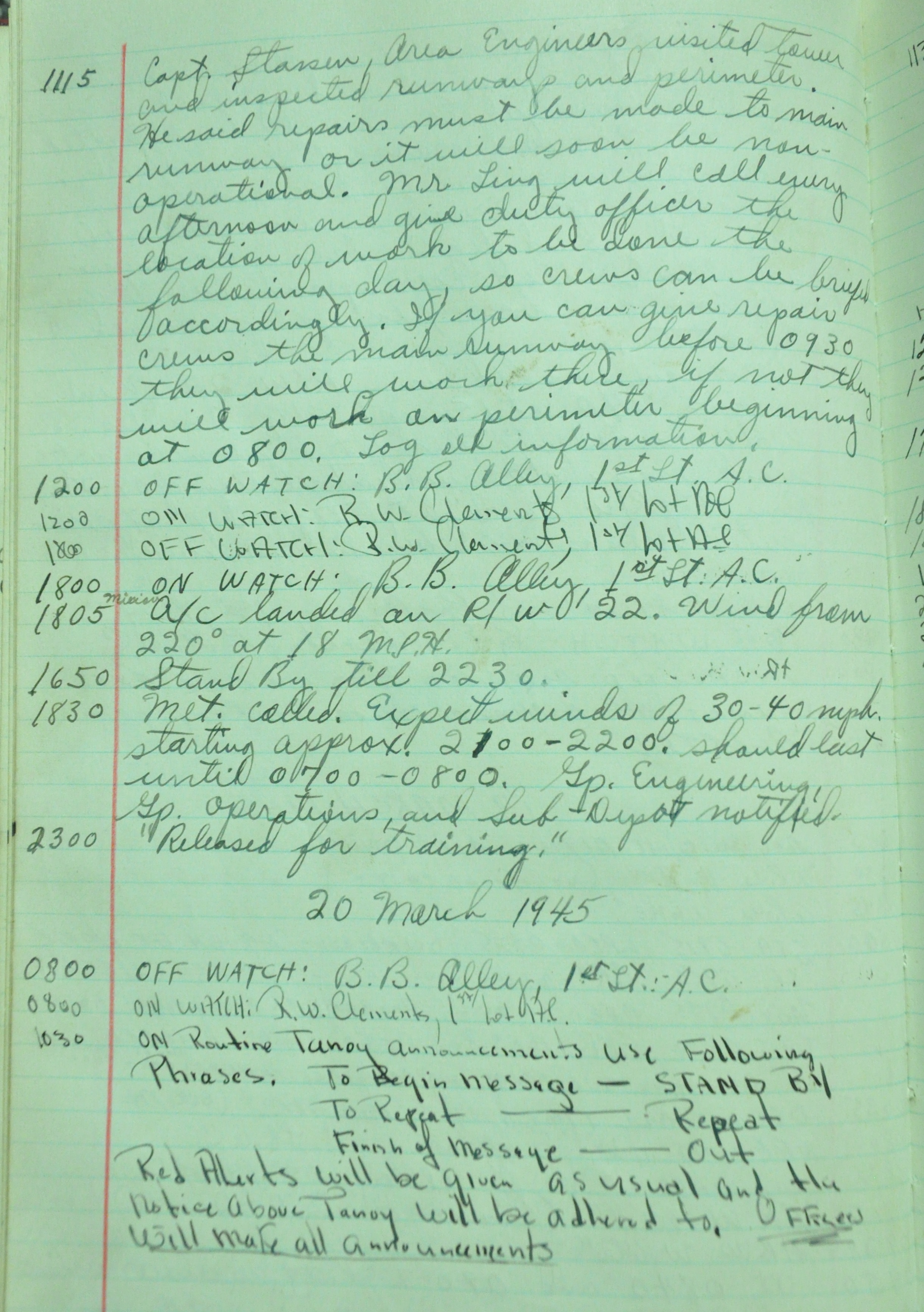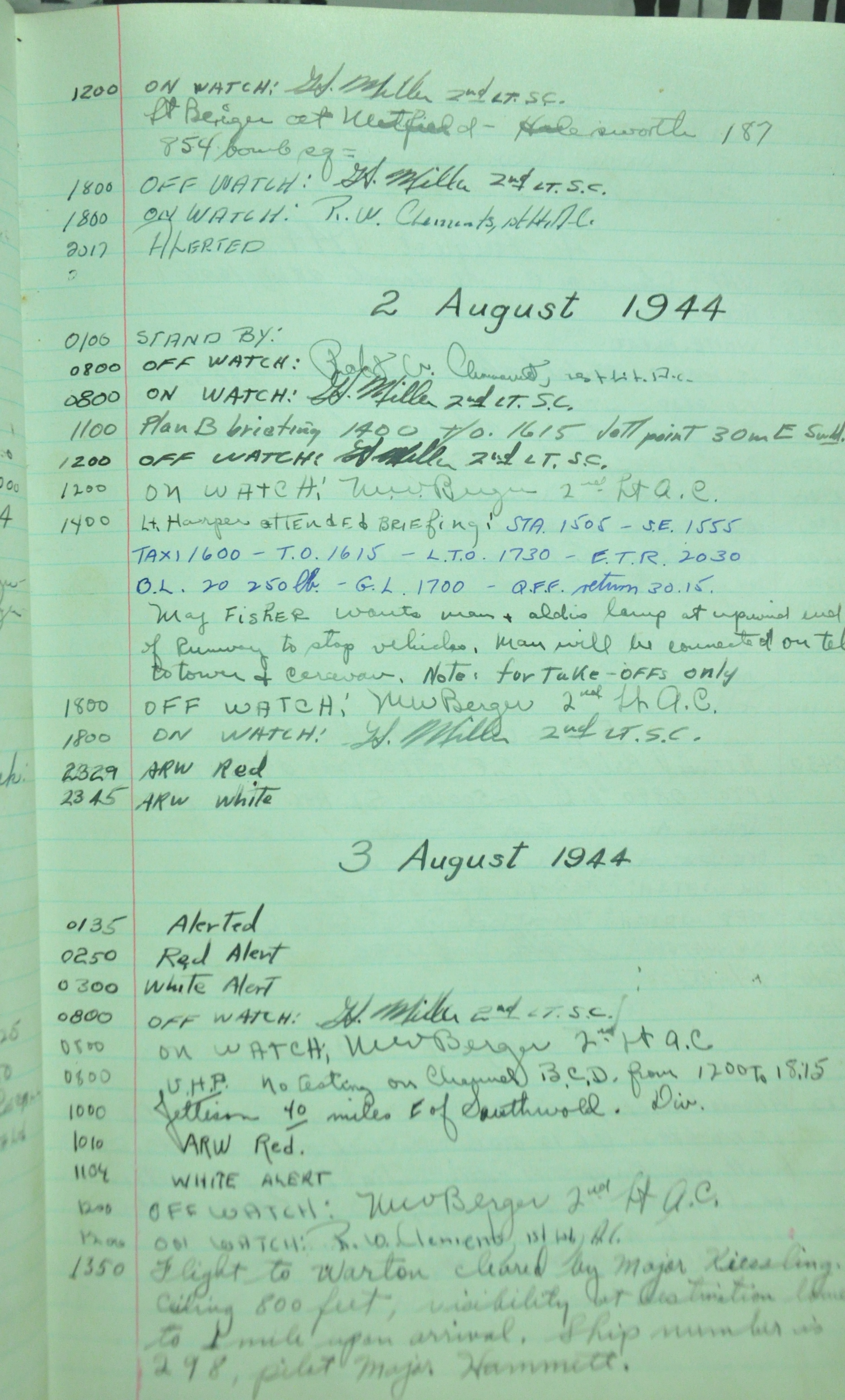 the pages of the 487th Tower Log book that is at the museum. It contains notes by the control tower officers relative to operations