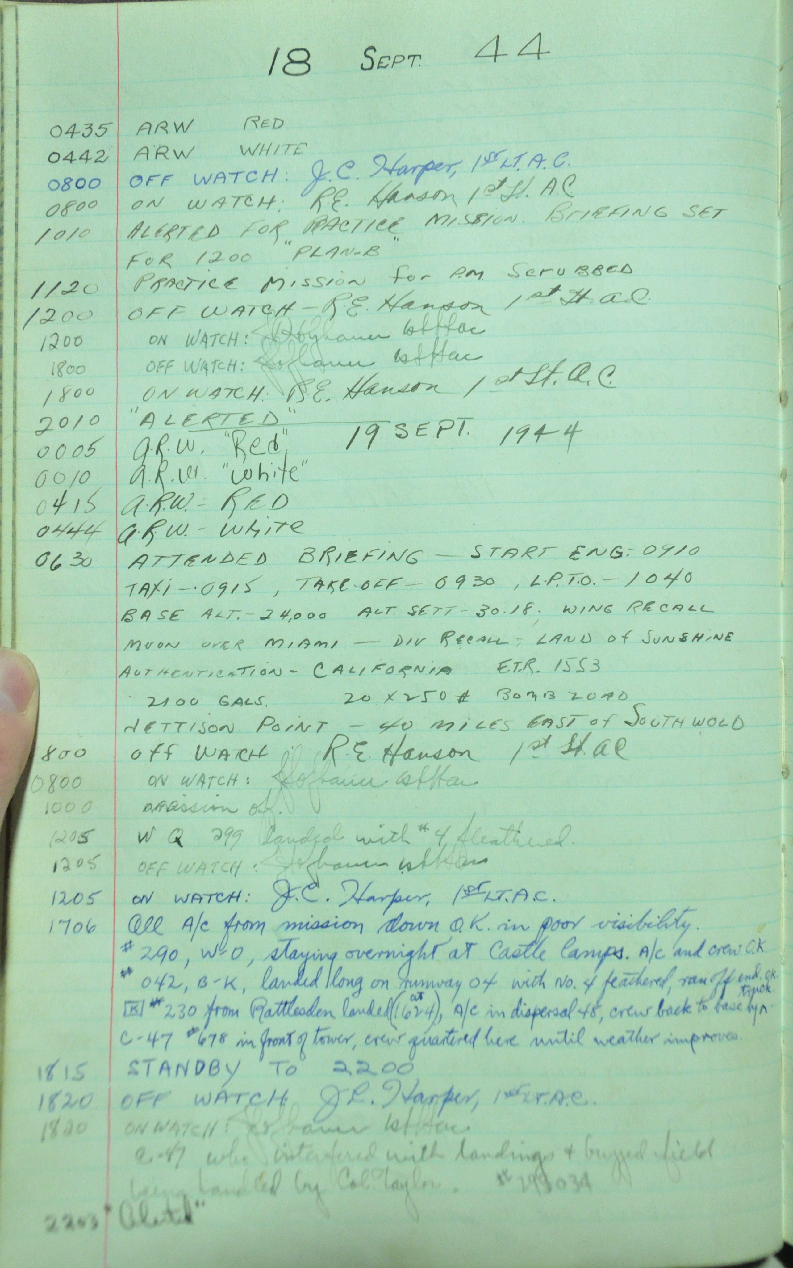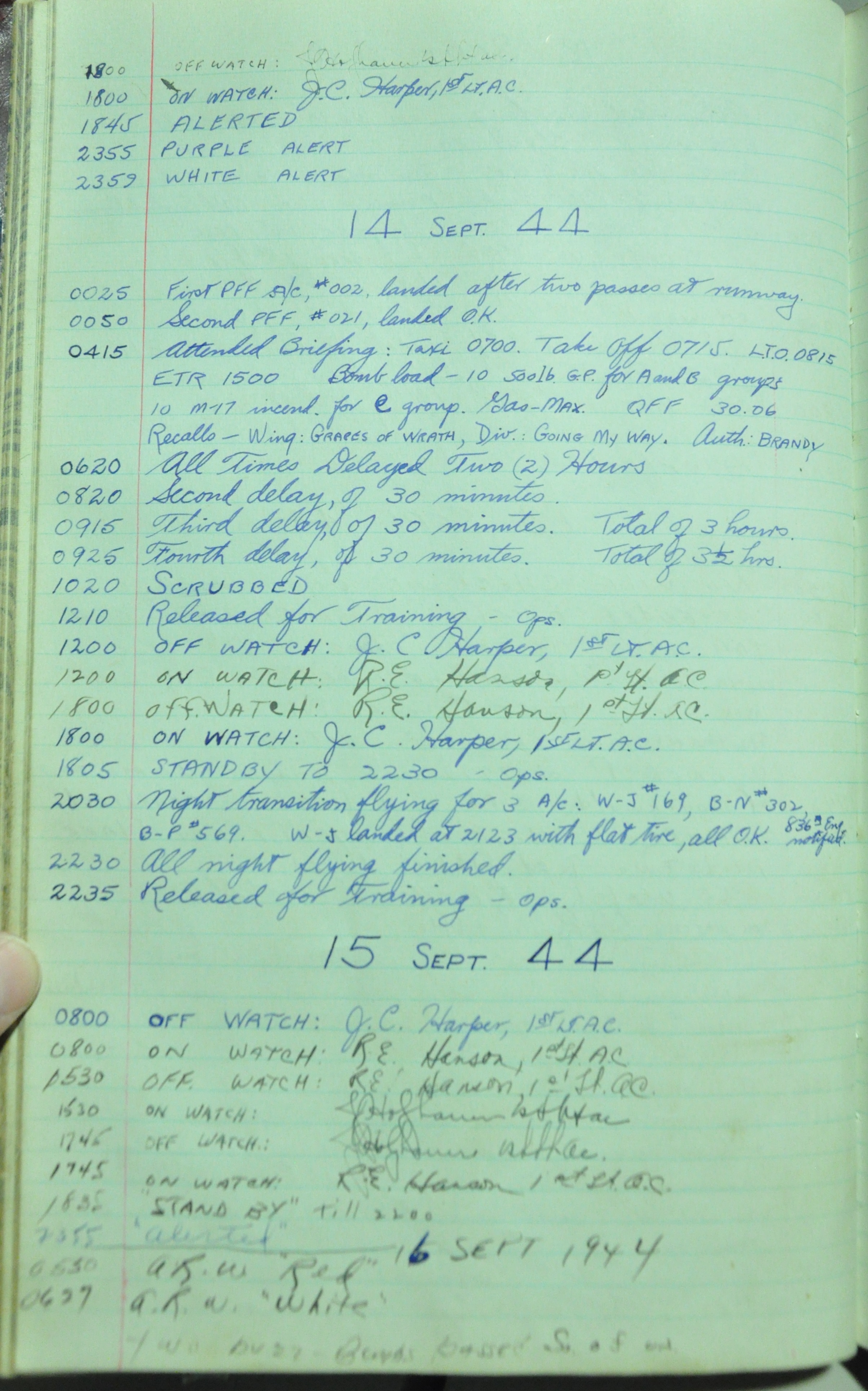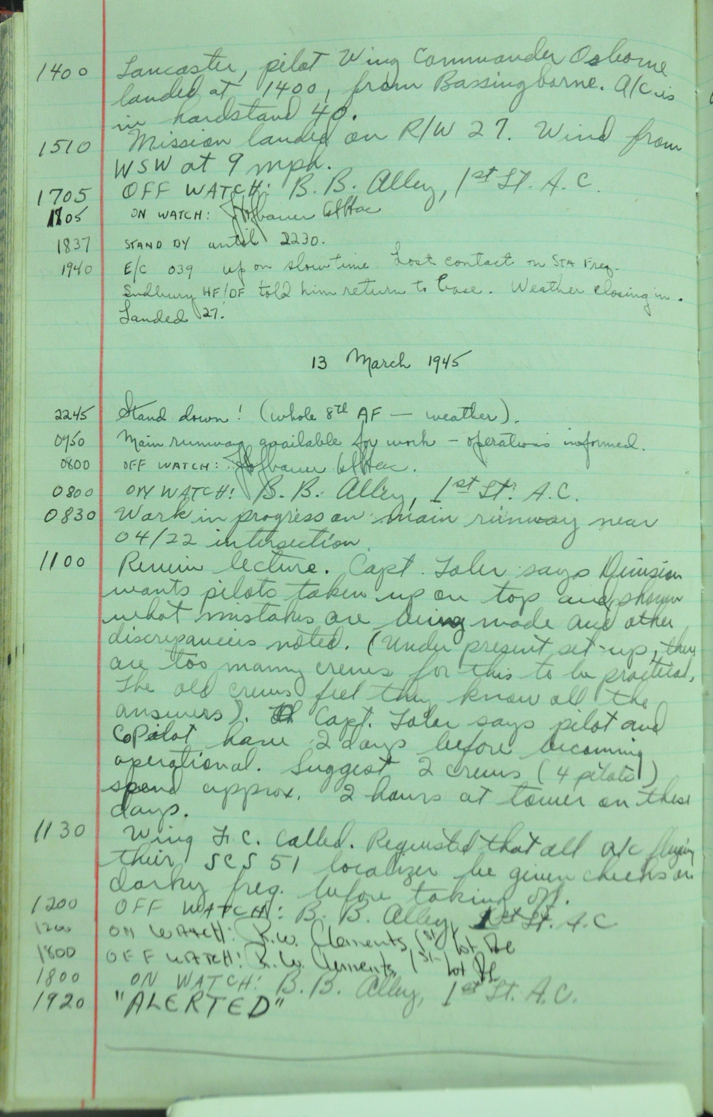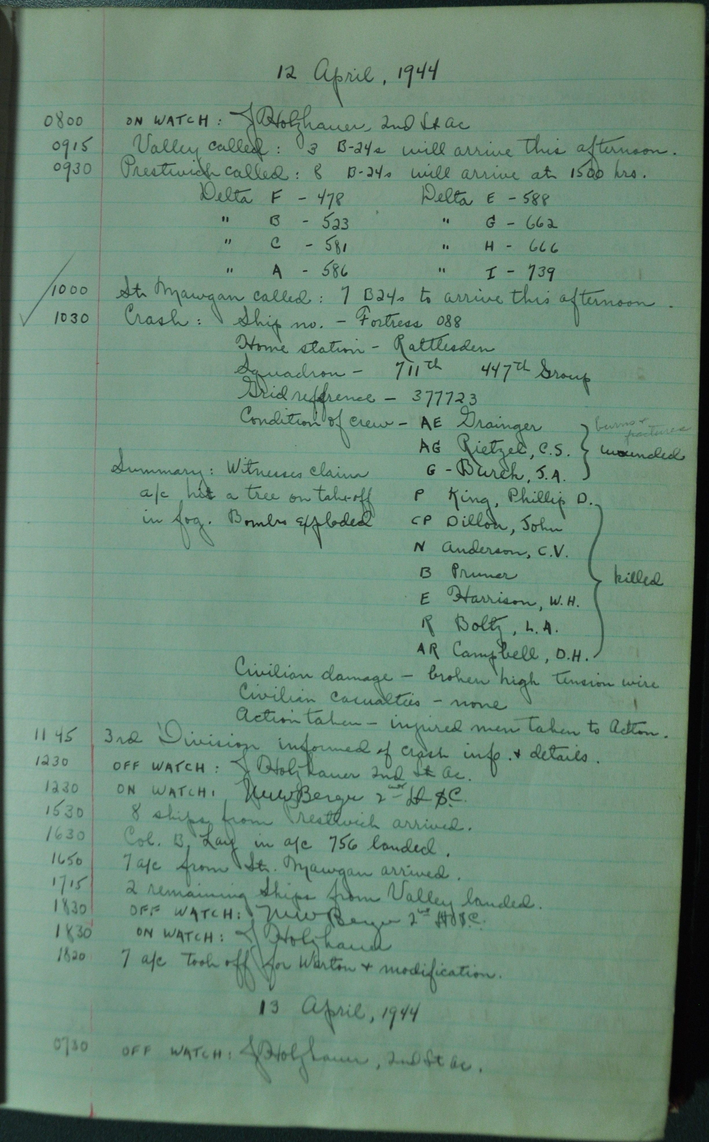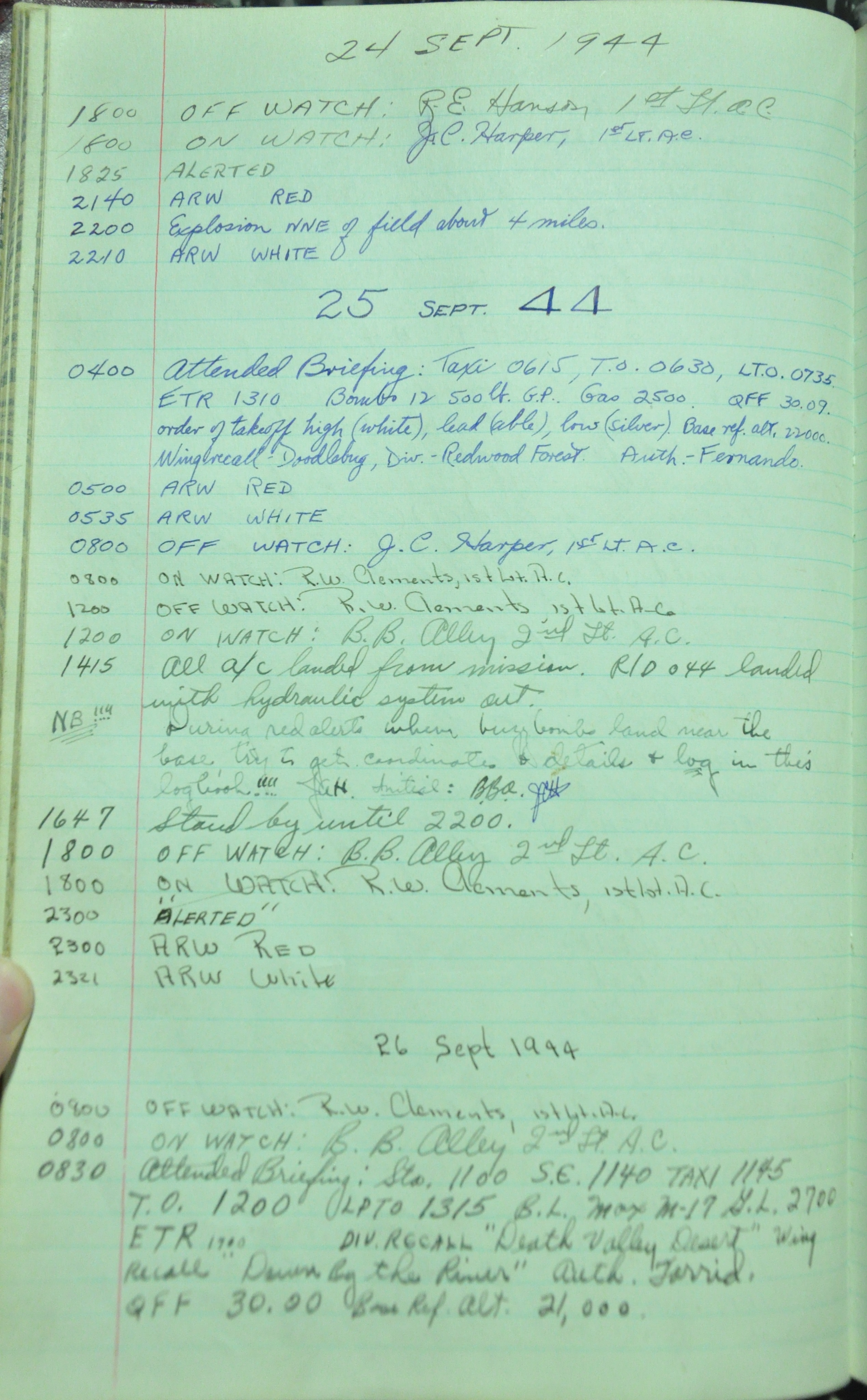 the pages of the 487th Tower Log book that is at the museum. It contains notes by the control tower officers relative to operations