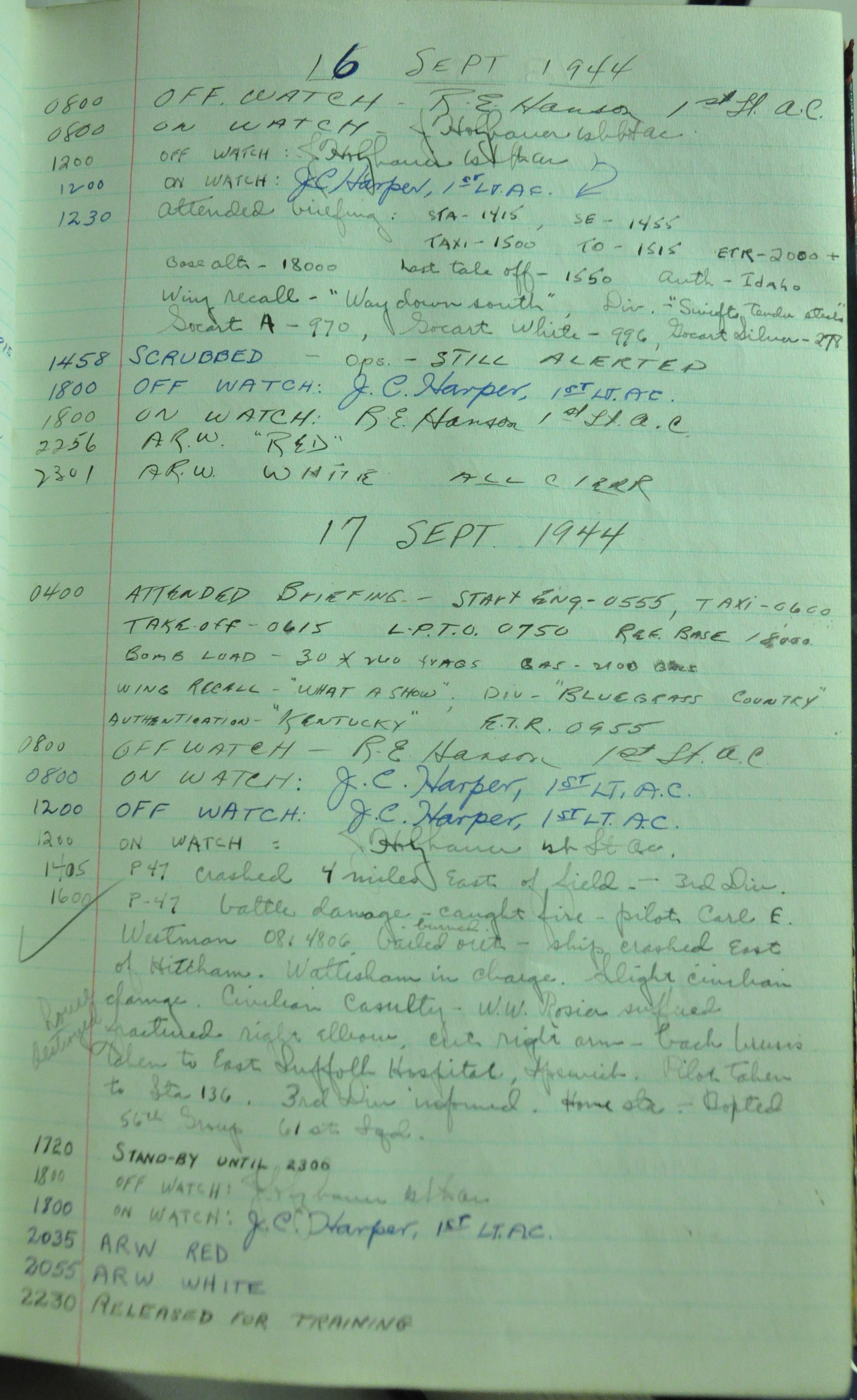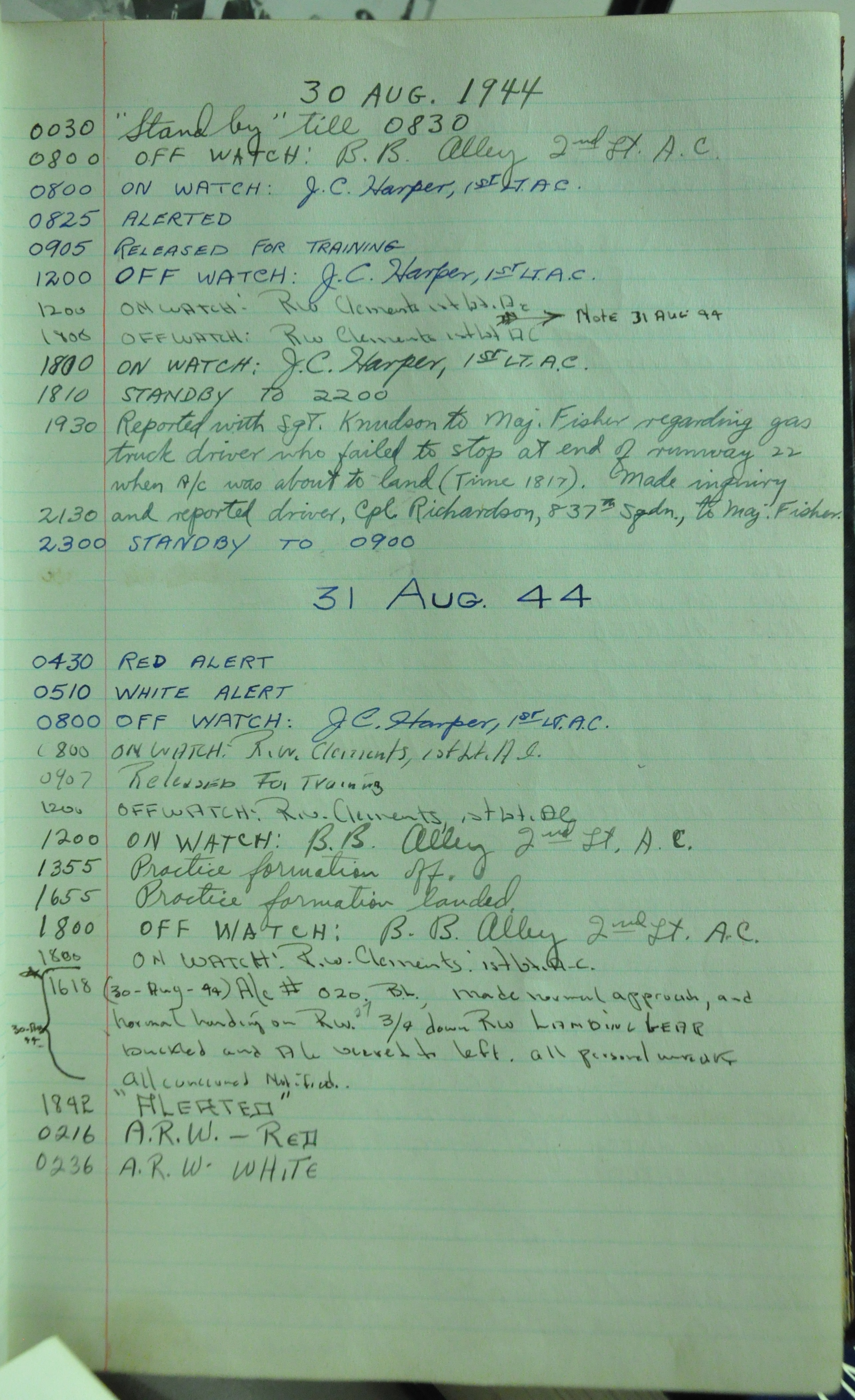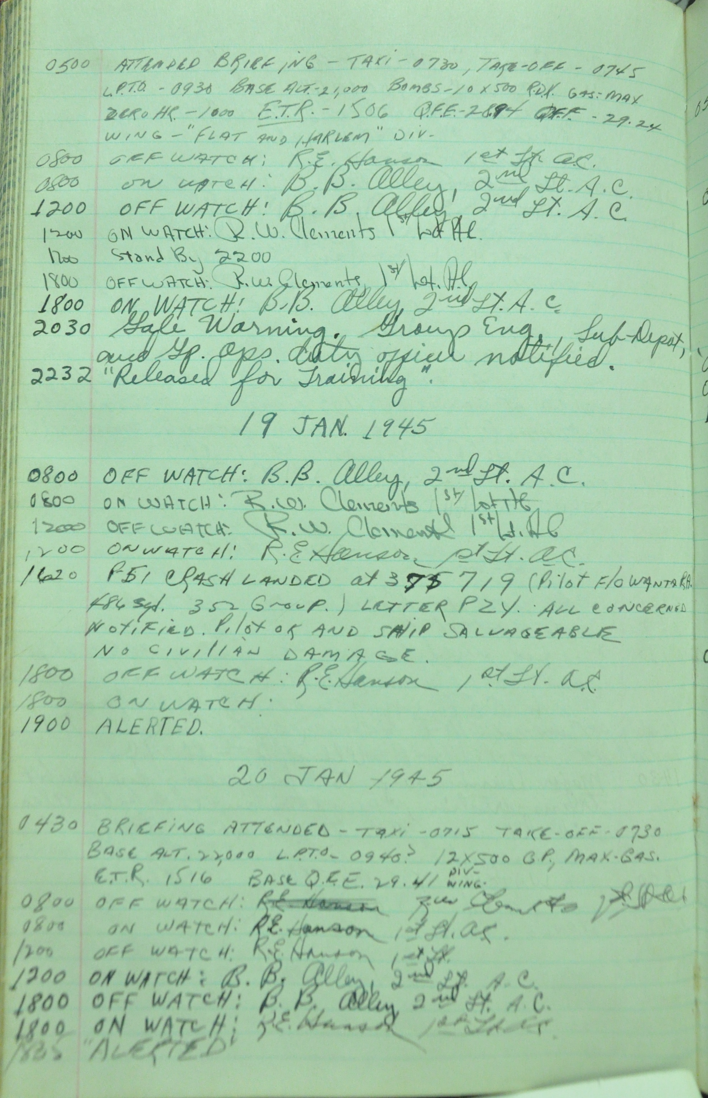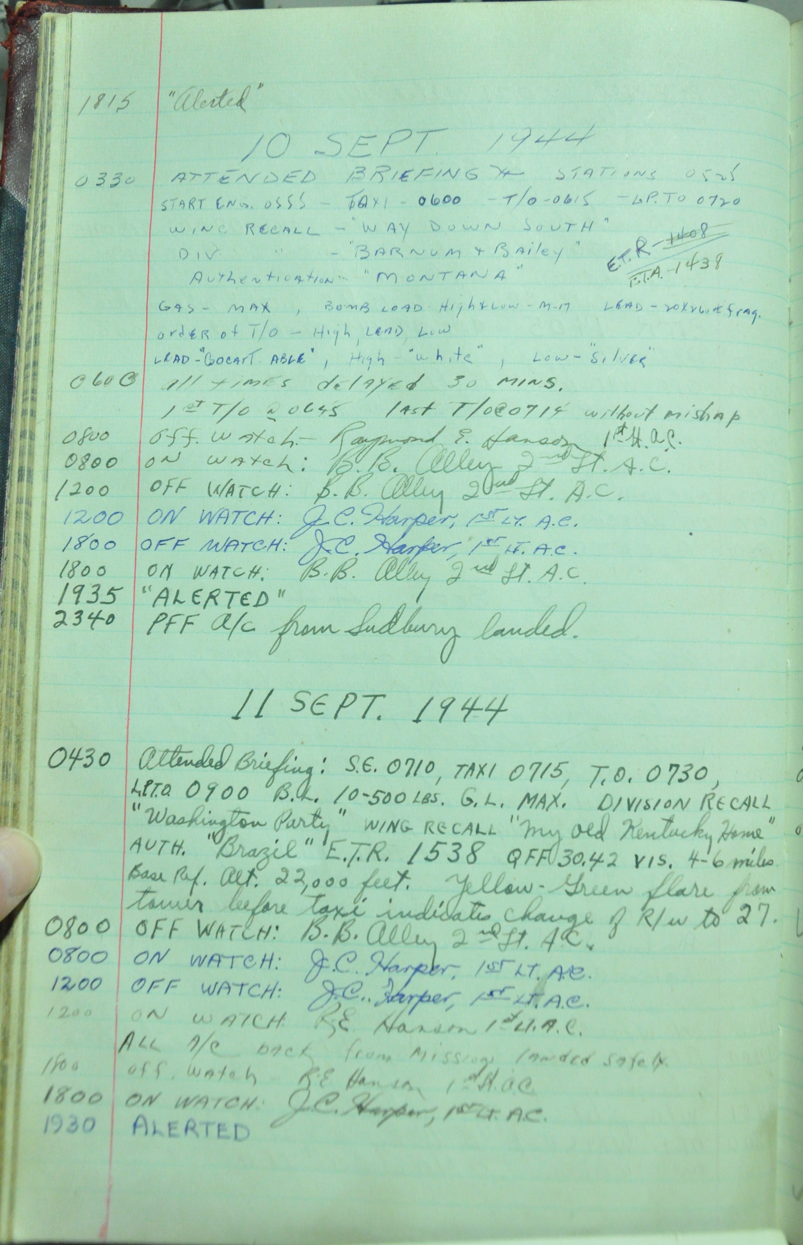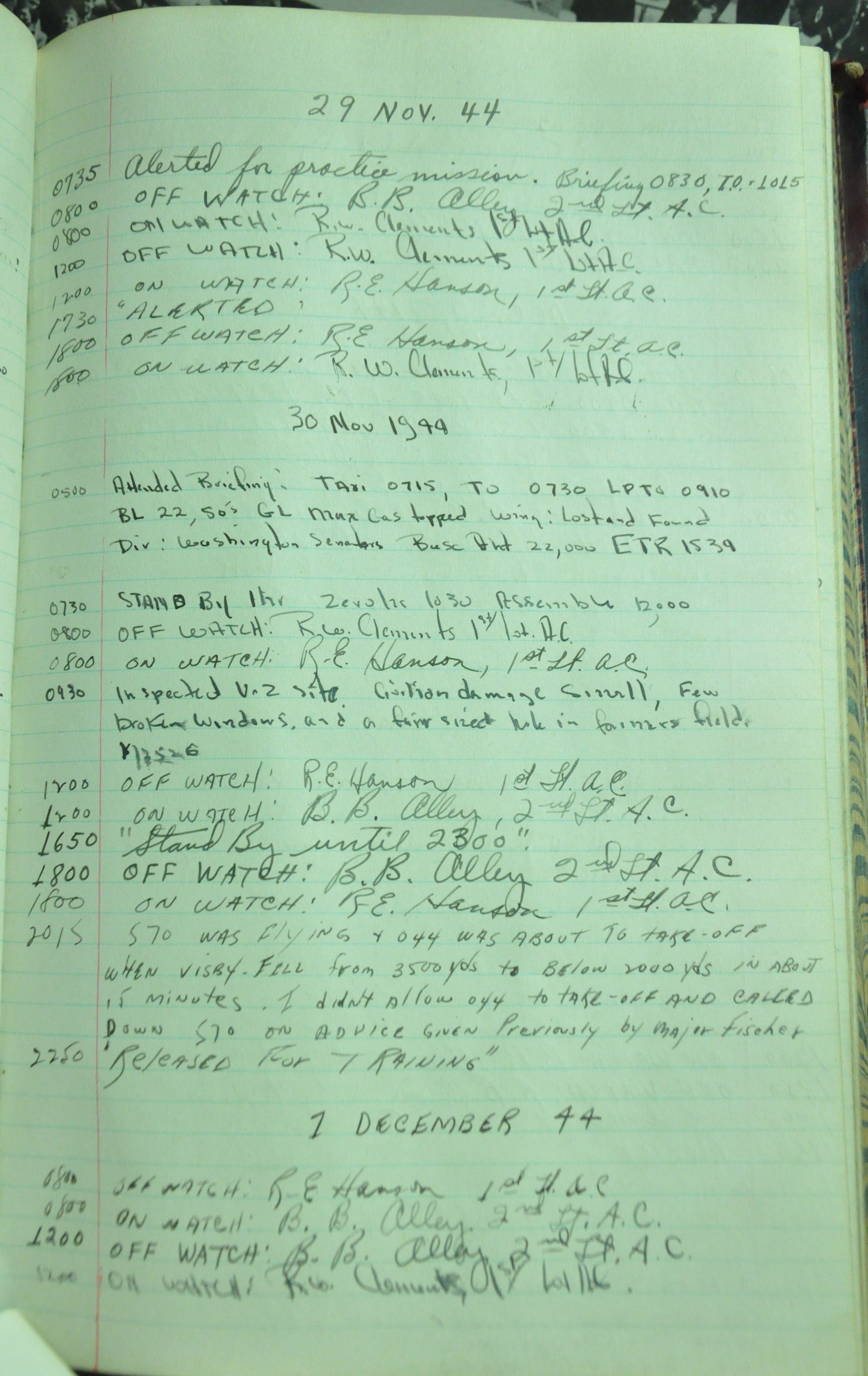 the pages of the 487th Tower Log book that is at the museum. It contains notes by the control tower officers relative to operations